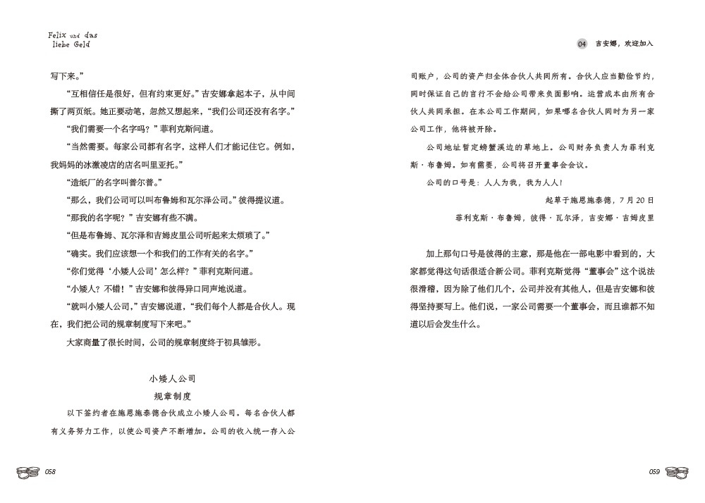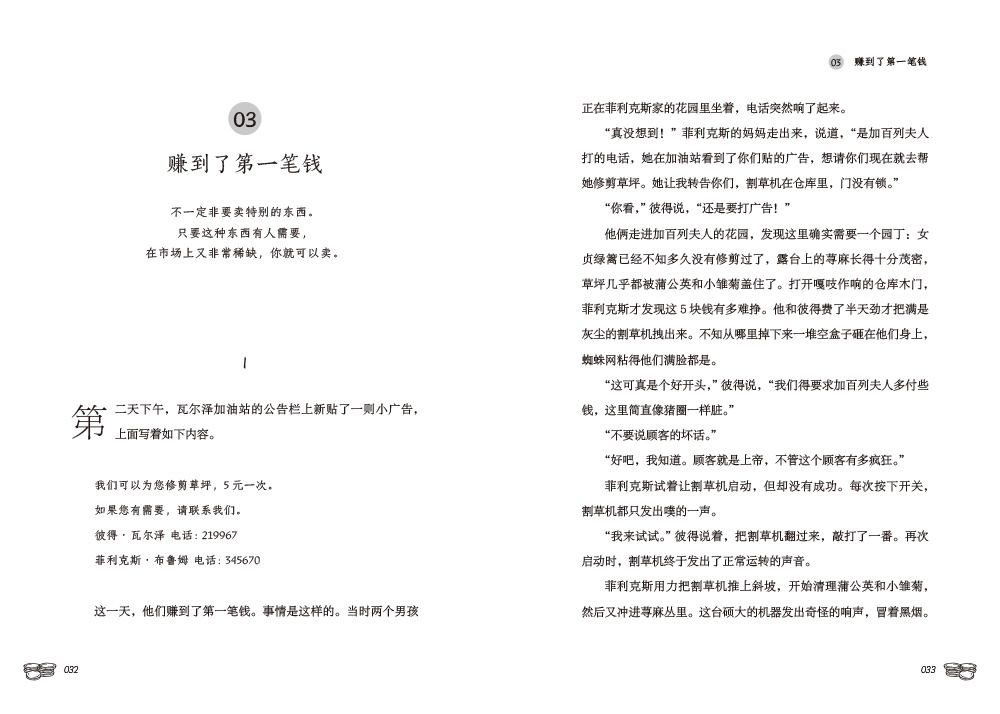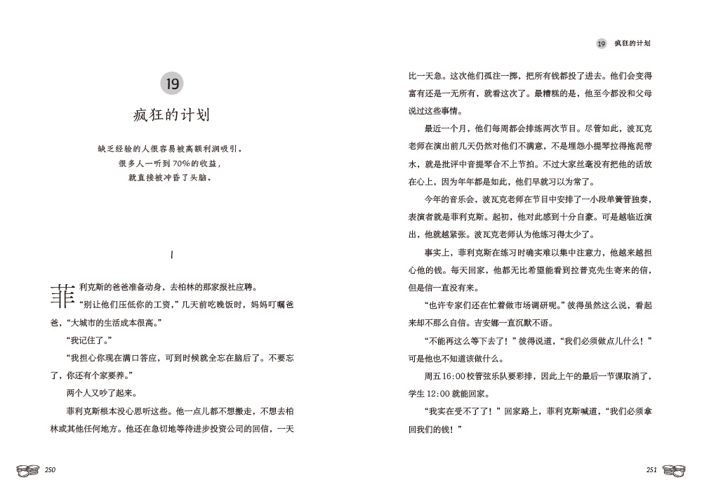 01 菲利克斯的变富计划 ??第001页 02 两个男孩的秘密基地 ??第017页 03 赚到了第一笔钱 ??第032页04 吉安娜,欢迎加入 ??第049页05 笨男孩佩佩的故事 ??第061页 06 在草地上打了一架 ??第079页07施密茨花园养鸡场 ??第092页 08 小裁缝的淘金梦 ??第106页 09 莎拉和口香糖女士 ??第120页 10 爸爸丢了工作 ??第143页11 坏消息接二连三 ??第156页 12 金币背后的秘密 ??第166页 13 要失去所有财富了? ??第173页 14 寻找交响乐团的线索 ??第188页 15 卖掉所有股票 ??第198页 16 该出手时就出手 ??第212页17 信誓旦旦的拉普克先生 ??第223页18 孤注一掷 ??第242页 19 疯狂的计划 ??第250页 20 寻找失去的财富 ??第267页21 菲利克斯被绑架了 ??第281页 22 弗里德曼先生来了 ??第301页 23 皆大欢喜 ??第311页