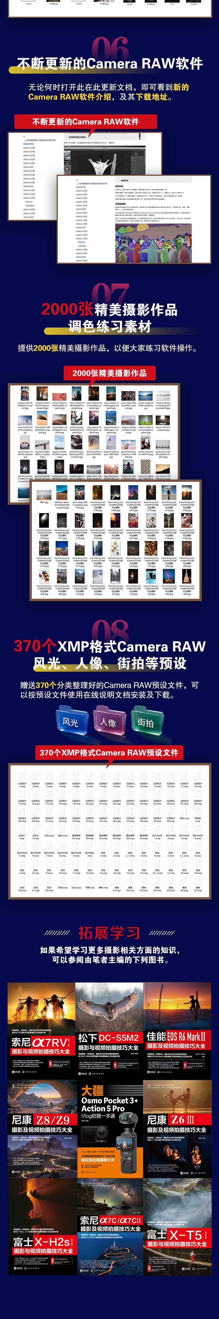 笔者在长期摄影教学工作中,经常会被问到;要修照片是用Photoshop好还是用Camera RAW软件好这个问题,因为在大部分人的认识中,Photoshop与Camera RAW是两个软件,在使用过程中,非此即彼,但实际上Camera RAW是Photoshop内置的一个插件,只是由于Camera RAW的功能过于强大,因此才会被误以为是一个独立的软件。在实际工作中,有一些简单的照片调整工具,只使用Camera RAW即可完成,但如果要做精细、复杂的选区,或要对图像的内容做合成、特效处理,就必须要使用Photoshop了。正是由于Photoshop是Camera RAW的运行;平台,且在复杂照片编修过程中两者需要相互配合,因此虽然本书的内容以讲解Camera RAW为主,但仍然需要以Photoshop十Camera RAW的形式命名。本书的理论内容非常丰富、全面,同时讲解了大量实战案例,尤其是针对国内摄影爱好者常拍摄的风光、人像、纪实、荷花等题材,展示了数十个相关案例的完整调修过程。通过学习本书不仅能够在照片调修的思路有所提高,更能够掌握Photoshop软件及Camera Raw软件在照片处理方面的功能及实战技能,更快更好地调出佳片。下面是本书的具体内容介绍。在理论方面,本书第1章从后期处理的流程与误区开始,然后再讲解RAW格式的基本概念,从宽容度、色彩深度、无损编修、兼容性、软件功能限制、降噪处理、照片大小、调整范围以及物理属性等多角度、多维度地深入剖析了RAW格式的特点与局限性,让读者对其有一个清晰、透彻的认识,从而更好地把握照片处理的基本思路,为后面的实践做好充分的准备。本书第2章讲解了Camera Raw的工作界面、裁剪和几何工具、移去工具、防红眼工具、预设、直方图、图像设置等基础功能和工具的使用方法。本书第3章讲解了在Camera Raw中,调整图像亮度与细节相关的调整面板功能,以及;亮;效果;曲线;细节;光学;镜头模糊和;HDR调整面板的使用方法与技巧。本书第4章讲解了在Camera Raw中,调整图像颜色相关的调整面板功能,以及;颜色;混色器;颜色分级和;校准调整面板的使用方法与技巧。本书第5章讲解了Camera Raw中;主体;天空;背景;物体;人物;色彩范围;亮度范围;画笔;径向渐变和;线性渐变蒙版功能的用法与使用技巧。第2章~第5章所讲解的这些功能,是使用Camera Raw调整照片时常用到的功能,按照本书的讲解结构学习,读者能够知道在修饰照片时如何使用相应的功能,使照片达到自己想要的效果。本书第6章~第8章为实操案例讲解,内容为使用Camera Raw和Photoshop软件处理写真人像、纪实人像、街拍和风光照片的操作方法。读者能够在这些典型案例中,综合运用到前半部分所讲解功能的用法与技巧。虽然,本书讲解与示例最多的软件是Camera RAW,但毫无疑问在处理照片方面,如果选择区域较为复杂、精细,或要对图像做除调整颜色外的其他类型的编辑,仍然需要使用Photoshop本身的功能参与操作,因此大家在学习时切不可认为只要掌握好Camera RAW软件即可,更不能养成完全依赖于Camera RAW软件进行照片颜色调整的惯性,而是要根据编辑加工的照片类型合理地综合运用Camera RAW与Photoshop。为此,笔者也将赠送一门讲解Photoshop操作的在线视频课程,来帮助大家提高软件操作技能。除了上述的赠课外,笔者还将随书赠送一门讲解Camera RAW软件使用与实战的在线视频课程,以及一门专门讲解荷花摄影题材照片后期处理的课程,以上三门在线视频课程的时长合计超10小时,极大地扩展、补充了图书内容。