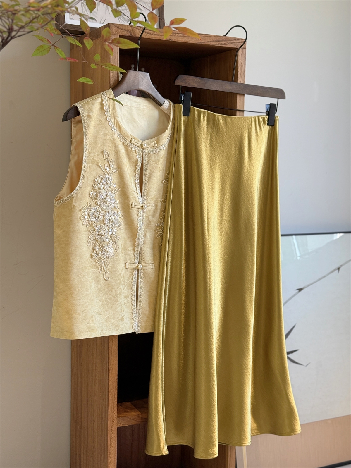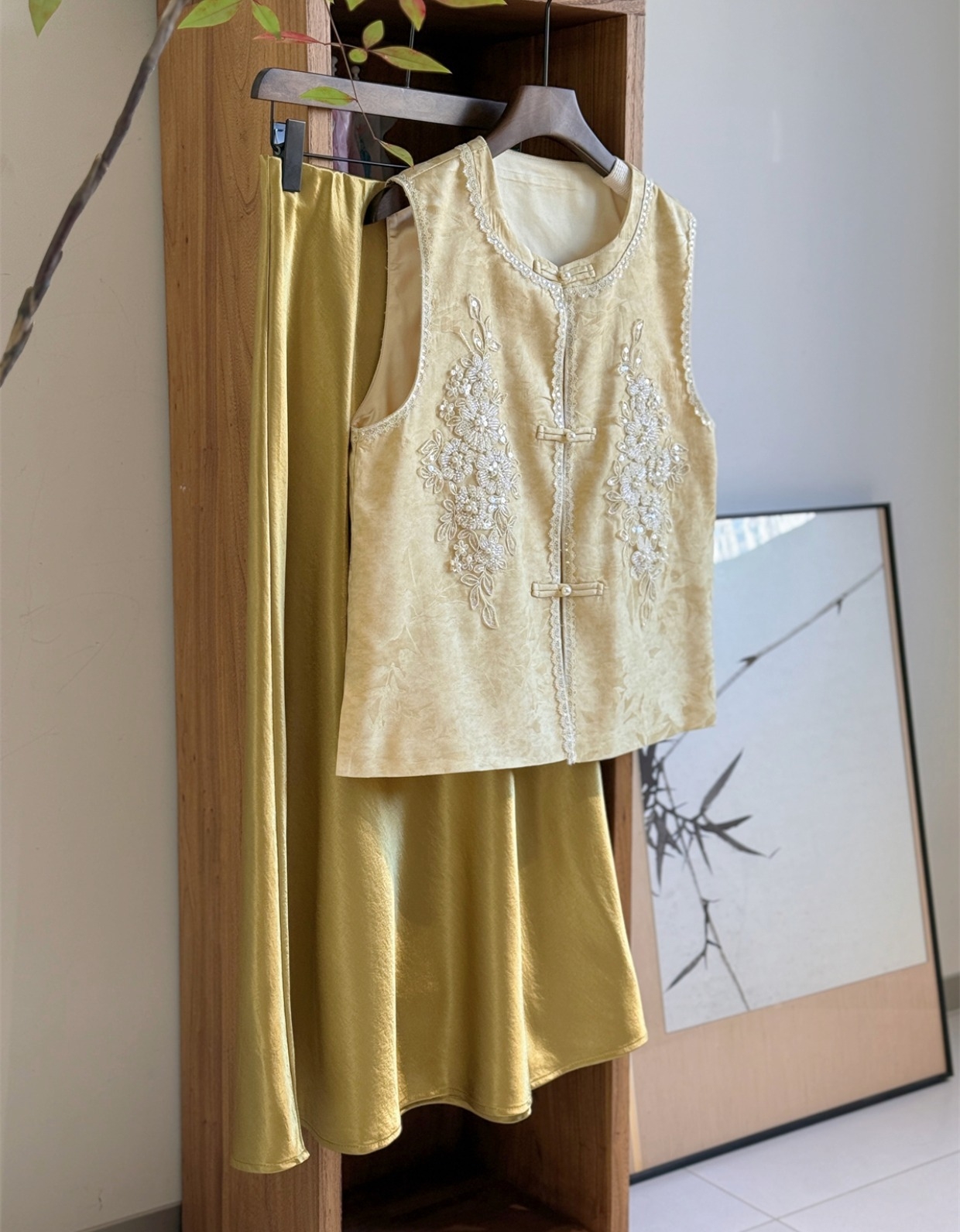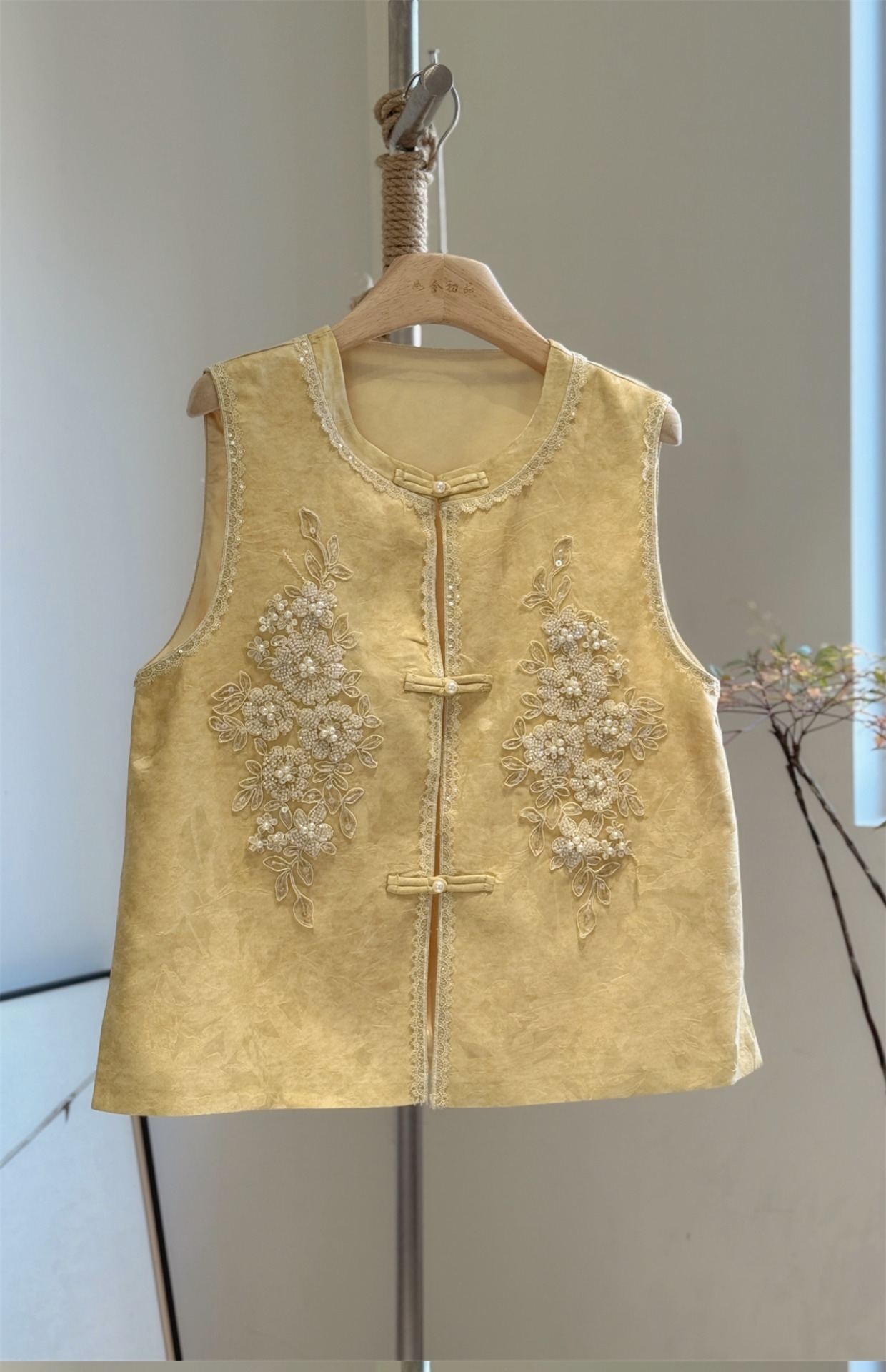 气质国风系列~重工订珠提花马甲,想要低调又不失精致感的中式外套,这款很是推荐,百搭不出错,浅黄色很显肤白~衬肤色,特别适合夏天的季节宽松直筒版型,胖瘦的体形都很好驾驭。前襟二侧设有定位重工立体订珠+花朵剌绣图案花朵由不同绣线、串珠、亮片及珍珠等配饰,手感很轻、很软。
