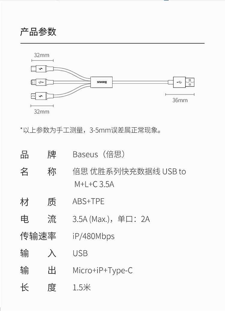 倍思 优胜系列快充数据线USB to M+L+C 3.5A 1.5m