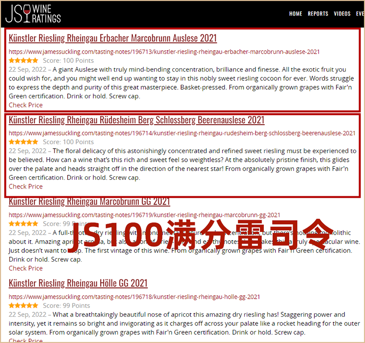Kunstler也是莱茵高声名显赫的“雷司令王”,Erbacher Marcobrunn Auslese 2021及Rüdesheim Berg Schlossberg Beerenauslese均获JS100满分及多个99准满分,2002年份Hochheimer Hölle Goldkapsel trocken也曾获Wein-Plus 100满分,2009年份Hochheimer Hölle Riesling Kabinett trocken则以全五星满分入围Decanter“德国酔好珍藏雷司令”。