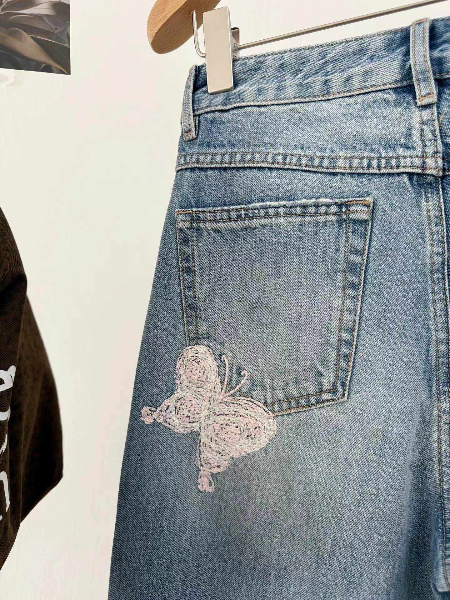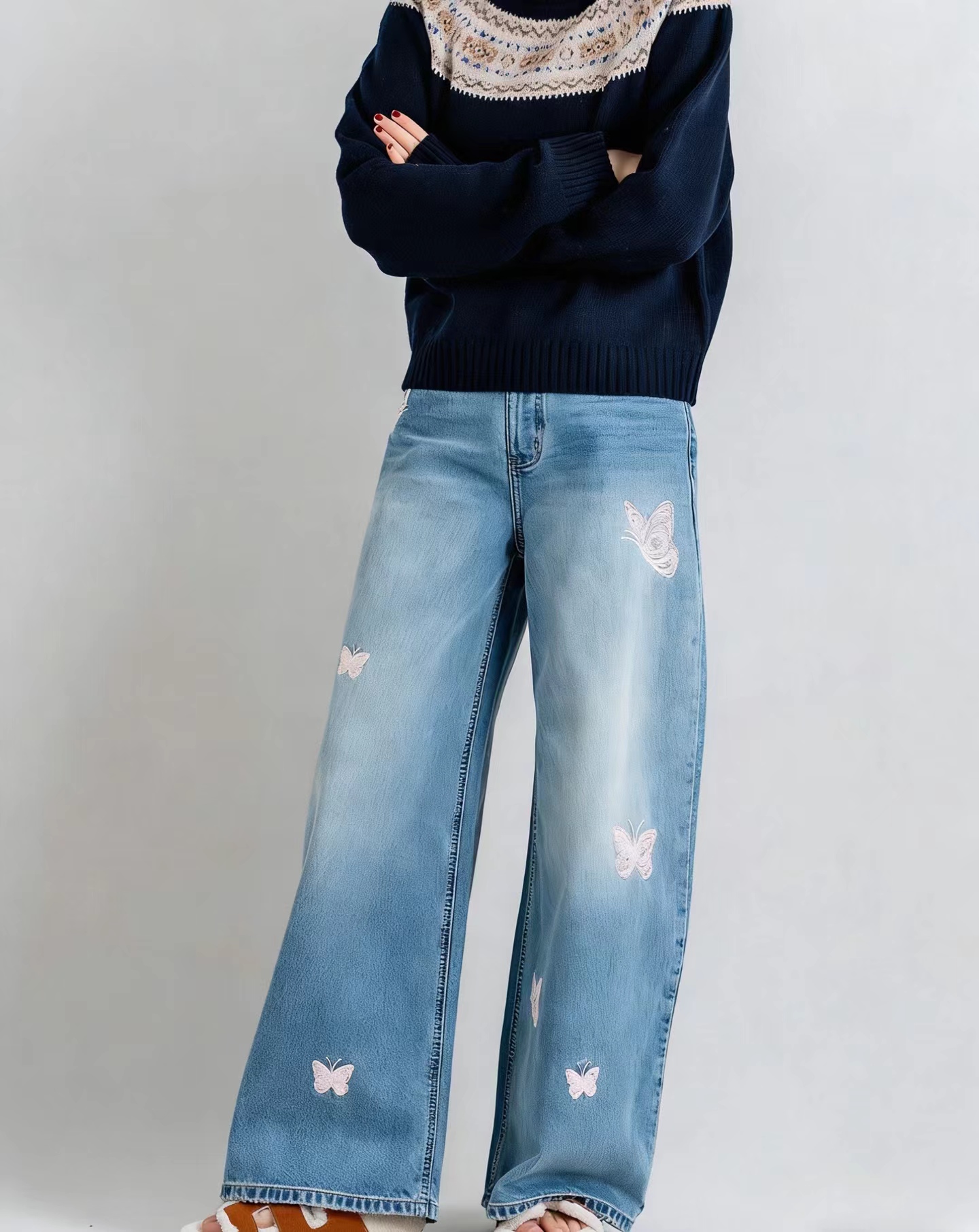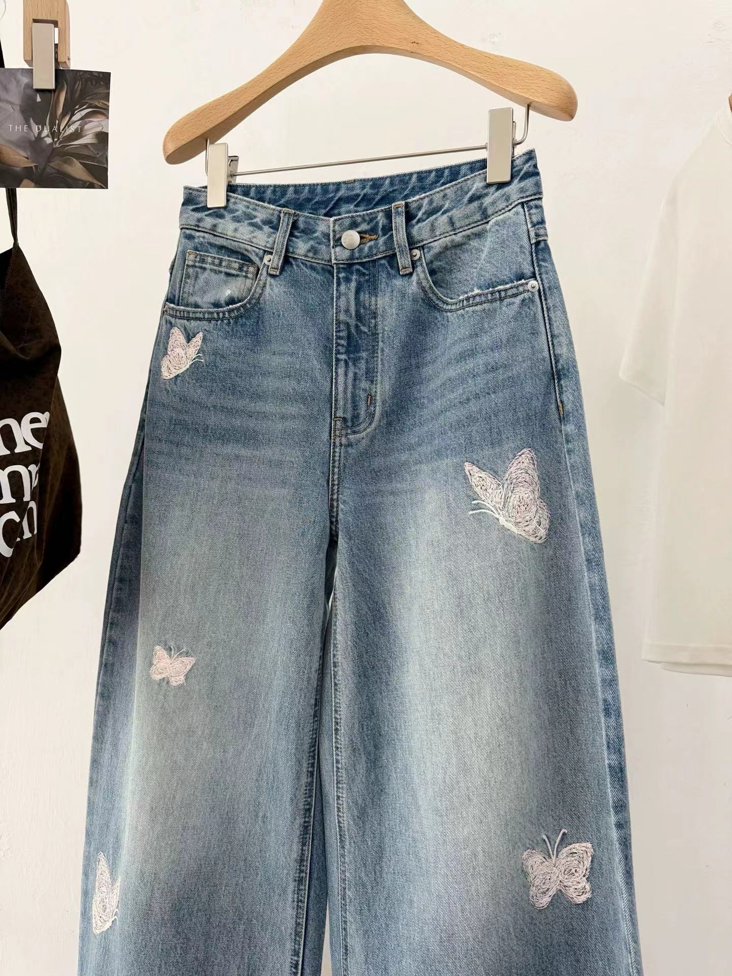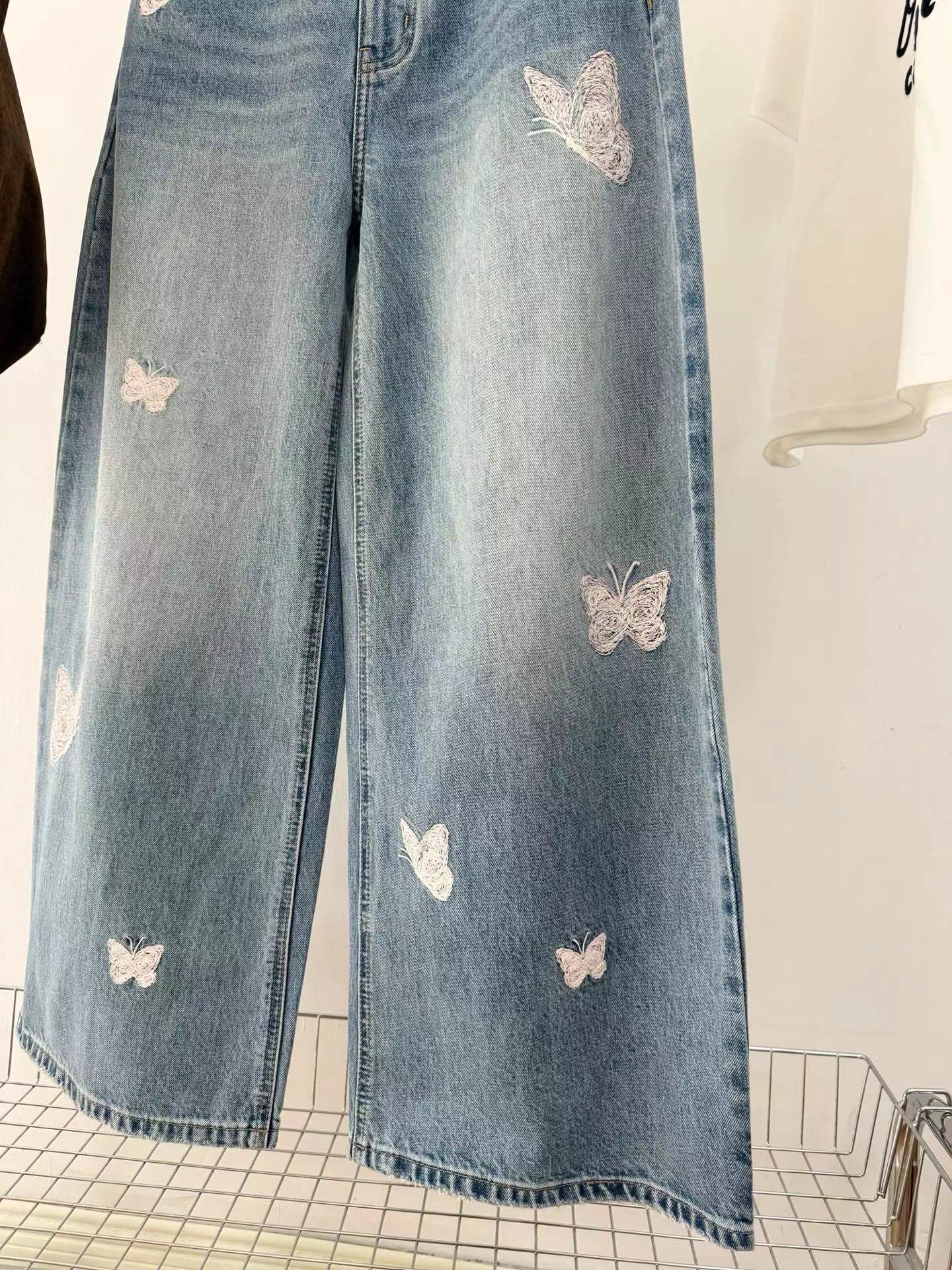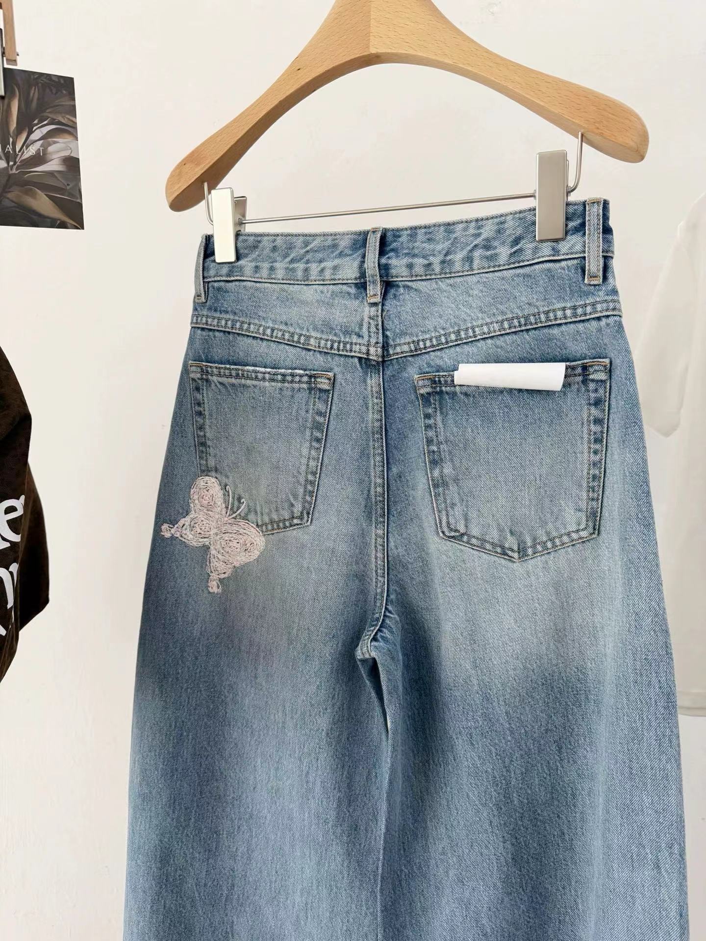 重工刺绣蝴蝶结 高品质浅蓝色宽松阔腿牛仔裤女春季拖地长裤,?? 把春天的蝴蝶绣在牛仔上 复古提花毛衣的软糯,遇上渐变牛仔的随性,每一只蝴蝶刺绣,都像藏在衣料里的小浪漫。宽松阔腿版型,走路带风,也藏得住所有不开心