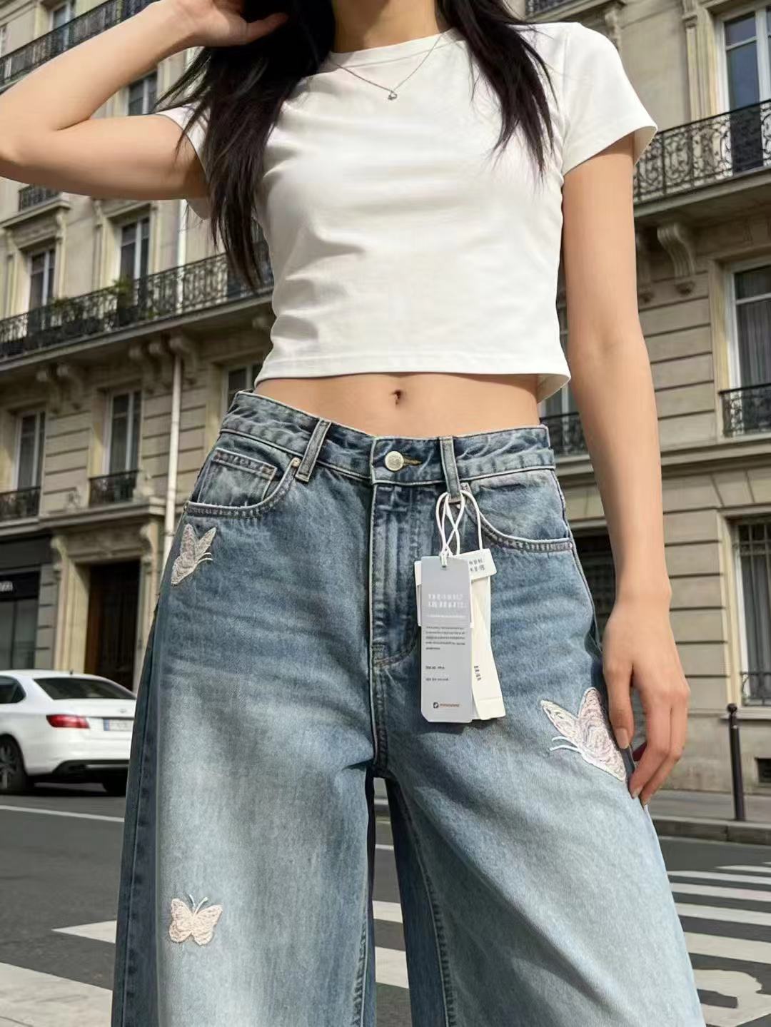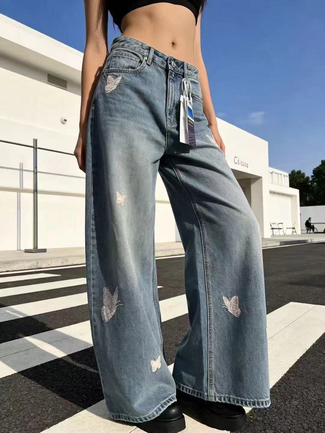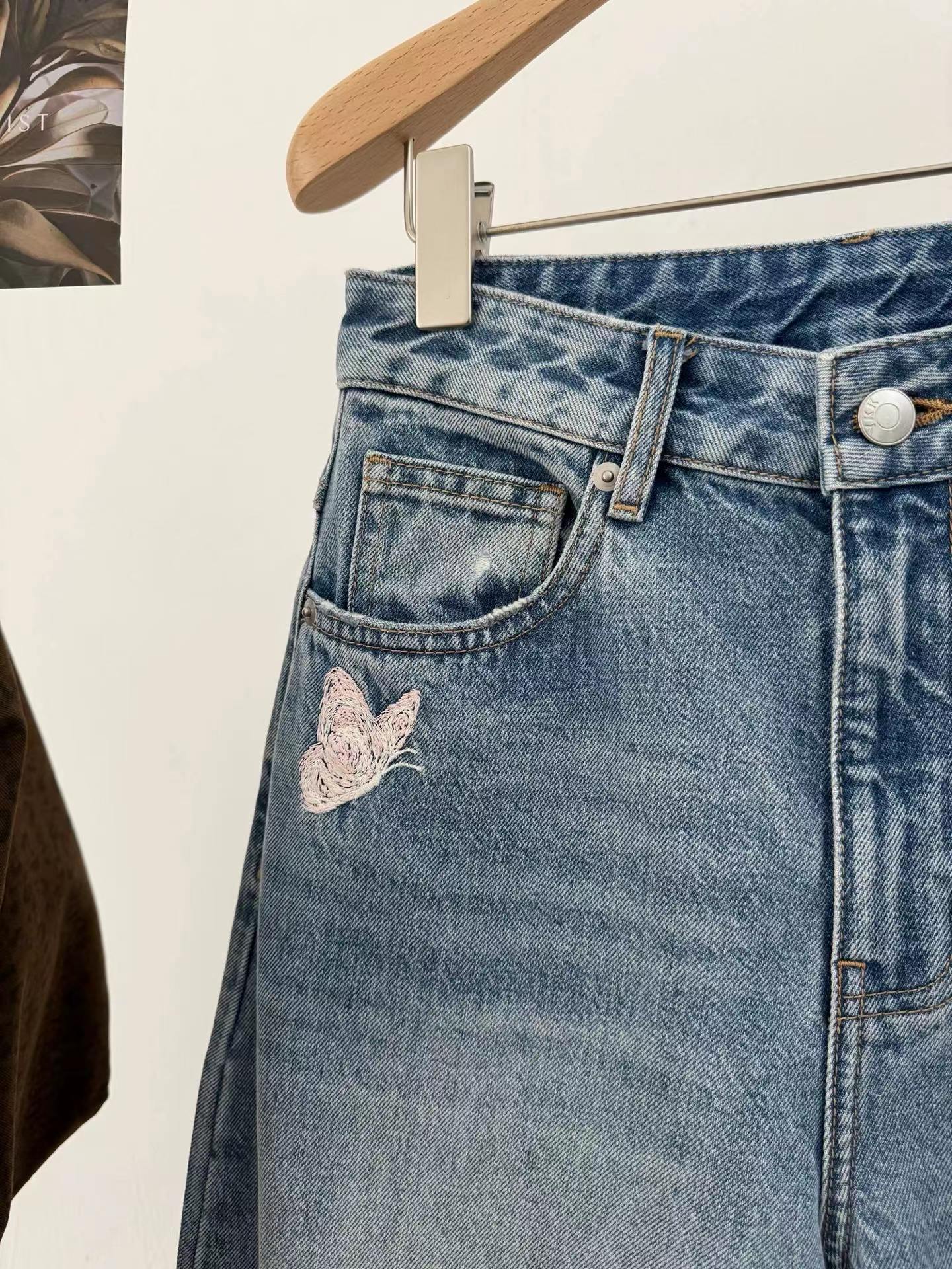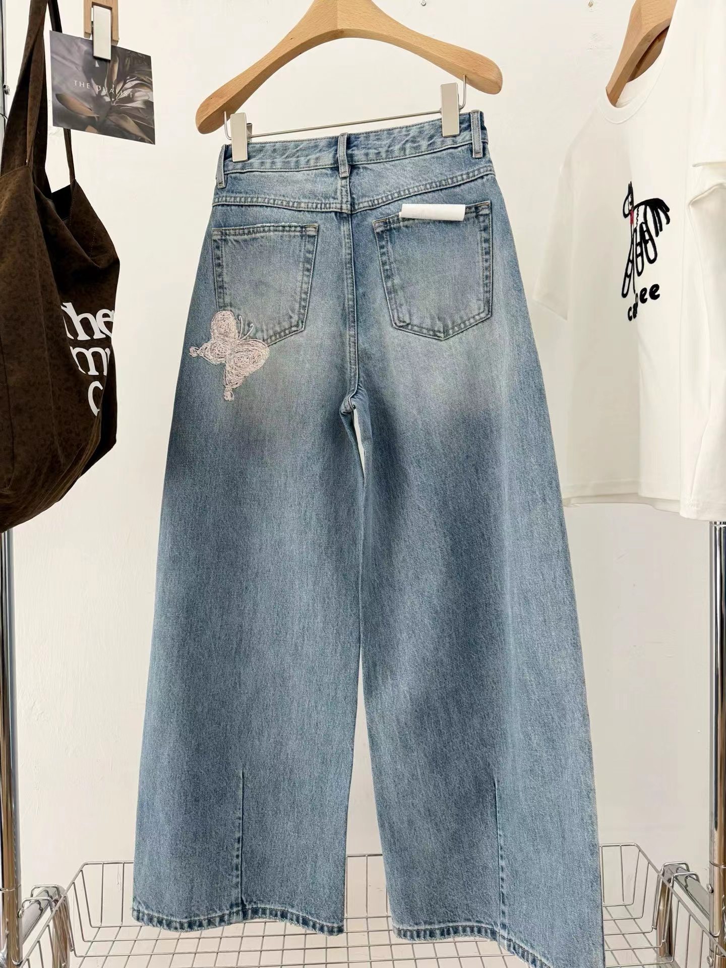重工刺绣蝴蝶结 高品质浅蓝色宽松阔腿牛仔裤女春季拖地长裤,?? 把春天的蝴蝶绣在牛仔上 复古提花毛衣的软糯,遇上渐变牛仔的随性,每一只蝴蝶刺绣,都像藏在衣料里的小浪漫。宽松阔腿版型,走路带风,也藏得住所有不开心