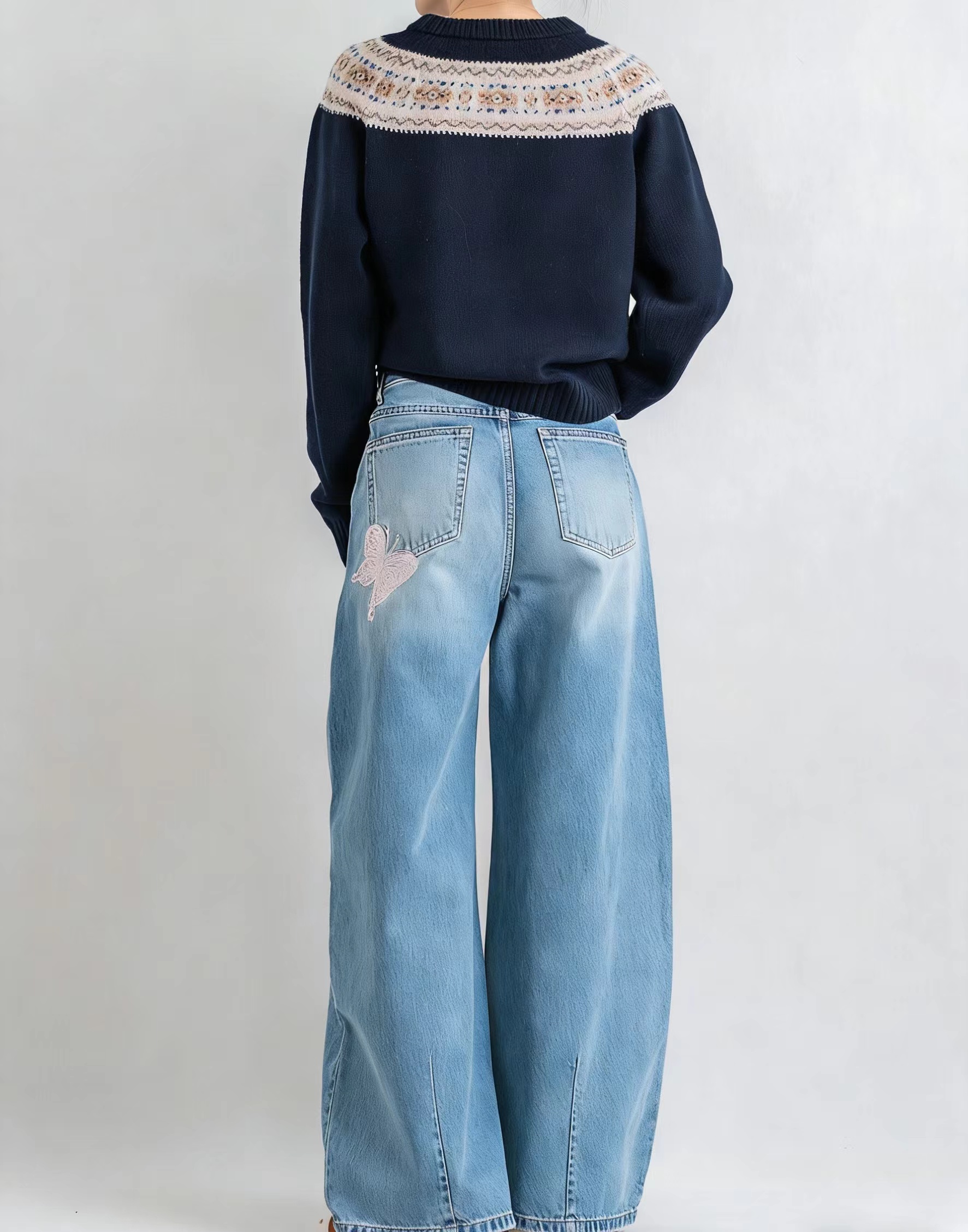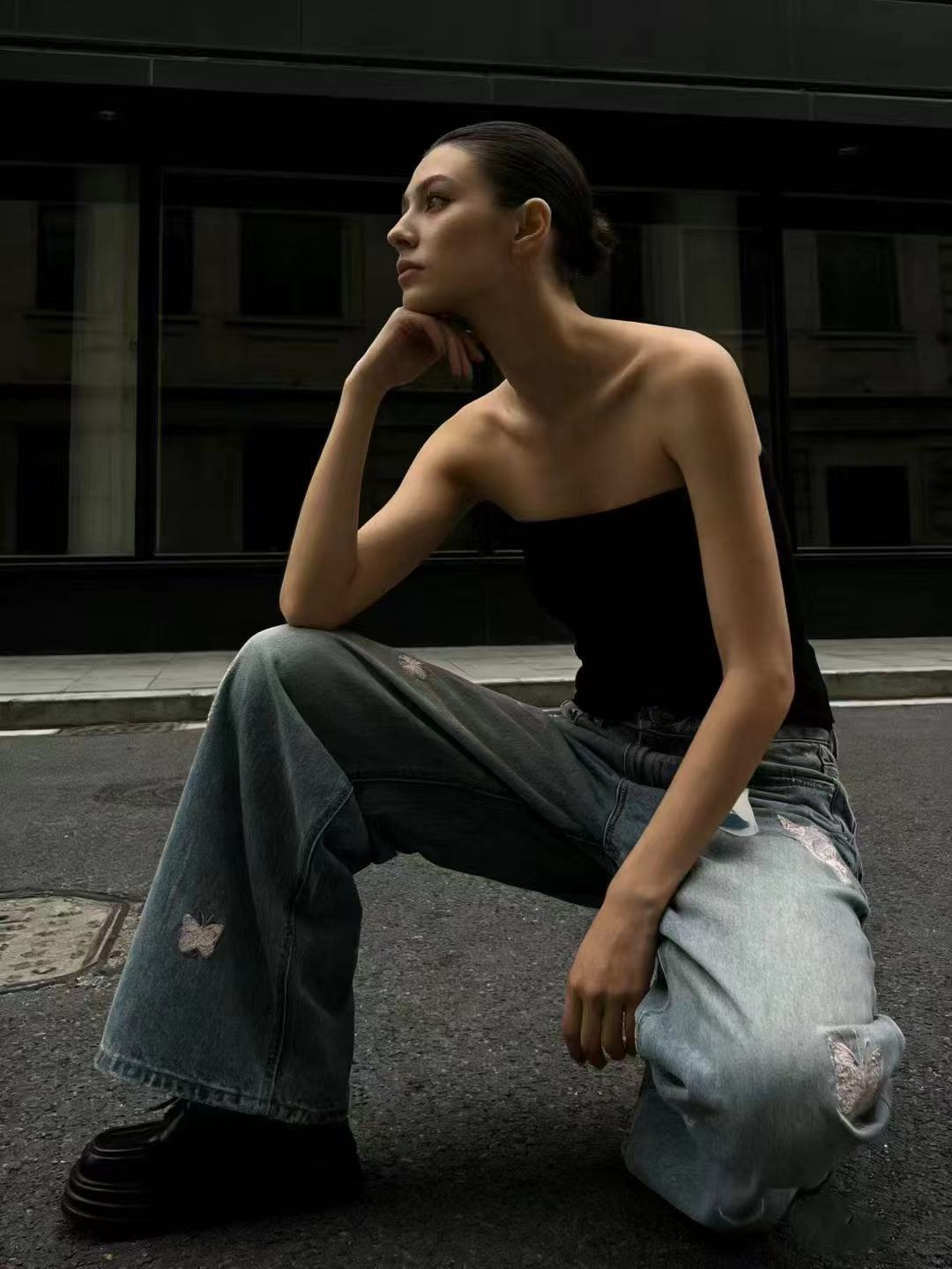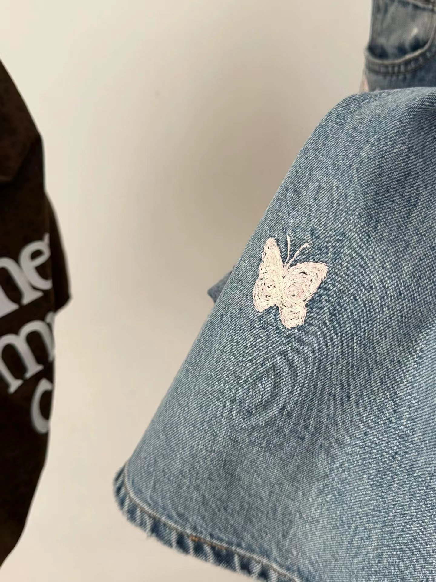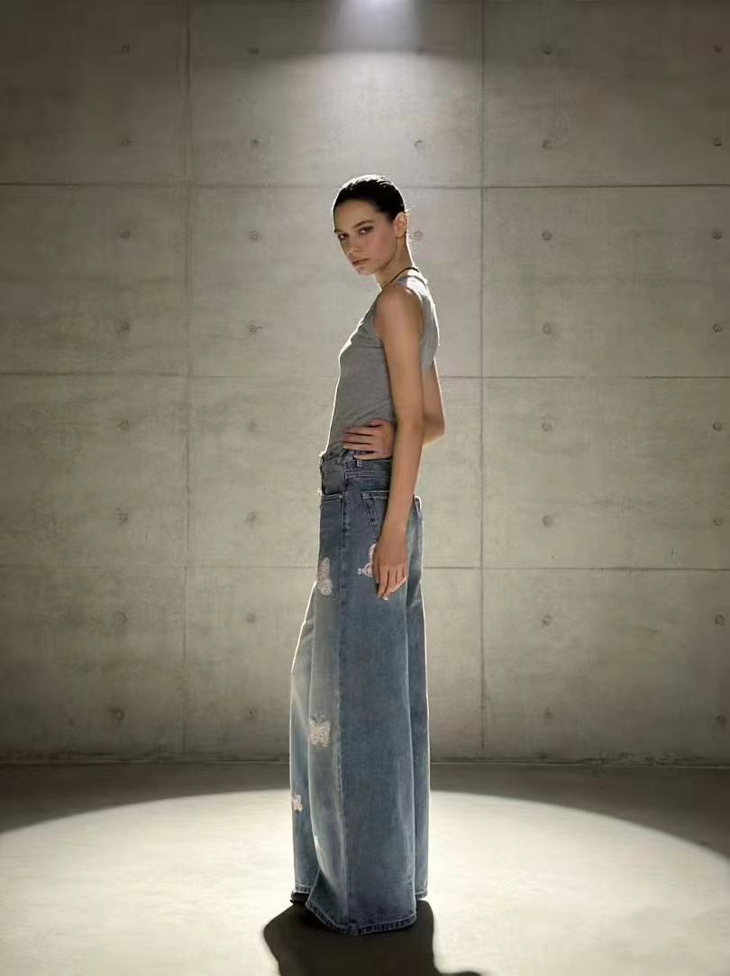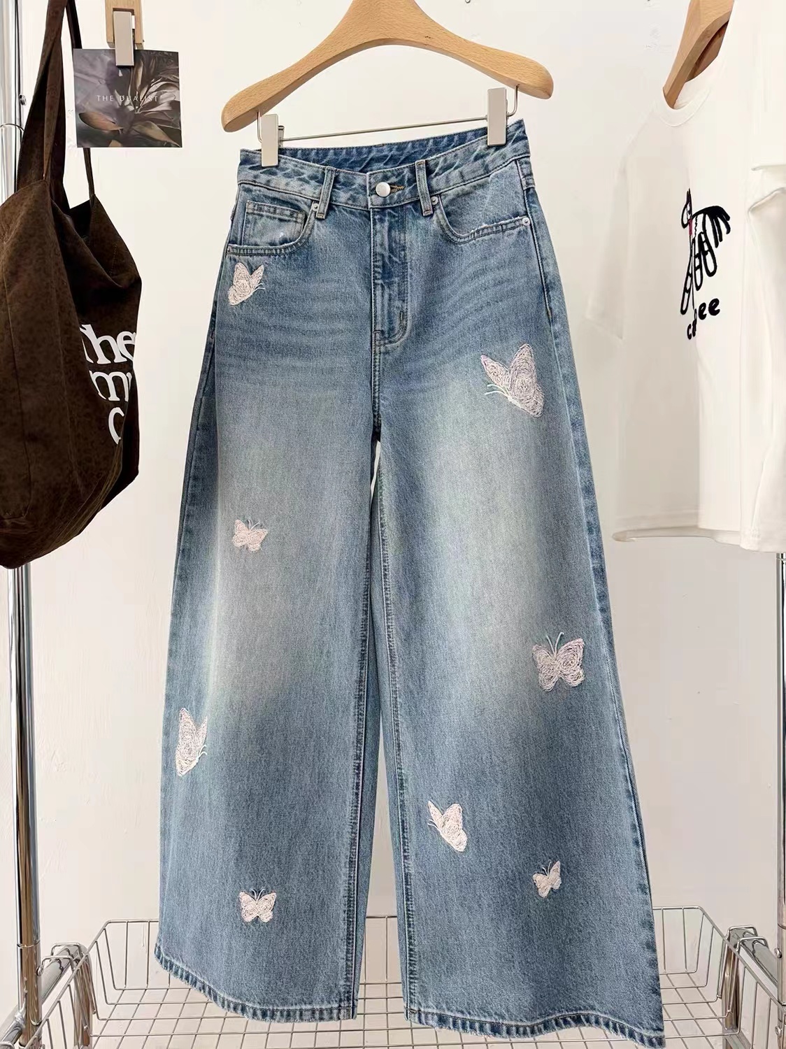 重工刺绣蝴蝶结 高品质浅蓝色宽松阔腿牛仔裤女春季拖地长裤,?? 把春天的蝴蝶绣在牛仔上 复古提花毛衣的软糯,遇上渐变牛仔的随性,每一只蝴蝶刺绣,都像藏在衣料里的小浪漫。宽松阔腿版型,走路带风,也藏得住所有不开心