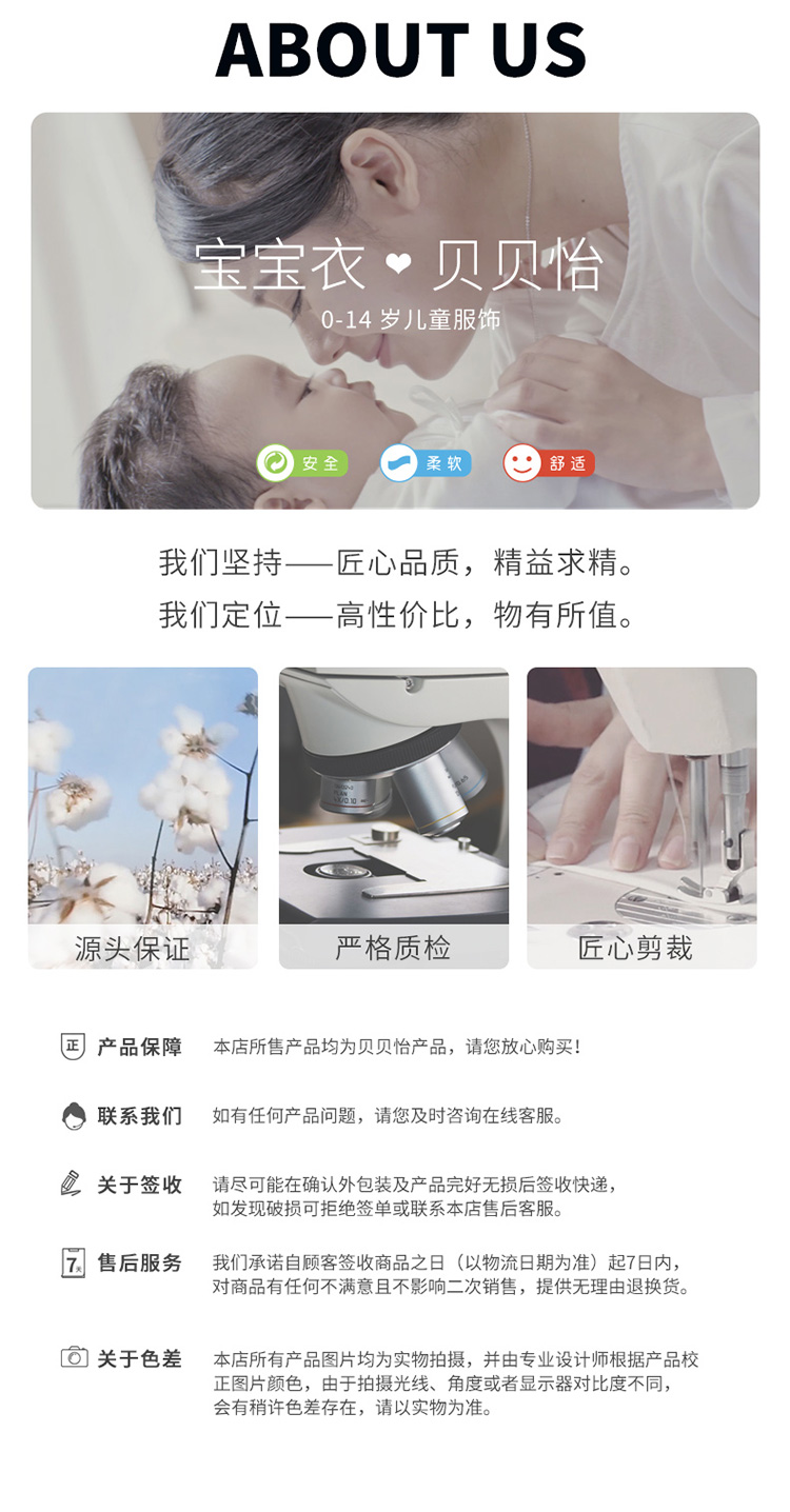 - 贝贝怡专注0-6岁婴幼儿服饰,坚持安全、柔软、舒适的产品理念,为千万中国家庭提供超高品质、安全可靠的婴幼儿服饰产品,妈妈放心,宝宝开心!
