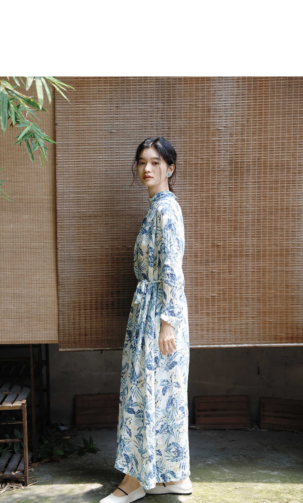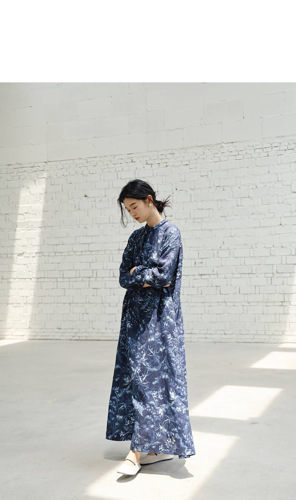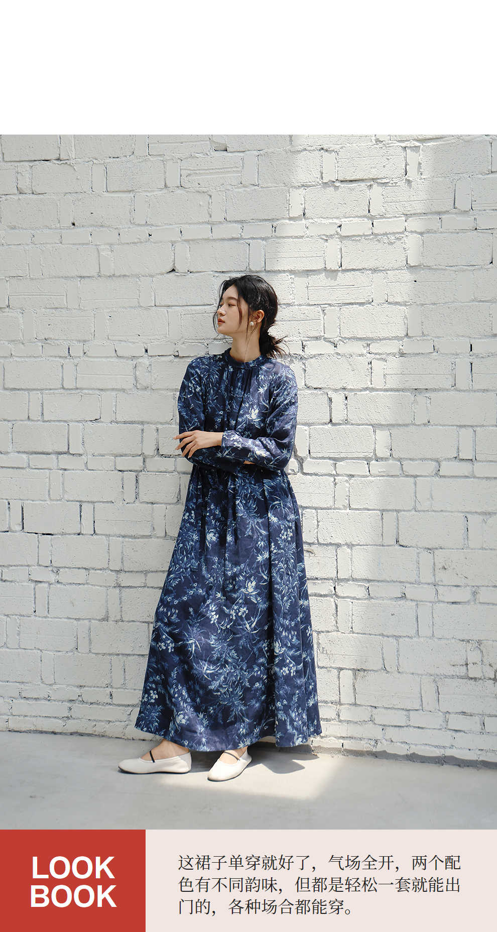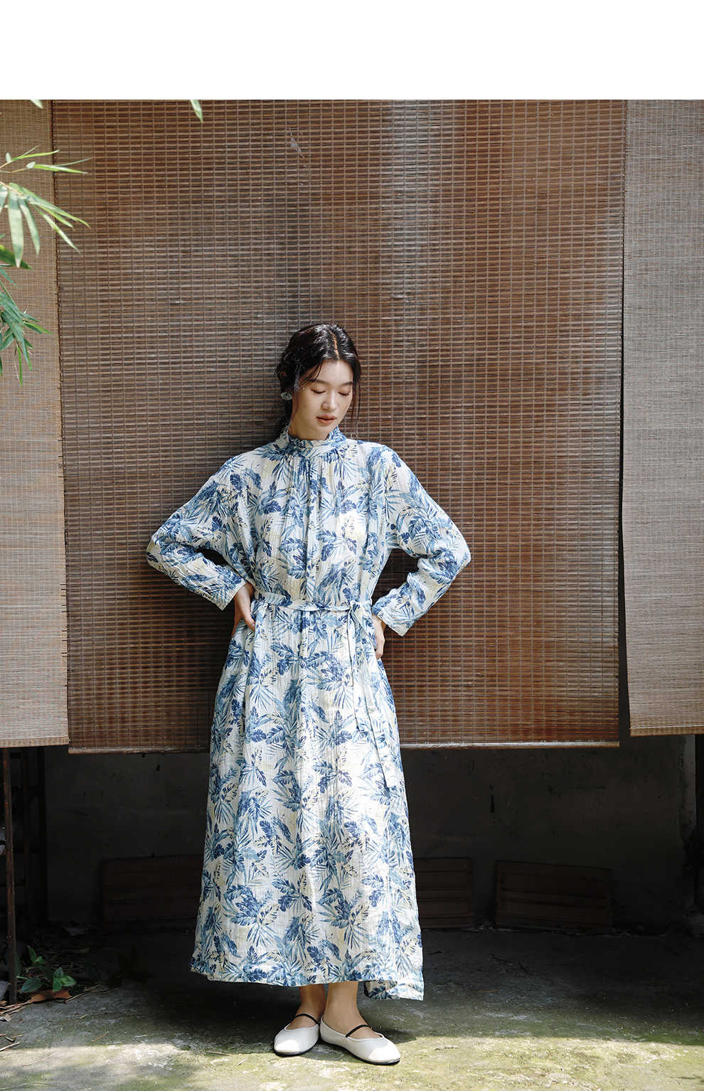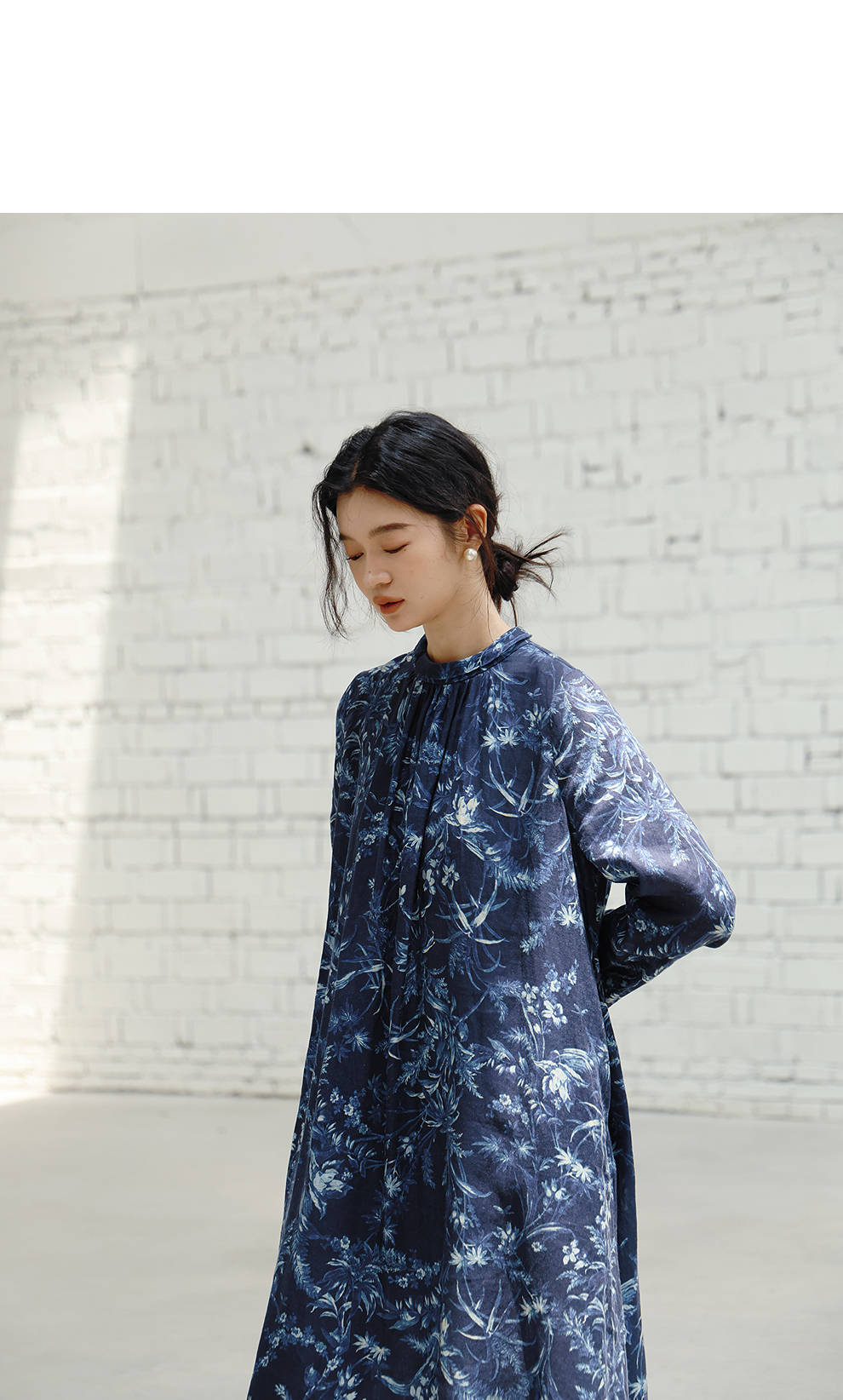 绽放旅行女374朵/【莫兰迪系列】双支亚麻底布印花立领长袖连衣裙