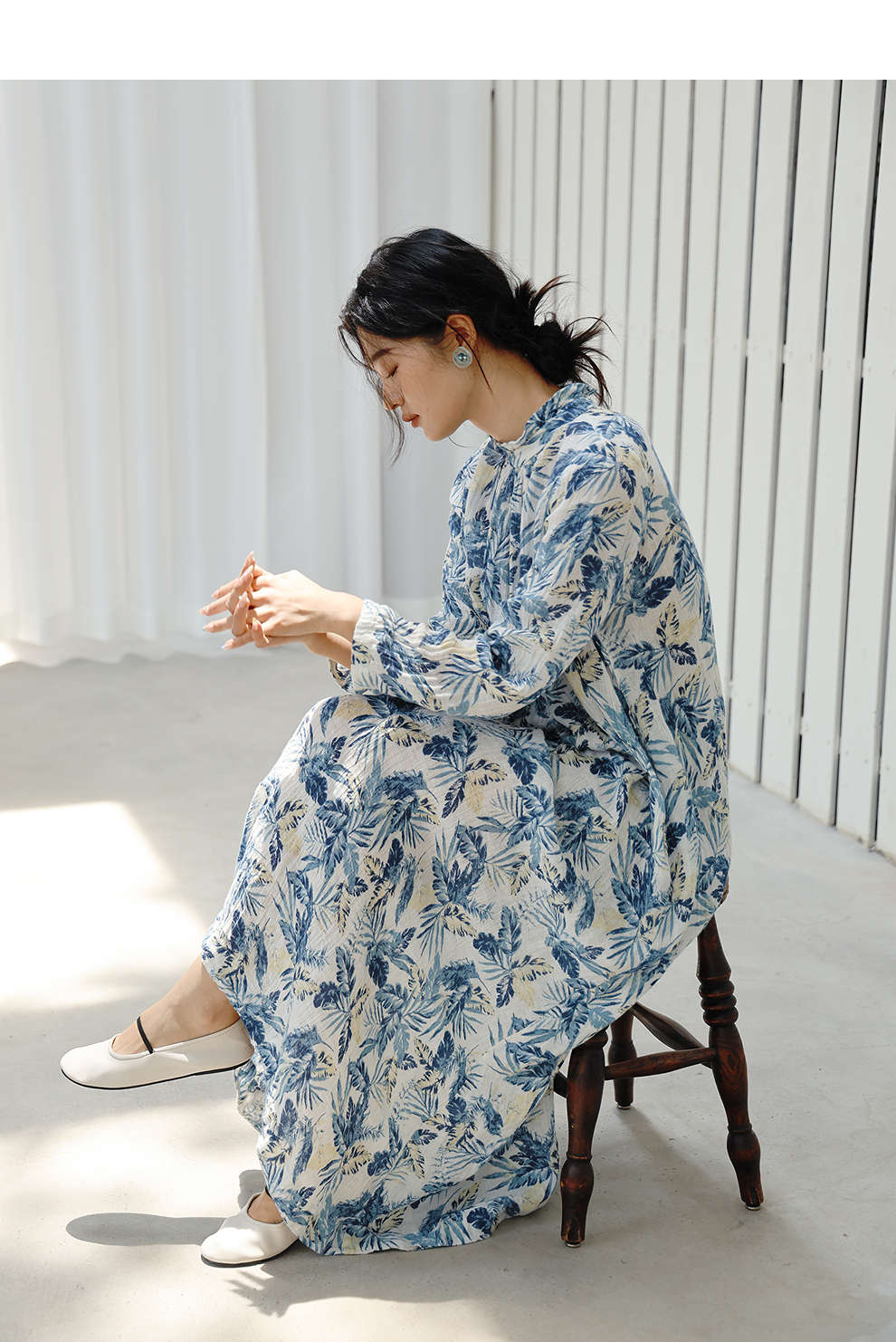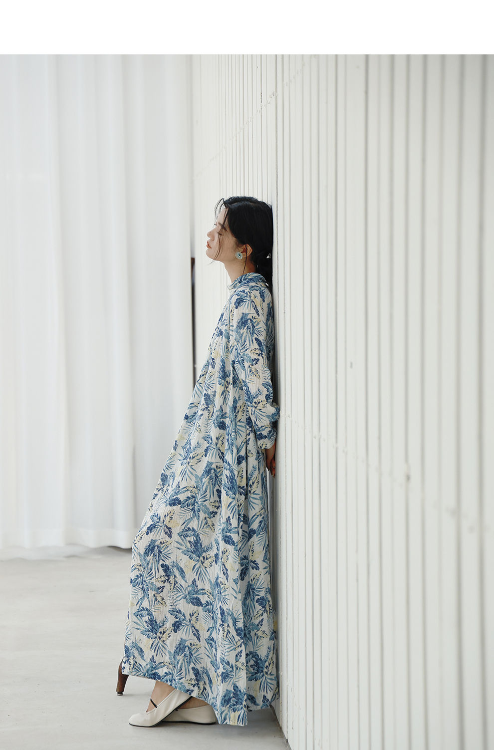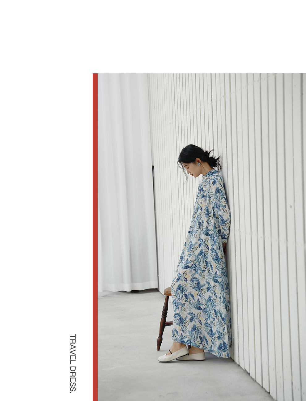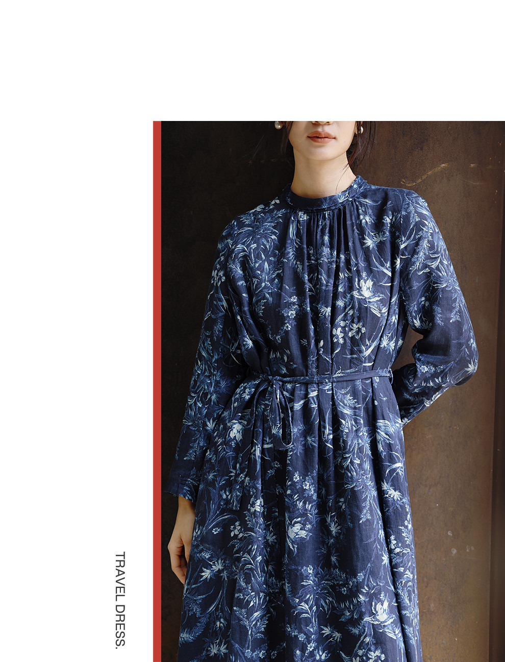 绽放旅行女374朵/【莫兰迪系列】双支亚麻底布印花立领长袖连衣裙