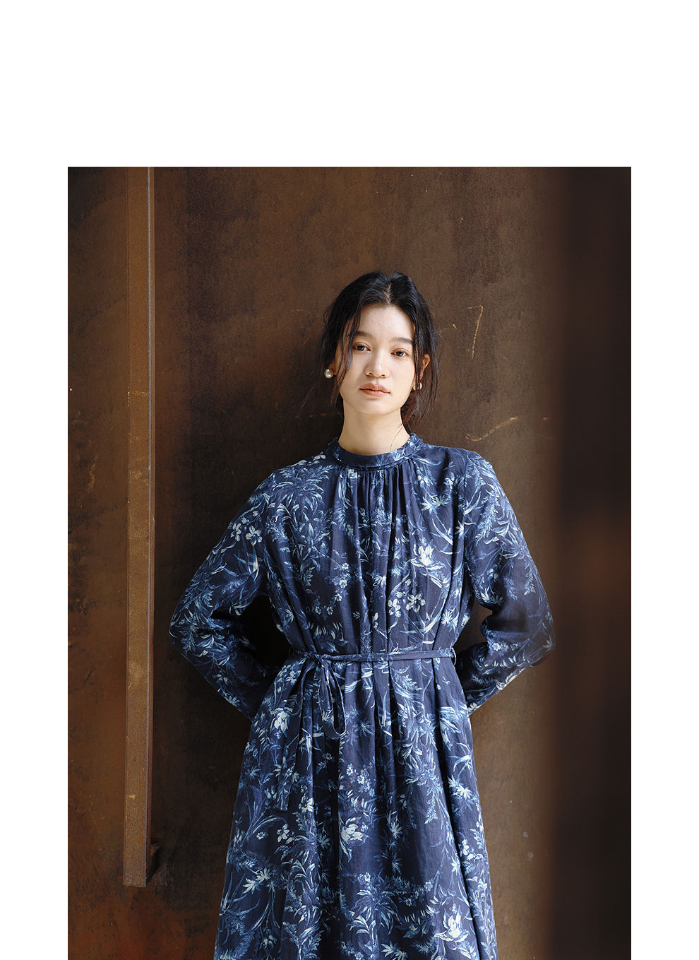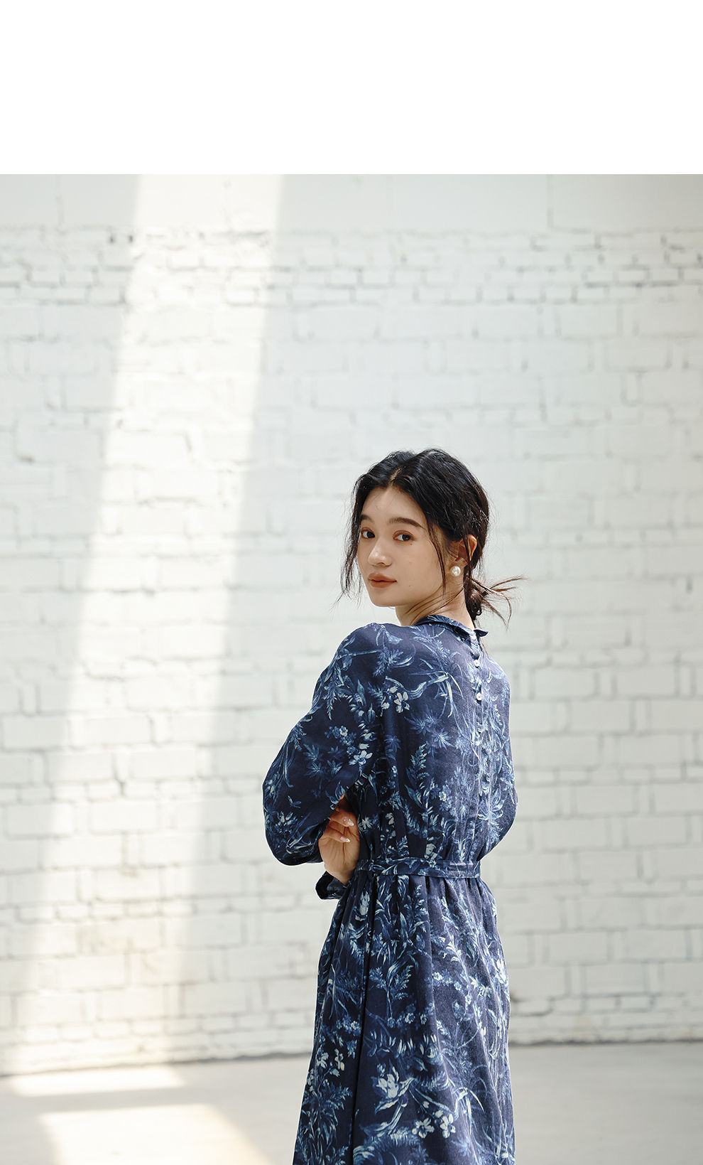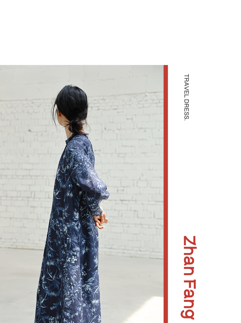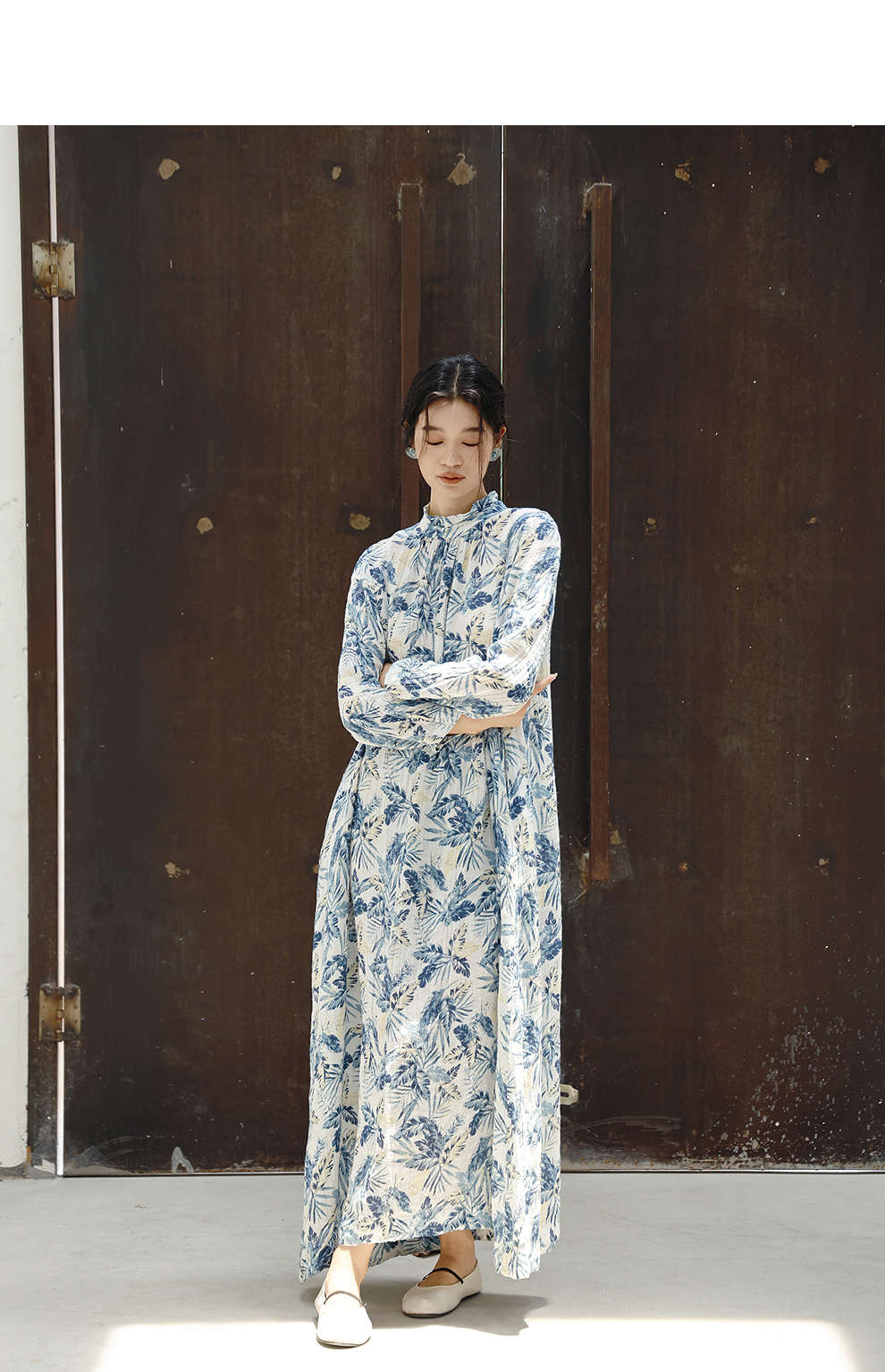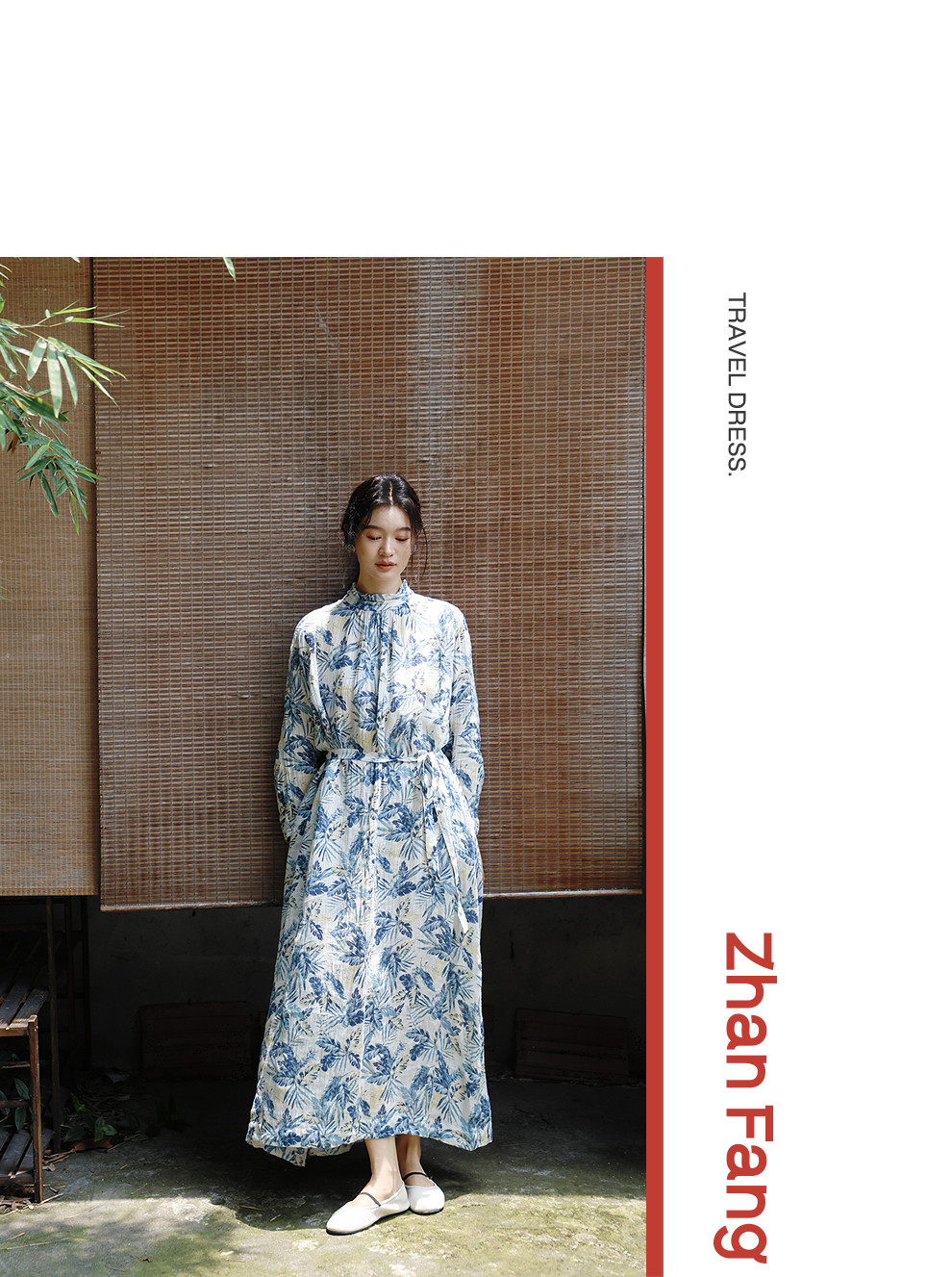 绽放旅行女374朵/【莫兰迪系列】双支亚麻底布印花立领长袖连衣裙