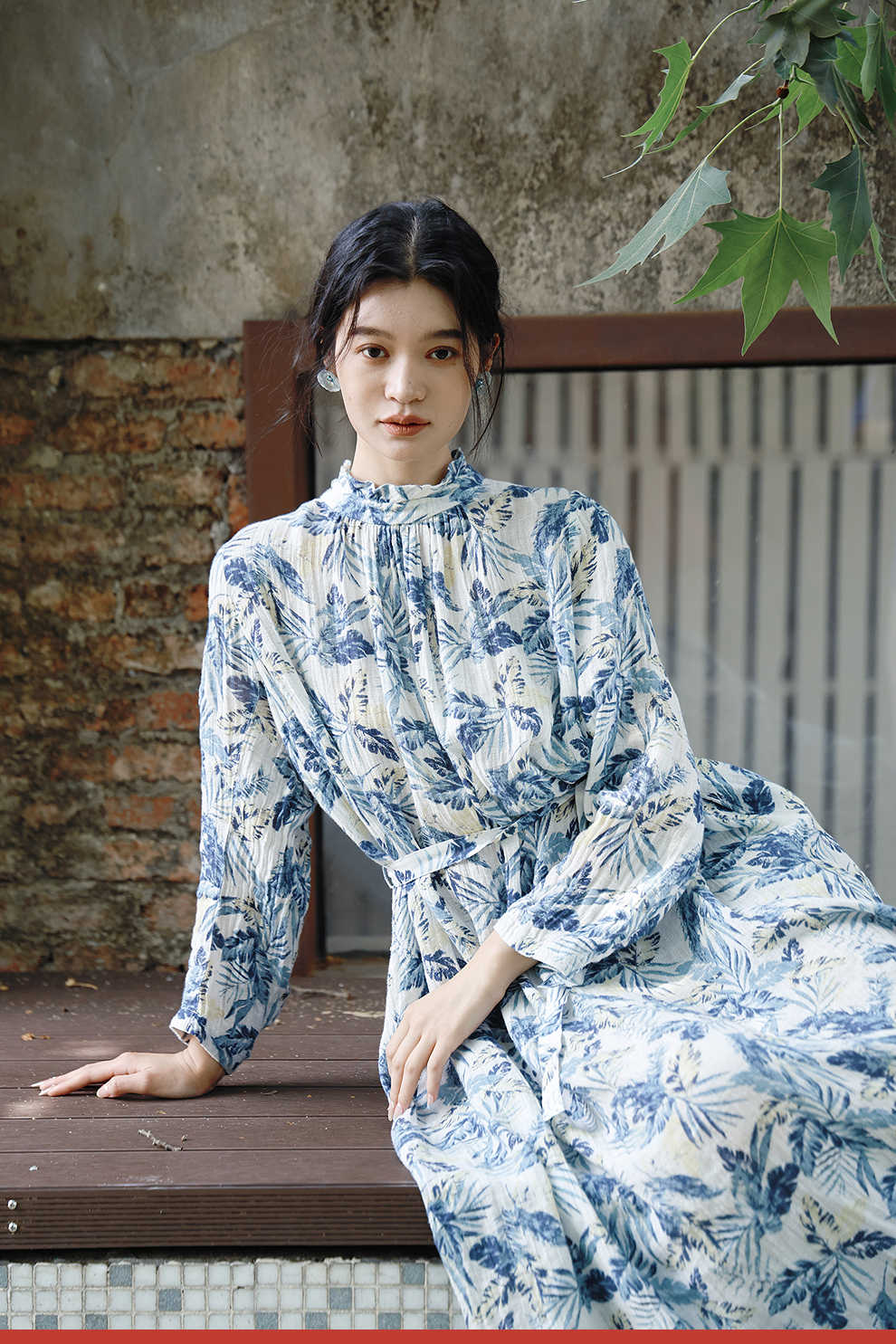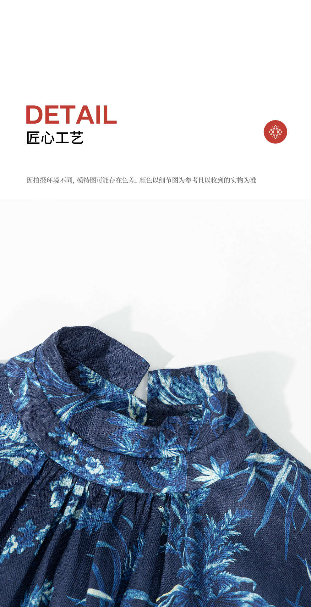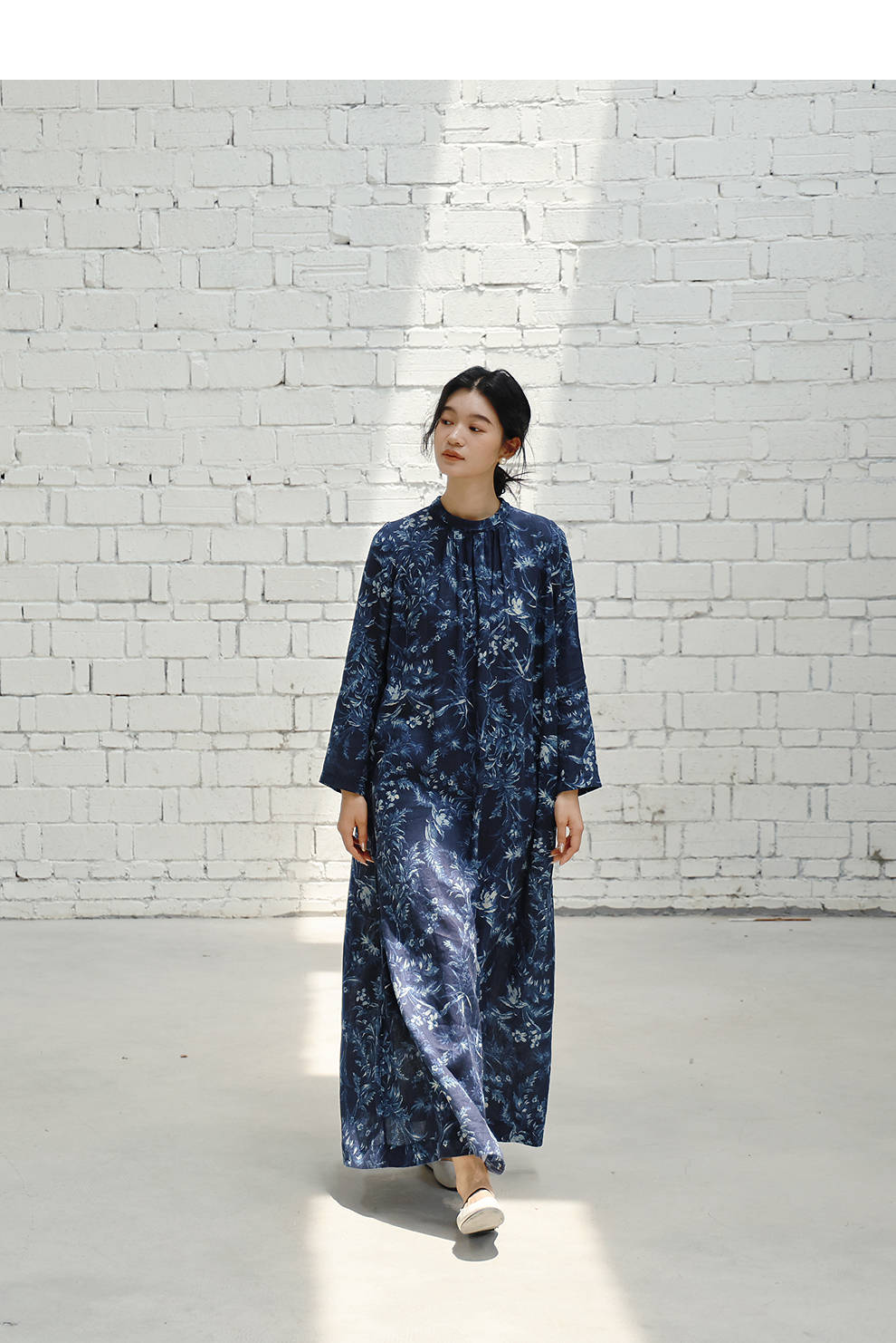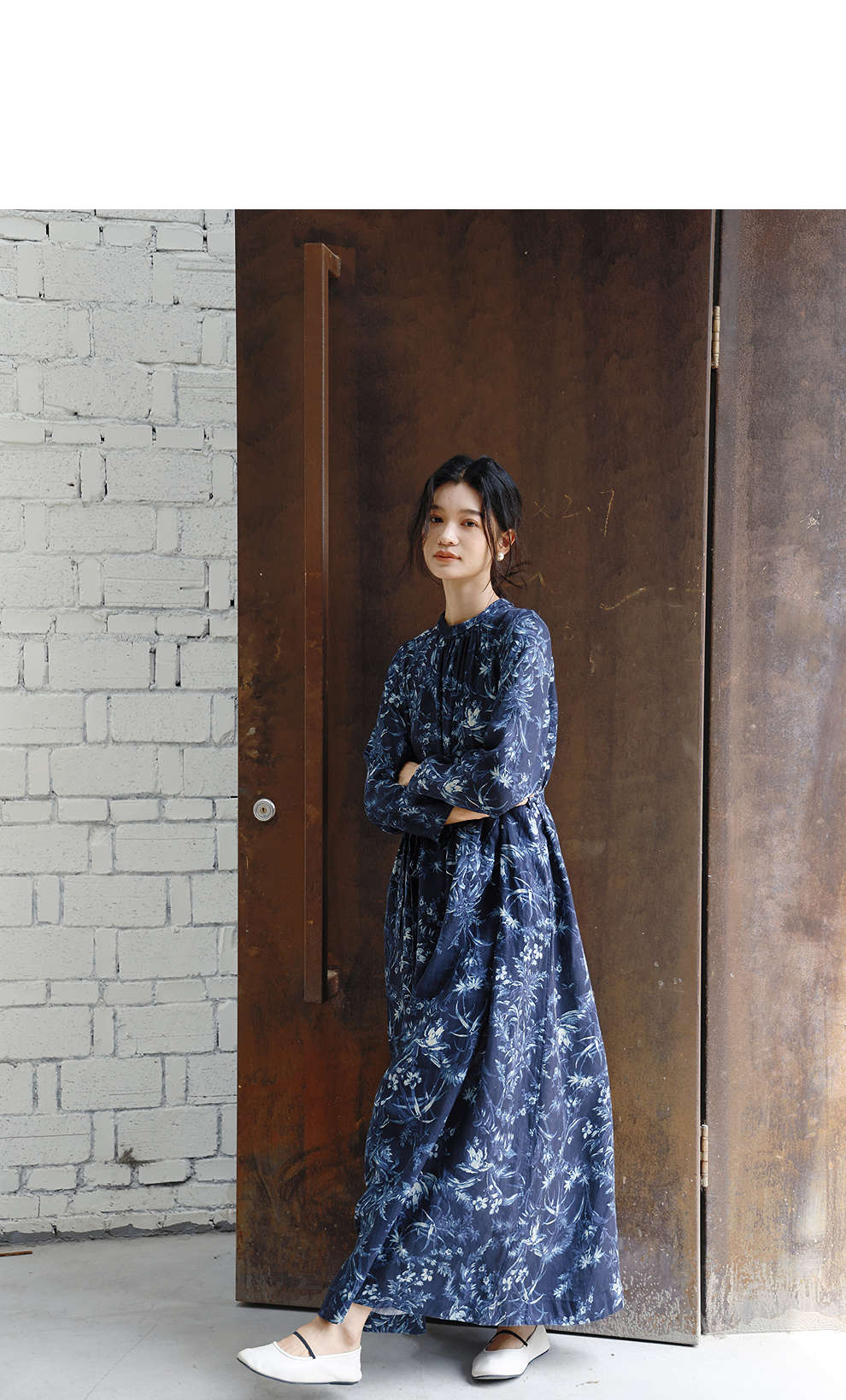 绽放旅行女374朵/【莫兰迪系列】双支亚麻底布印花立领长袖连衣裙