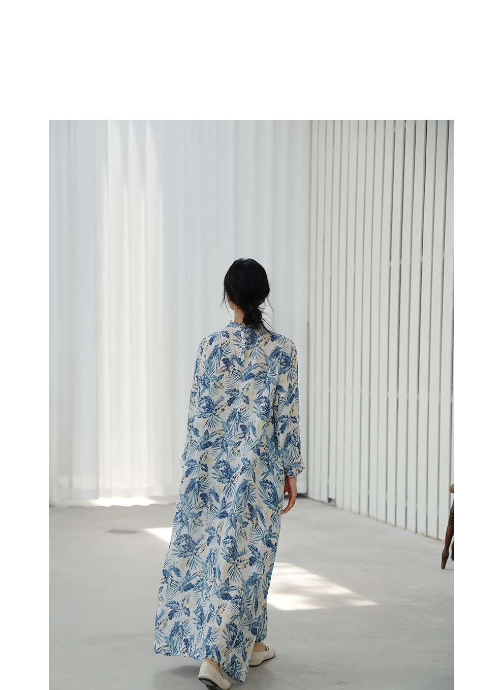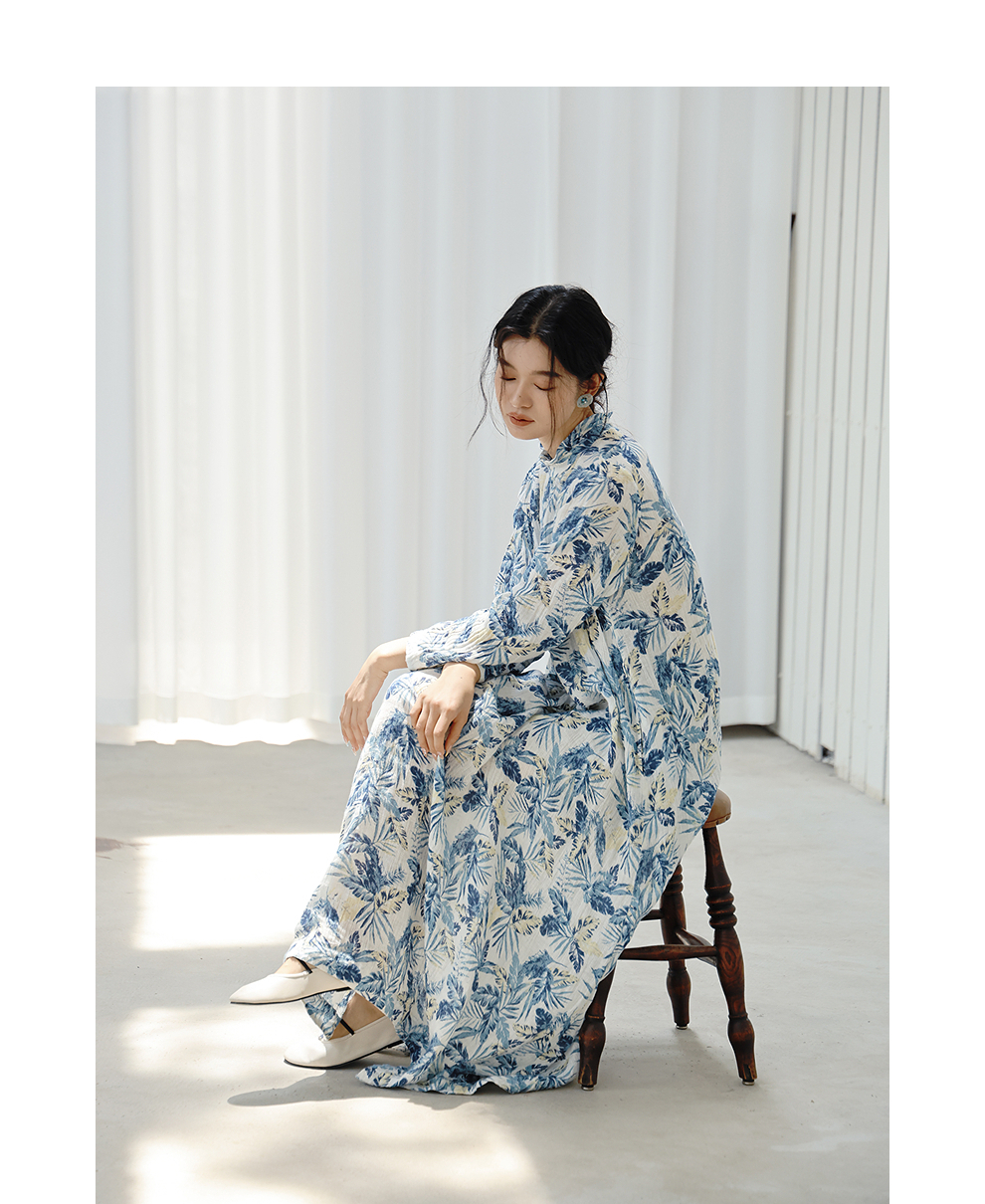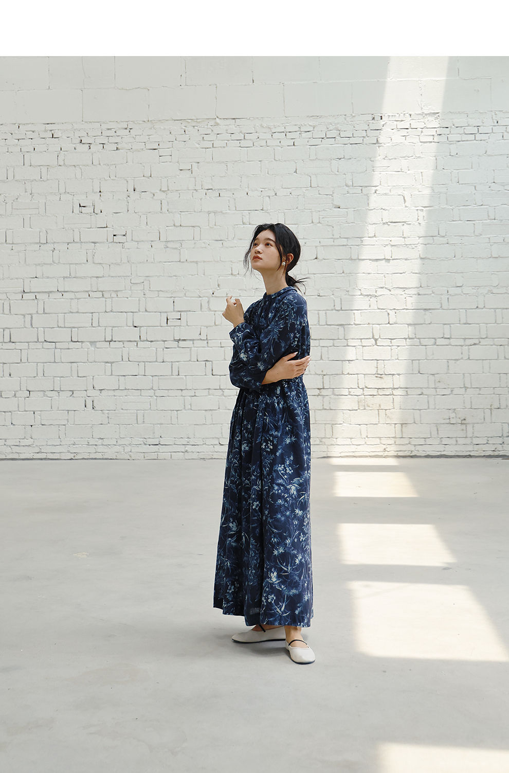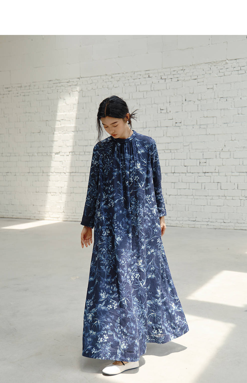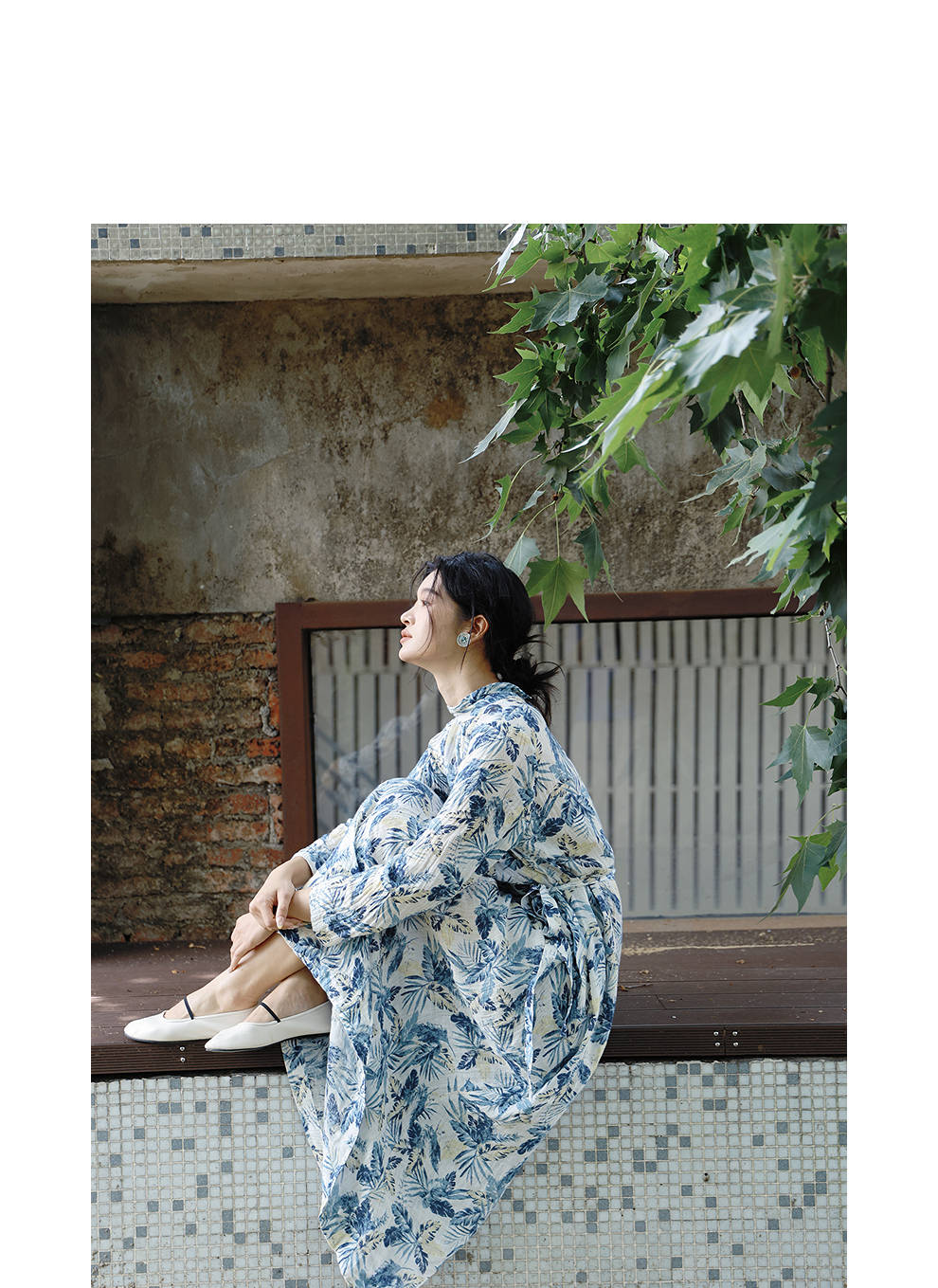 绽放旅行女374朵/【莫兰迪系列】双支亚麻底布印花立领长袖连衣裙