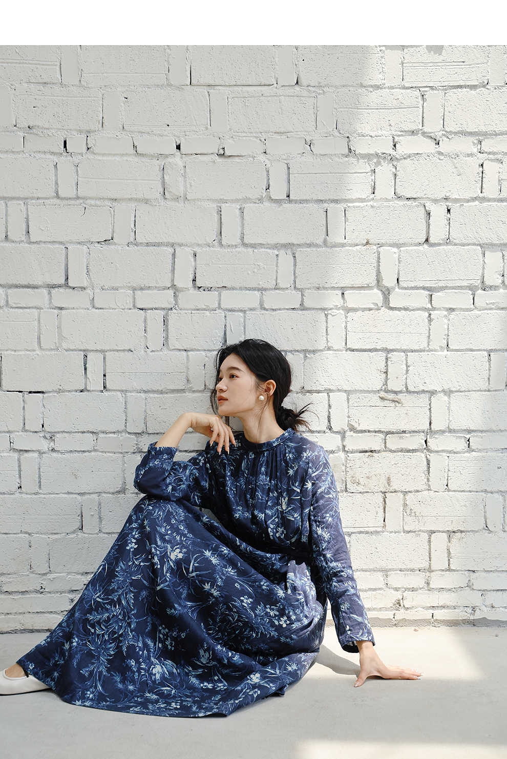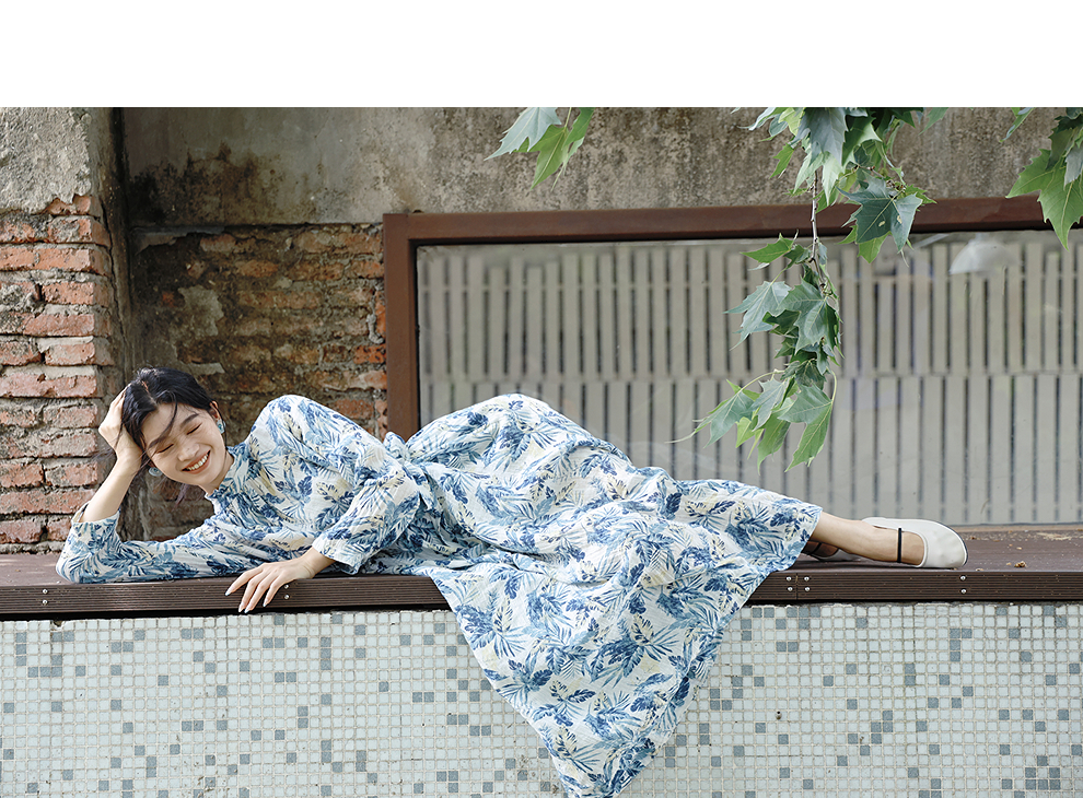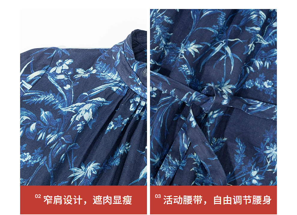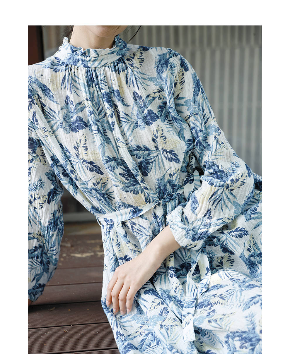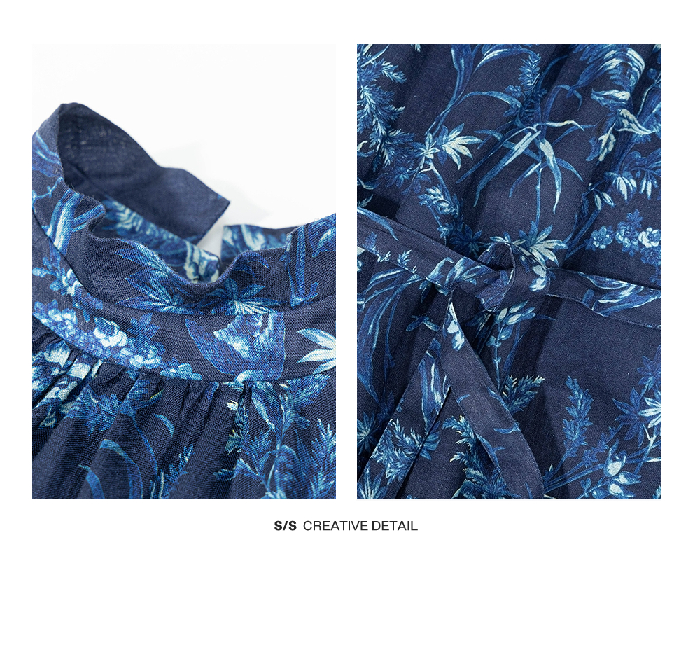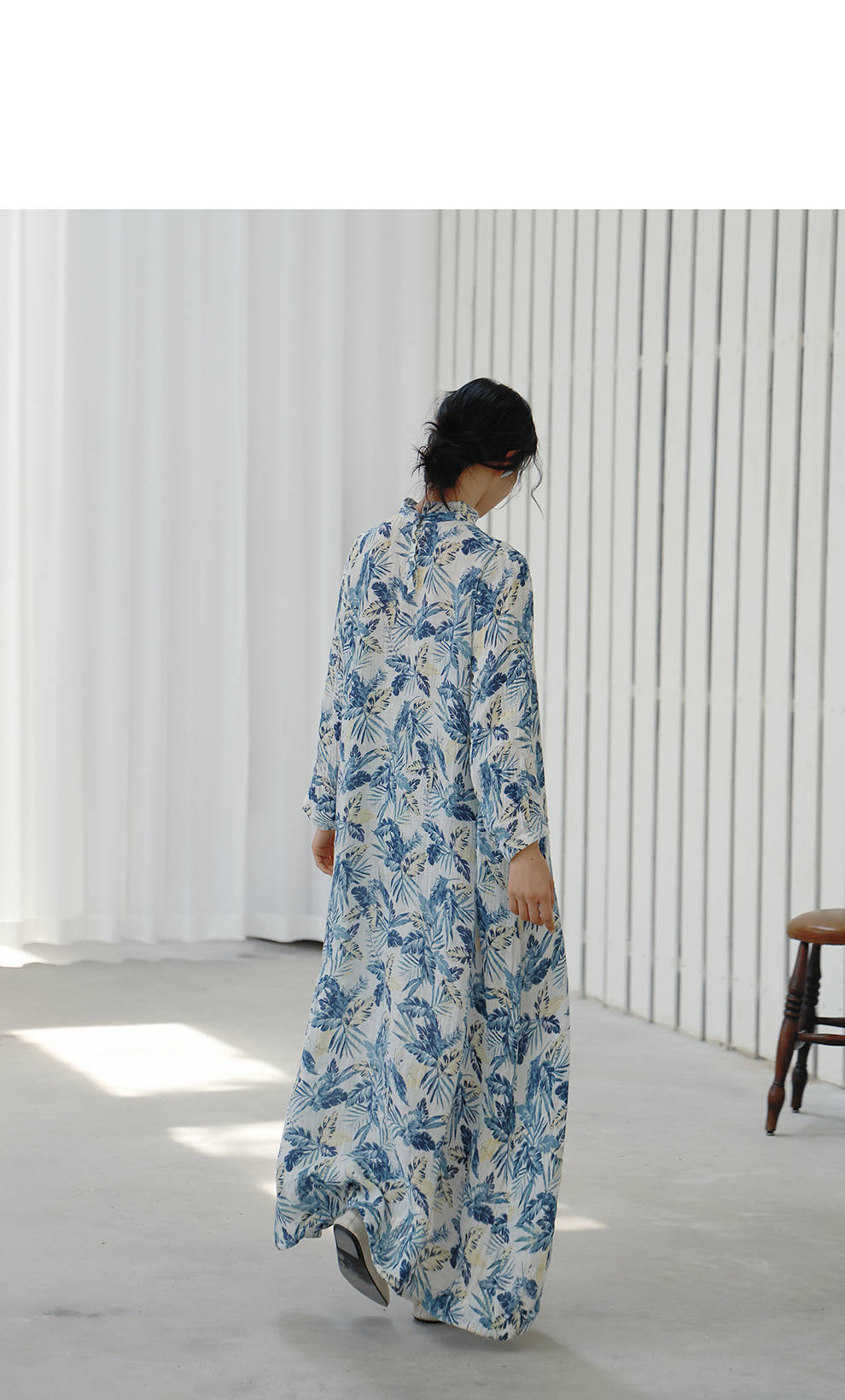 绽放旅行女374朵/【莫兰迪系列】双支亚麻底布印花立领长袖连衣裙