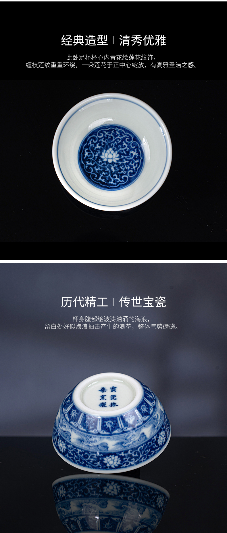 青花柴窑内画碧海生花卧足杯