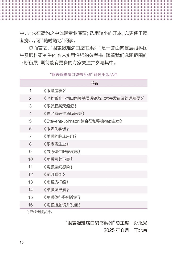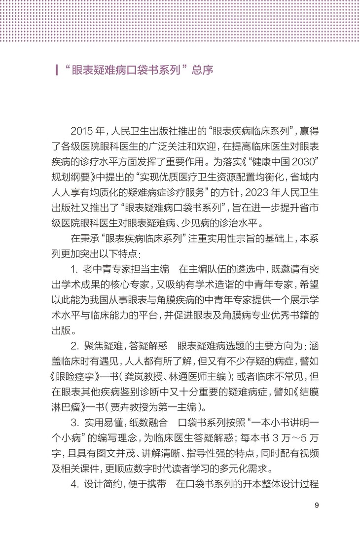 “眼表疑难病口袋书系列”是继“眼表疾病临床系列”之后又一深受读者喜爱的系列丛书。该系列延续内容实用性、团队权威性,旨在聚焦眼表疑难病、少见病。目前多个品种相继出版,如《眼睑痉挛》《飞秒激光小切口角膜基质透镜取出术并发症及处理》,市场反响好。