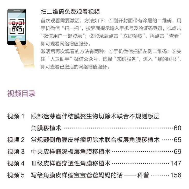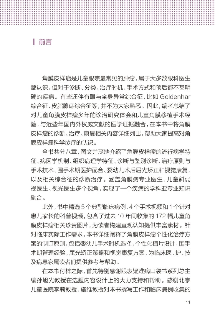 ② 书中精选4个手术视频和1个针对患儿家长的科普视频,收集了过去10年间的172幅儿童角膜皮样瘤临床实际案例诊疗相关珍贵图片。