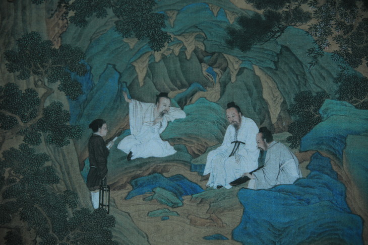 简介:该作品的题材取自东晋隐士陶渊明所作《桃花源记》,描绘了文人理想中的隐居之乐。全画以竖幅高远章法,分三层叠进,近景为深壑、小桥、流水,桥上有童子捧瓯而过。板桥过处,青草铺地,另一童子携食盒亢于岸头。隔小溪为山洞,内有钟乳石悬壁,有泉淌漾而出,洞口水边有一位仙者弹琴,两位仙者于旁静听,传神入微。仙者傍依的山根岩石间,有山桃杂卉伴卧松而开放,古松自右岸斜坡横卧于洞顶,松皮龙壳,青藤盘绕,与左岸山岩之山桃相呼应,境界超逸。