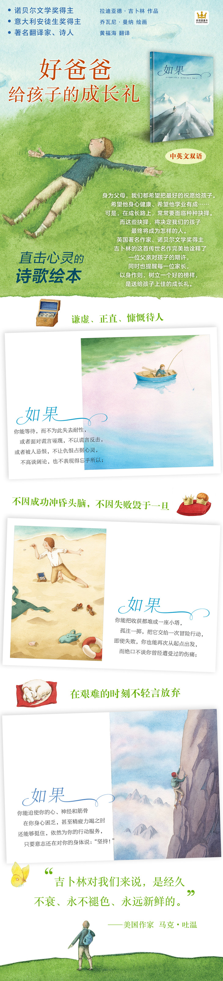 简介1909年,拉迪亚德•吉卜林创作了《如果》这首诗,寄语12岁的儿子约翰。几年后,约翰不幸死于“一战”中的一场战役。但是这首诗却成为一种激励,广为流传。近年来,这首诗两次入选“英国民众最喜爱的诗作”。在这本描绘来自父辈的谆谆教诲的图画书里,意大利插画家乔瓦尼•曼纳用柔软而有力量的画笔,把童年的天真和吉卜林诗句间传达出的激励人心的情感,完美地融为一体。