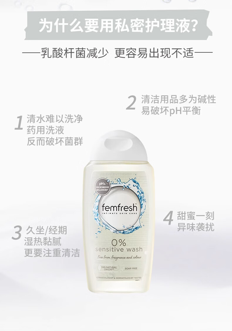 英国Femfresh芳芯 · 女性私处护理液洗液敏感型250ml|保税