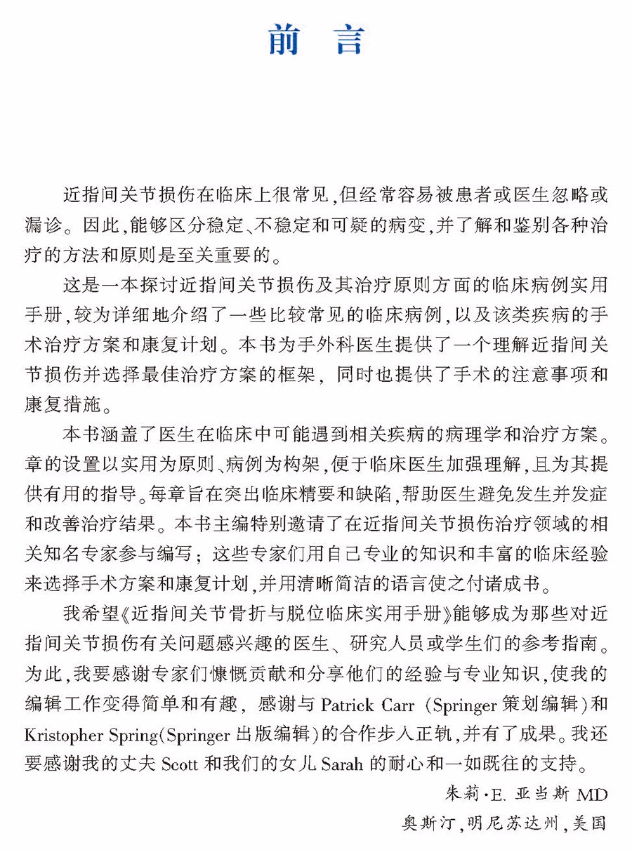 本书通过对各种近指间关节损伤临床病例的详述,简洁、实用地为骨科医生和手外科医生提供了最好的治疗策略,使其能利用多种外科技术正确处理近指间关节。每一章开头都描述了一个具有独特临床表现的病例,随后讲述了该病例的诊断、评估和治疗技巧及其治疗结果、临床精要和缺陷。各病例都有图解,用以说明掌侧骨折脱位的手术治疗和非手术治疗、背侧夹板和钉固定技术、螺钉内固定复位术、掌板和半钩骨关节成形术、近指间关节融合术以及儿科近指间关节损伤的处理等。本书是骨科医生和手外科医生处理近指间关节常见及复合骨折的参考资料。