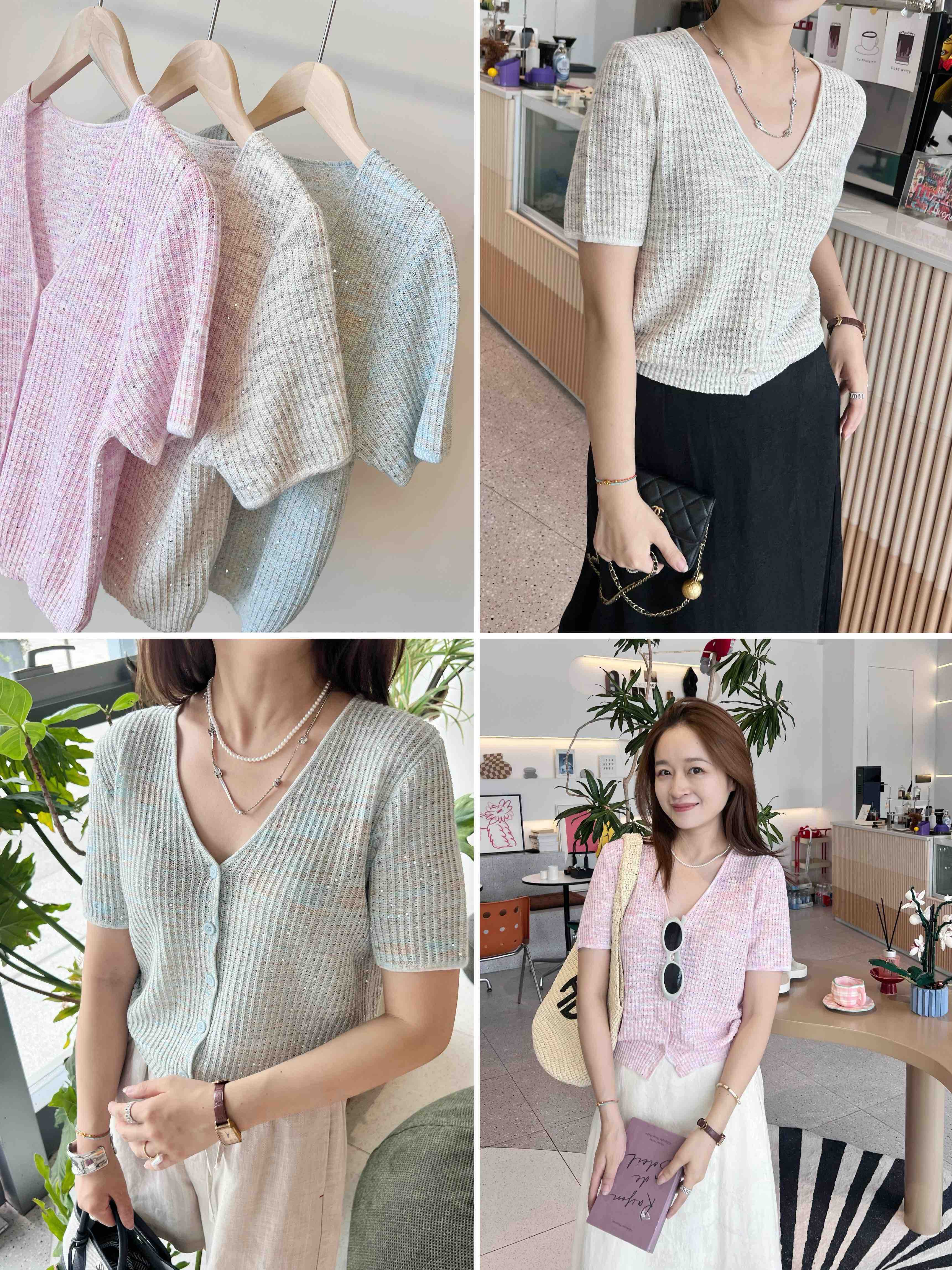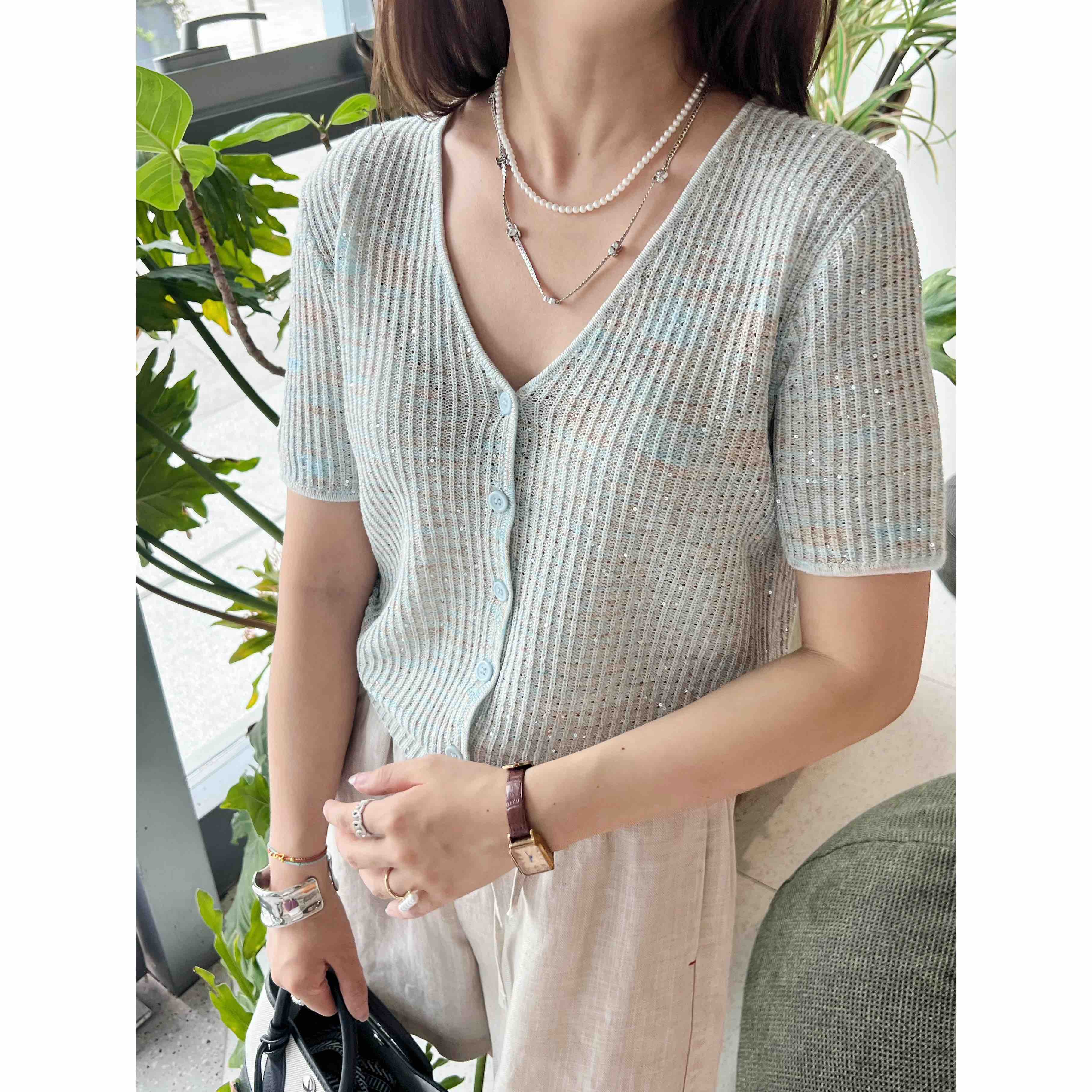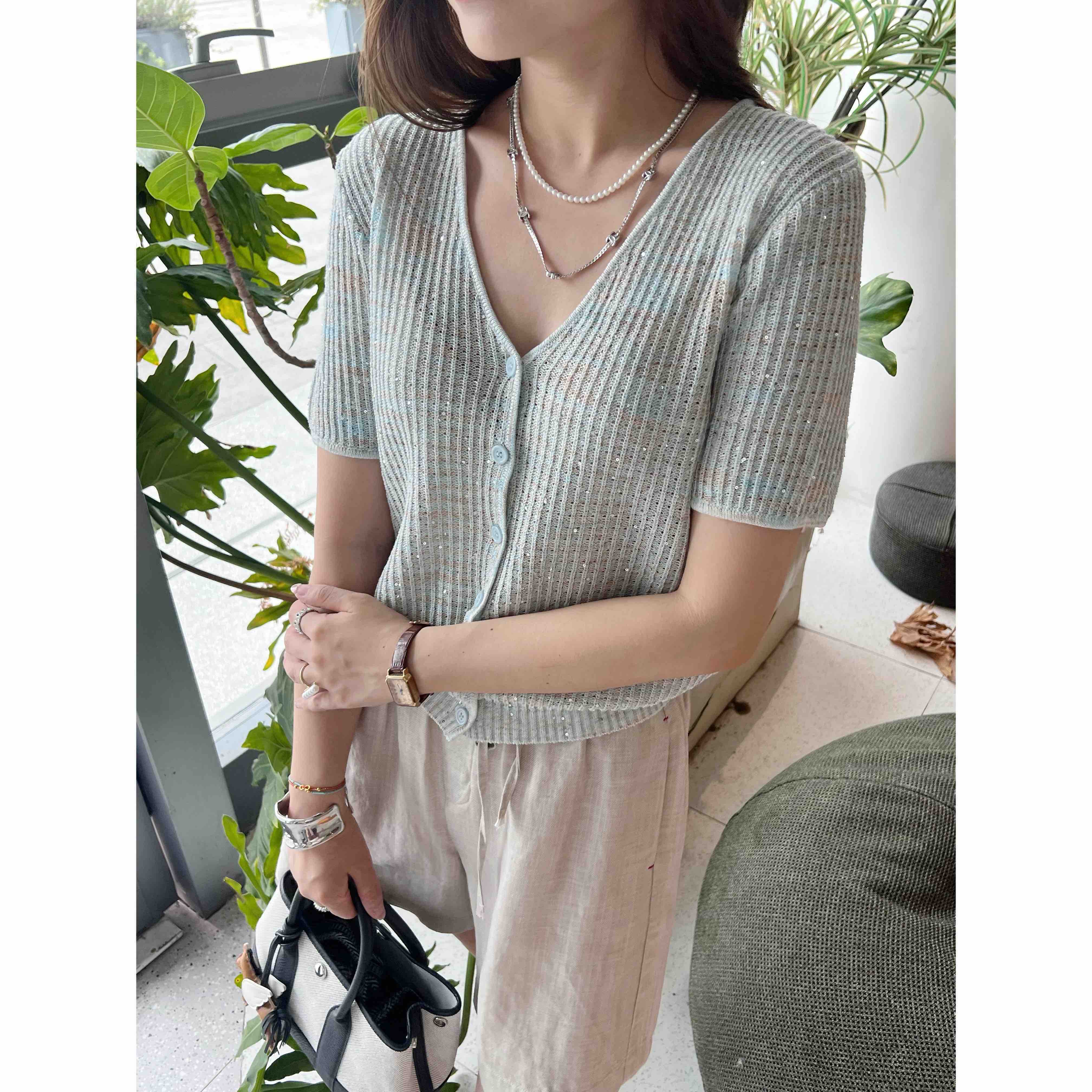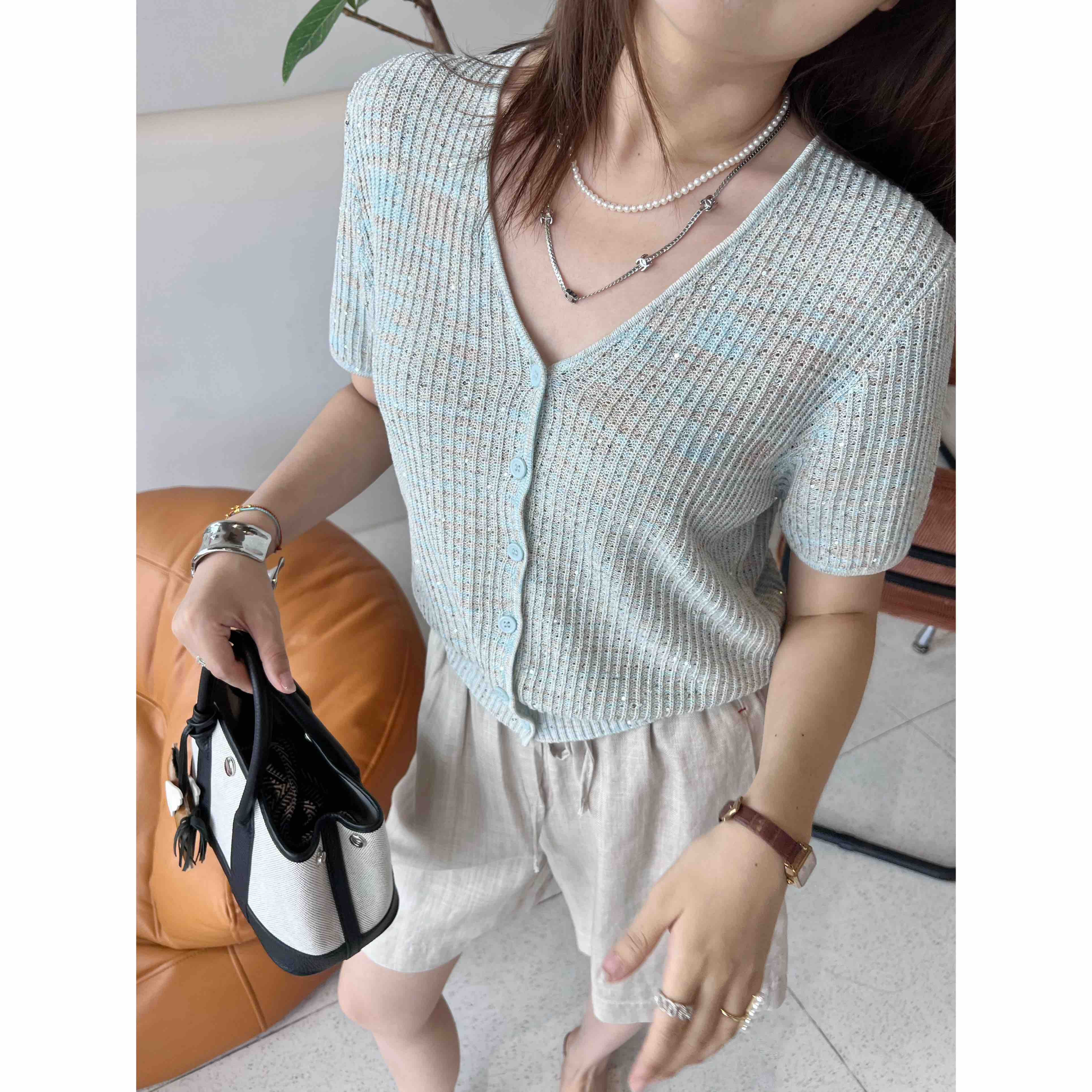 2507414 顶级“康宝莱” 亚麻珠片 短袖开衫