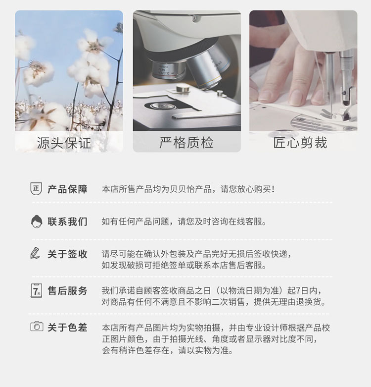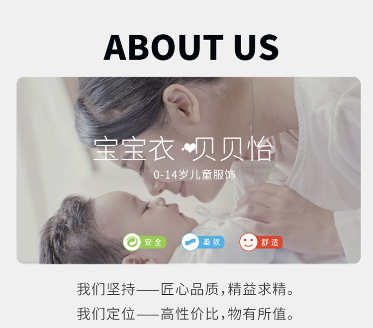 - 贝贝怡专注0-6岁婴幼儿服饰,坚持安全、柔软、舒适的产品理念,为千万中国家庭提供超高品质、安全可靠的婴幼儿服饰产品,妈妈放心,宝宝开心!