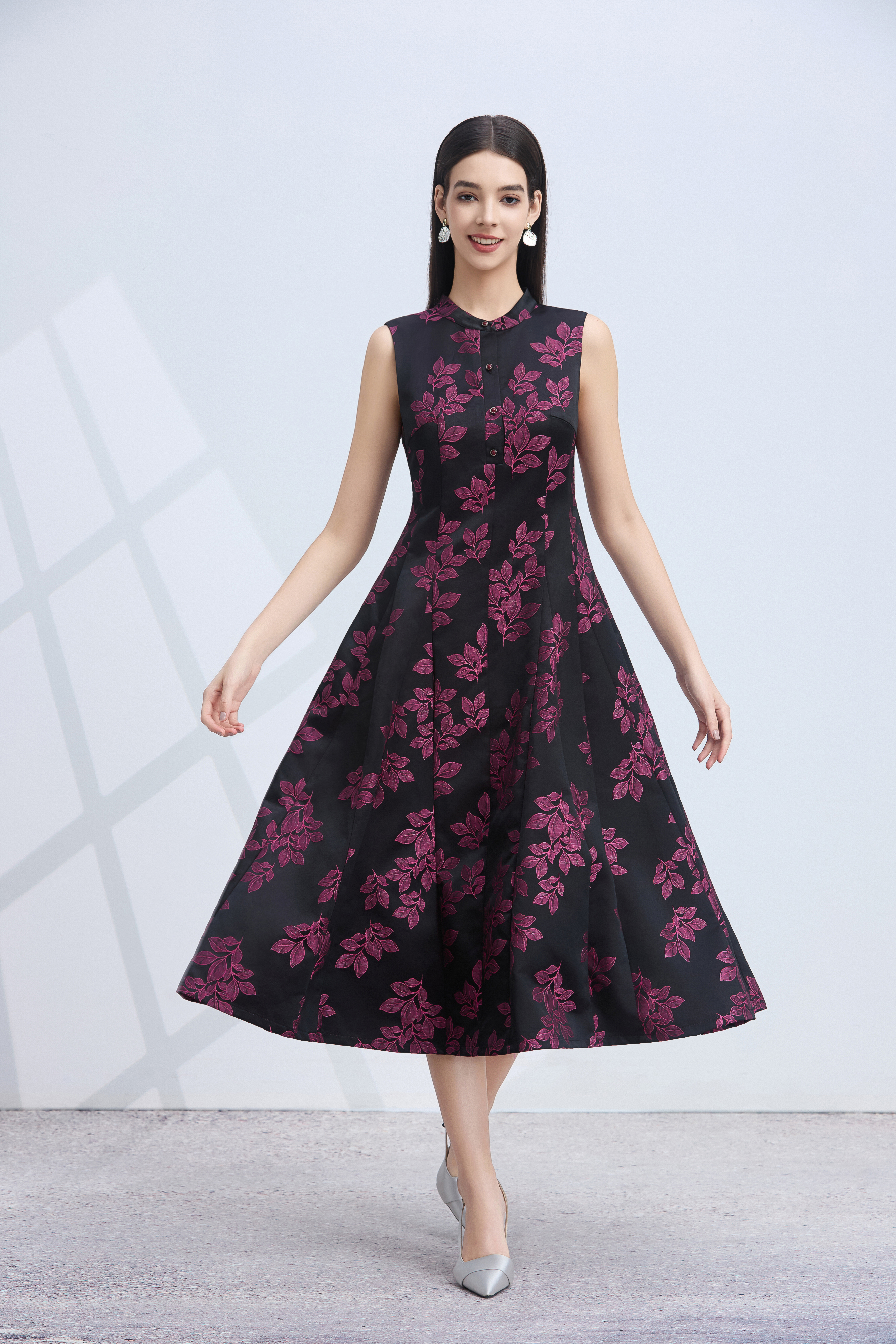 SZ3S81_魏紫色_连衣裙_秋季_新中式立领无袖收腰A字大摆中长款_高级女装_BERNIEELEN 伯妮斯茵
