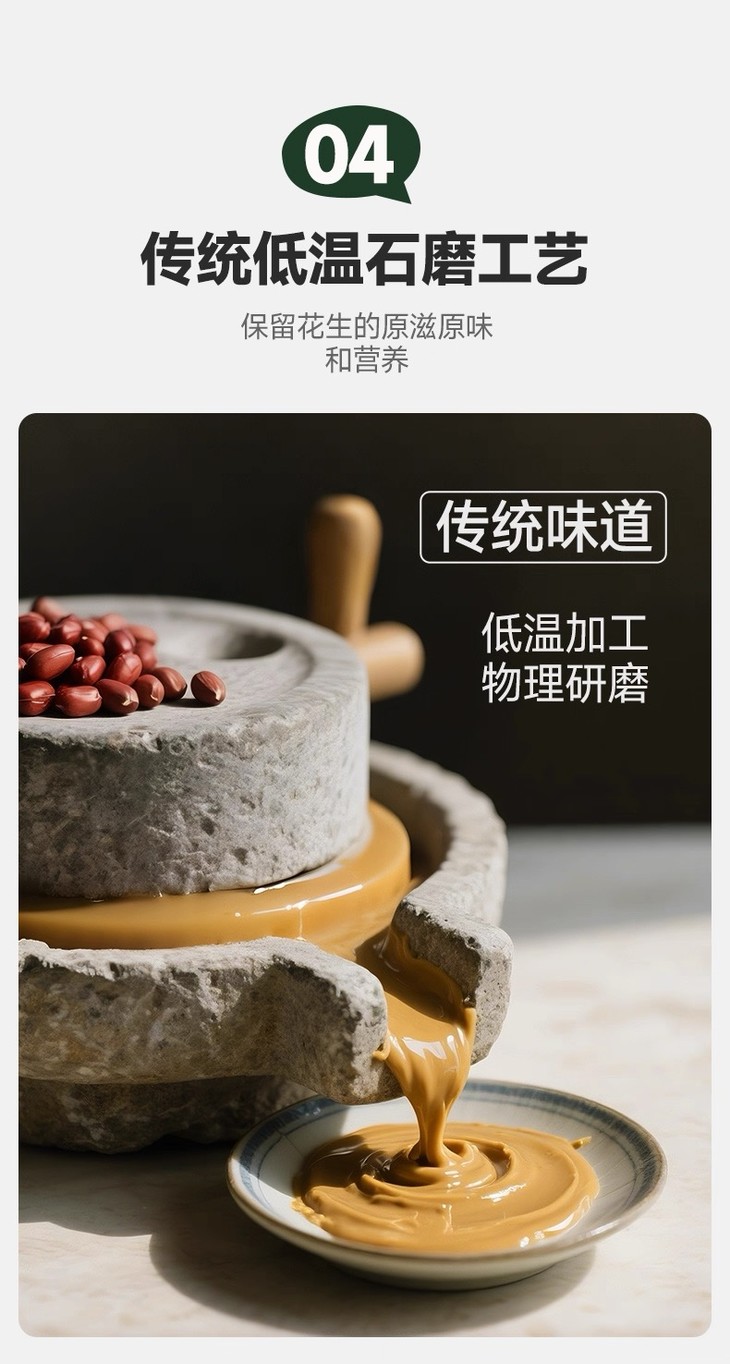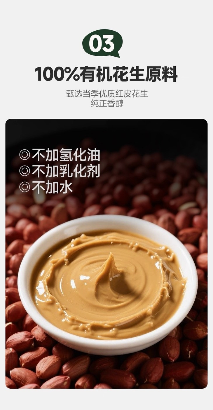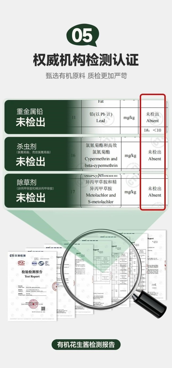 林小生有机花生酱最让人放心的就是它的原料了,甄选当季优质红皮花生,遵循有机种植标准,从源头禁止使用化学合成的农药、化肥、生长调节剂,保证原料天然纯净。再看配料表,干净到只有花生仁,不添加氢化油、乳化剂、防腐剂,更没有油和蔗糖,满满都是"0添加"的诚意。品牌更是采用低温石磨研磨工艺,石磨转速低,摩擦产生的热量少,研磨温度通常控制在50℃以下,能最大程度保留花生的天然香气和营养成分,避免高温氧化破坏风味,且过程不添加任何化学物质,让花生酱味道更加纯正自然。产品更是通过多重权威认证,包括中国有机认证、英国BRCGS食品安全全球标准认证、犹太洁食(KOSHER)认证及清真(HALAL)认证,品质值得信赖。重金属铅、杀虫剂(氯氰菊酯、高效氯氰菊酯)、除草剂(异丙甲草胺和精异丙甲草胺)也都均未检出,食用更安心。