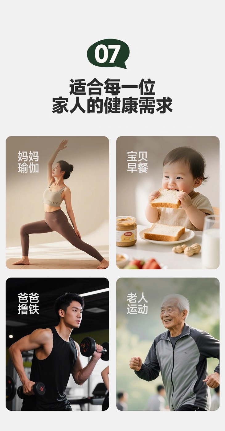 花生酱高蛋白、低热量,每勺仅含29大卡,健身时抹在全麦面包上当加餐,减脂期拌沙拉增味,都不用太为了热量超标焦虑。无论是需要补充营养的健身增肌人群、正在长身体的儿童青少年,还是注重健康饮食的中老年人,都能适量吃吃,让这份纯粹的花生香成为日常饮食里的小确幸!