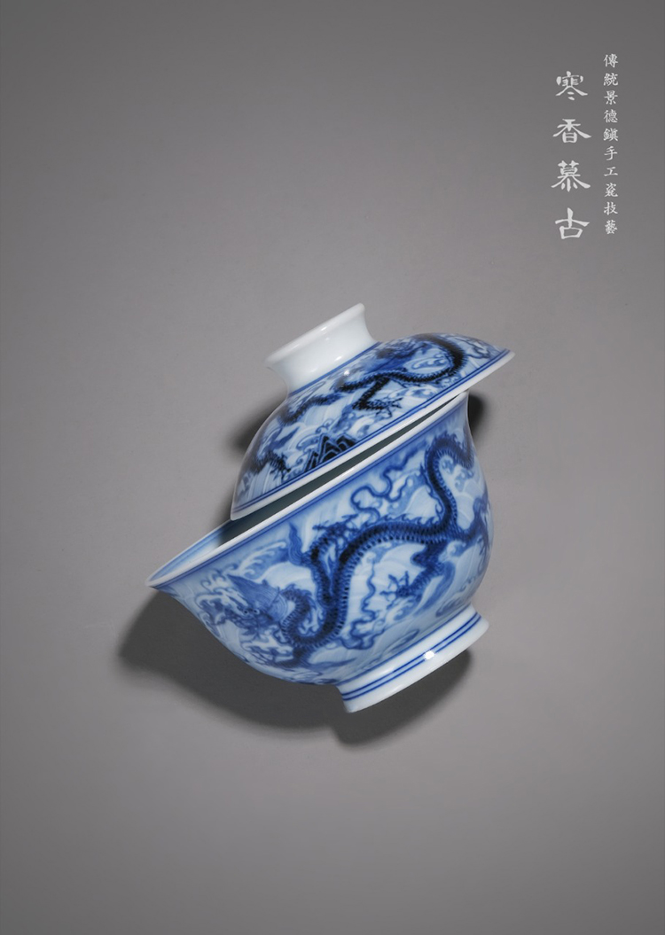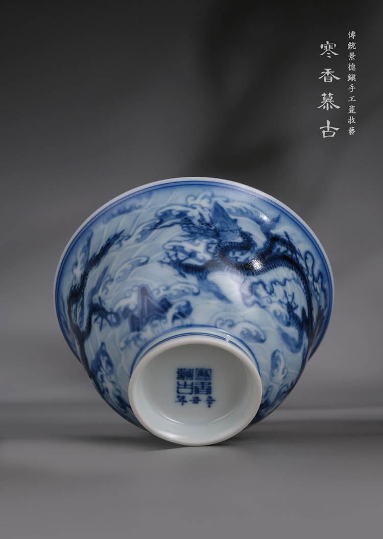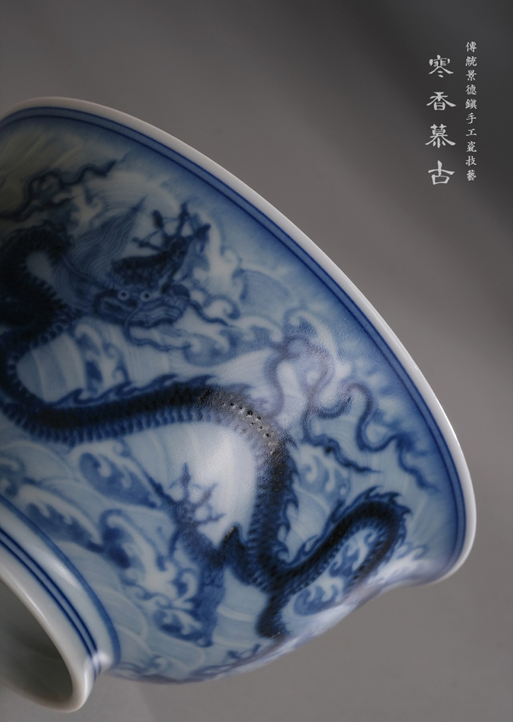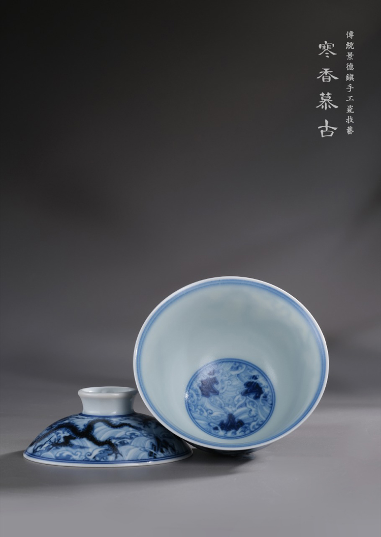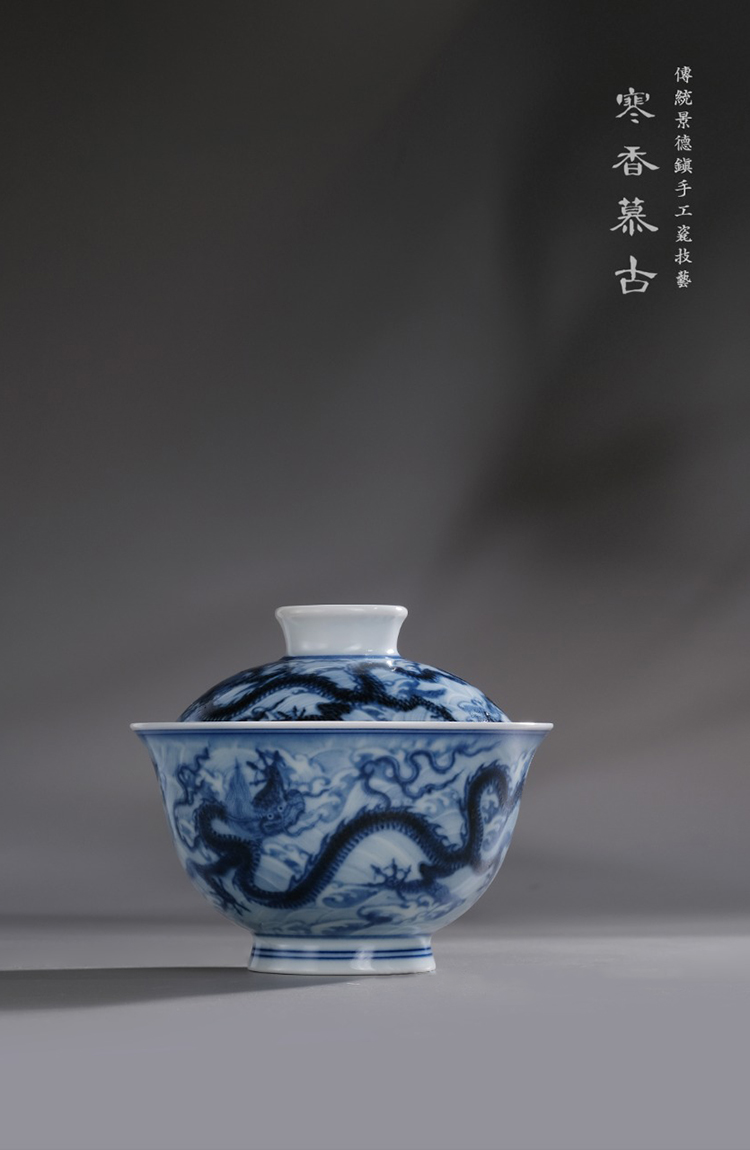 寒香慕古元明青花糯米釉双龙纹海水江涯纹盖碗(缺货)