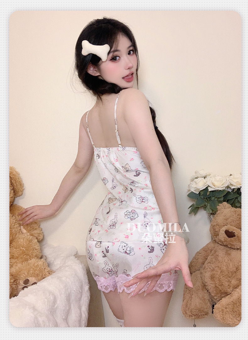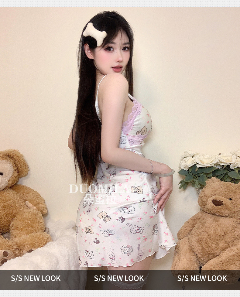 【送蕾丝袜❗性感低领碎花吊带裙】卡通小萌物面料,蕾丝+蝴蝶结可爱俏皮,收腰设计展现性感曲线,大码蕾丝睡裙可外出床上挑逗睡衣家居服QQ