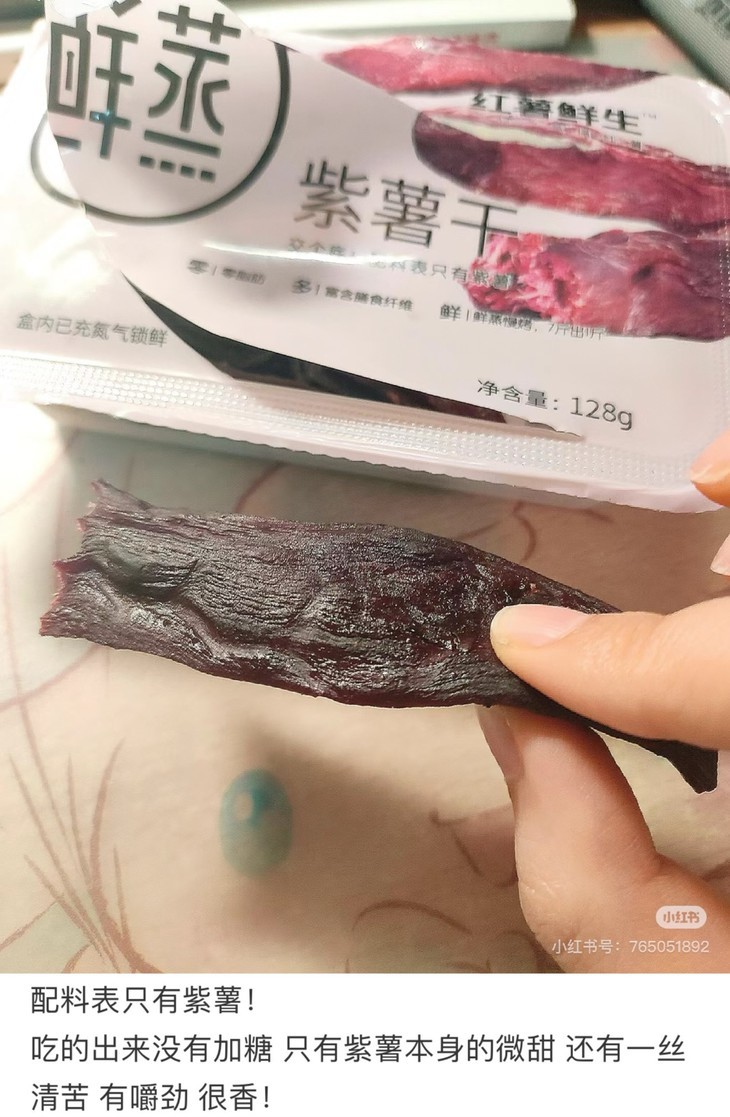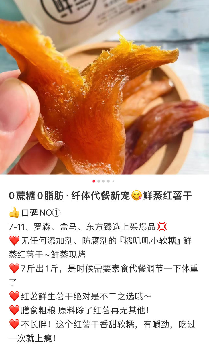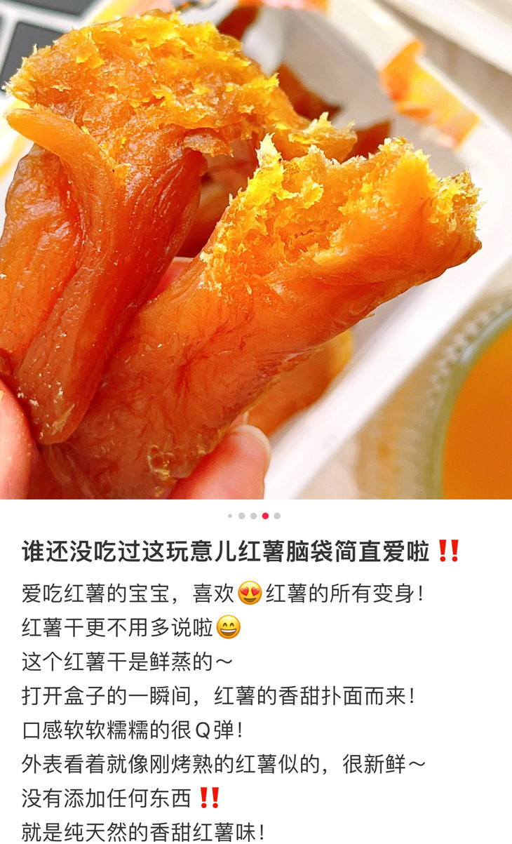 小时候家里经济一般,所以零食很少,但是地瓜干真的是我记忆里又便宜又美味的小零嘴了。奶奶以前经常做,还摊在门口晒着时,我就偷着吃,那种还没晒很干软软的时候味道蕞好了!但是长大之后就很少吃到小时候那种味道了,不是太干太老嚼不动,就是太湿太面没弹性,之前也试吃过很多款,各种农家自制什么的,都没这款鲜蒸地瓜干好吃,包装很好,闻起来也更有小时候的味道!