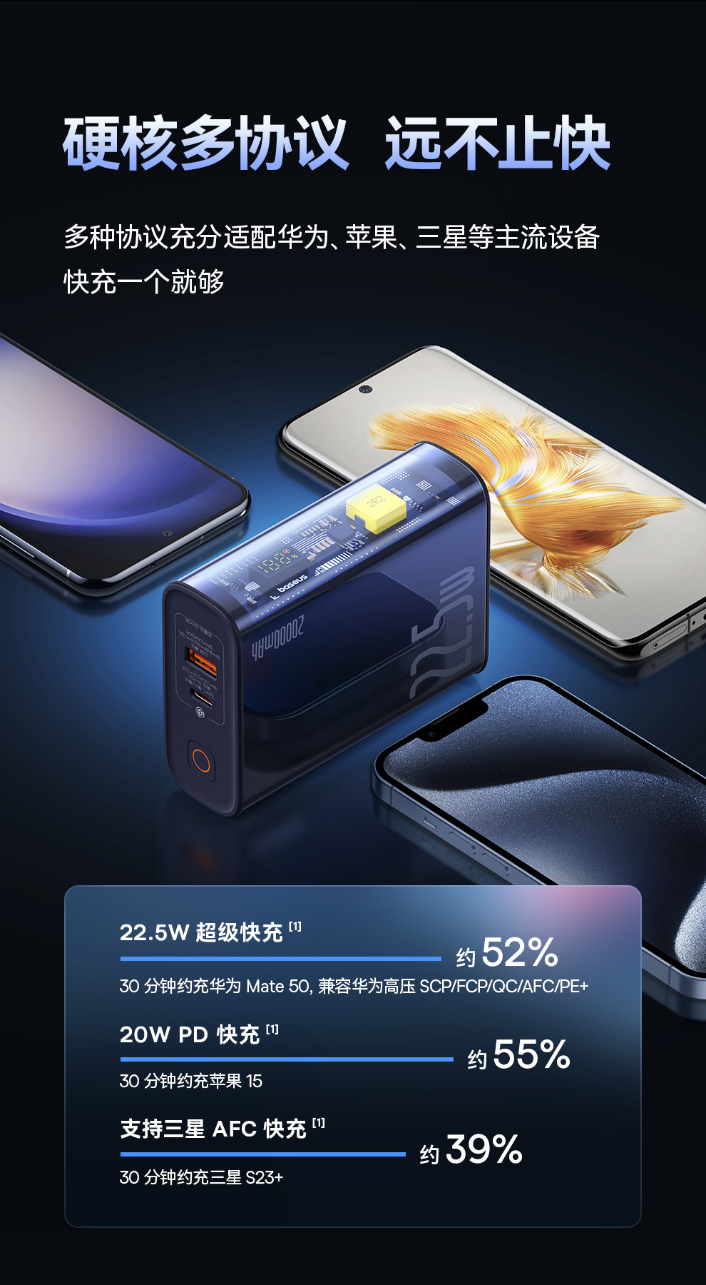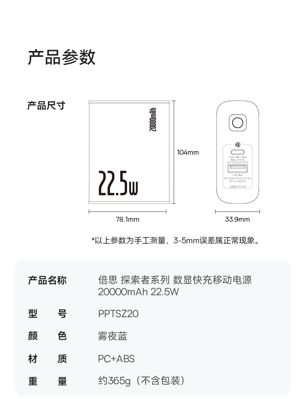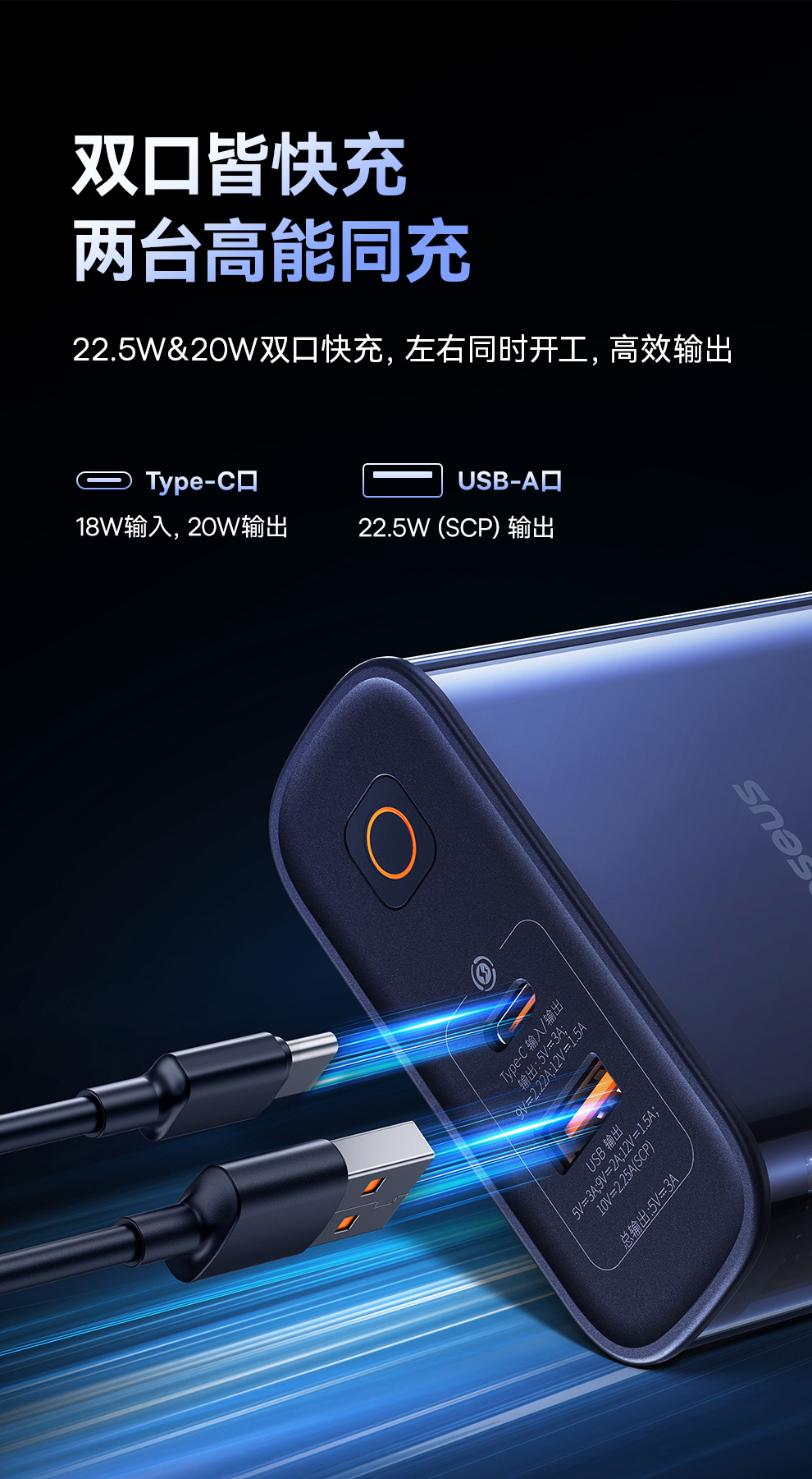倍思 探索者系列 数显快充移动电源10000mAh/10000mAh 22.5W 雾夜蓝
