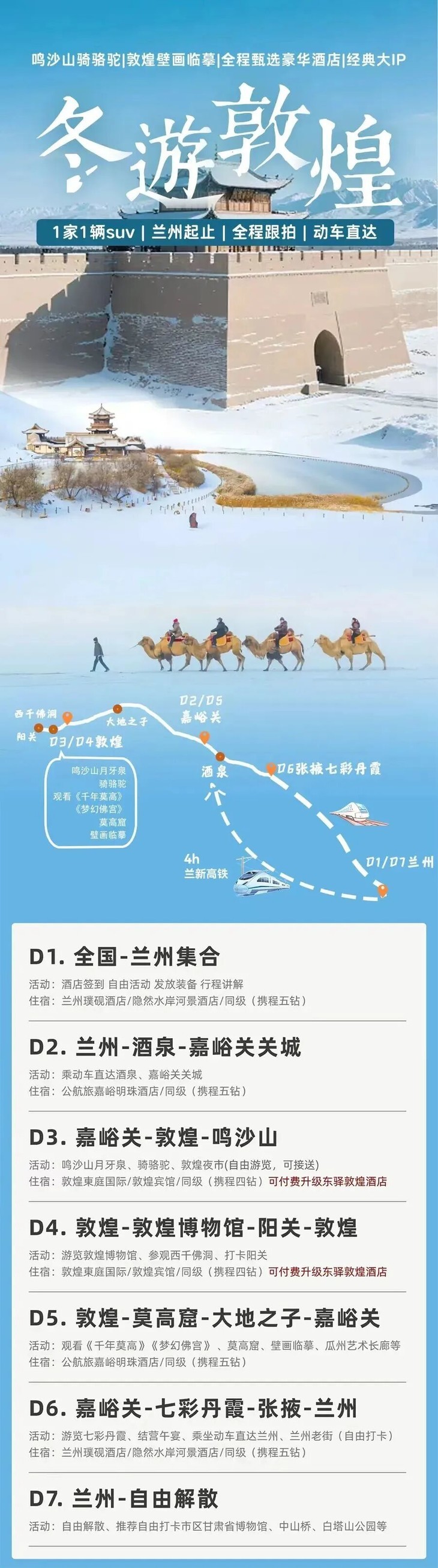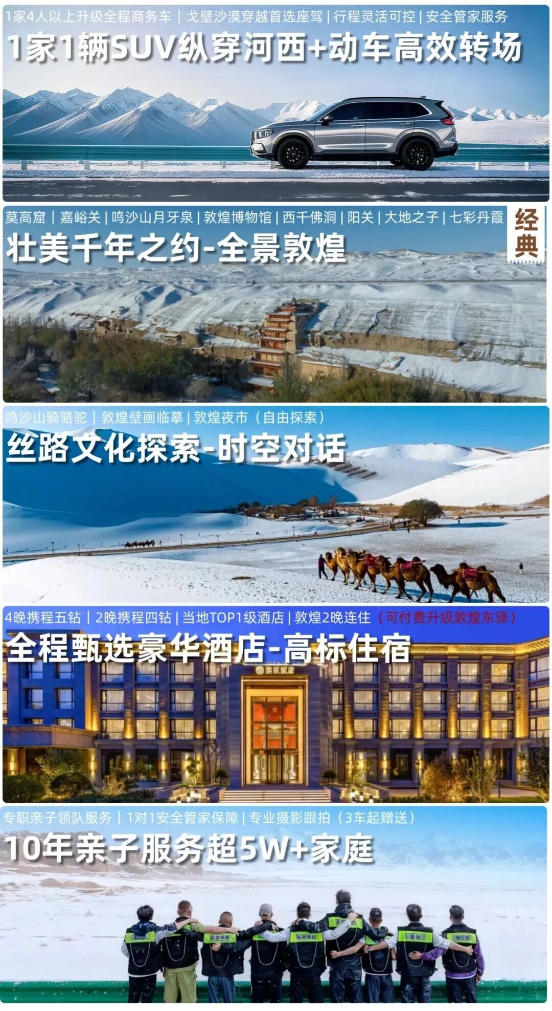 这个冬天,1家1车,全程管家服务,驾驶SUV纵穿河西走廊,乘坐动车高效转场,既可以带孩子潮酷出行, 穿越戈壁沙漠,又能省去奔波,将8小时车程直接缩短至4小时,开启一段舒适且震撼的冬日敦煌之旅。