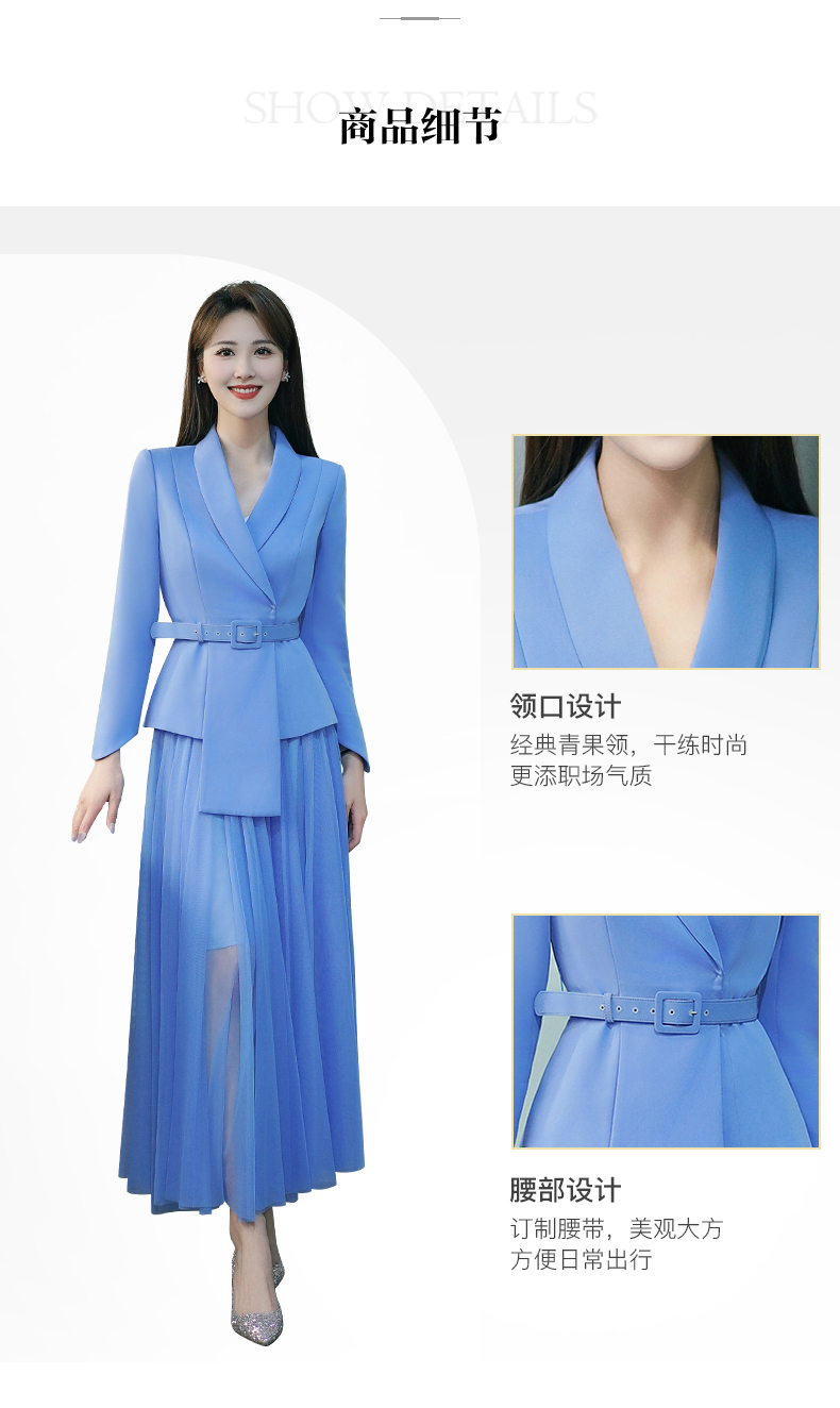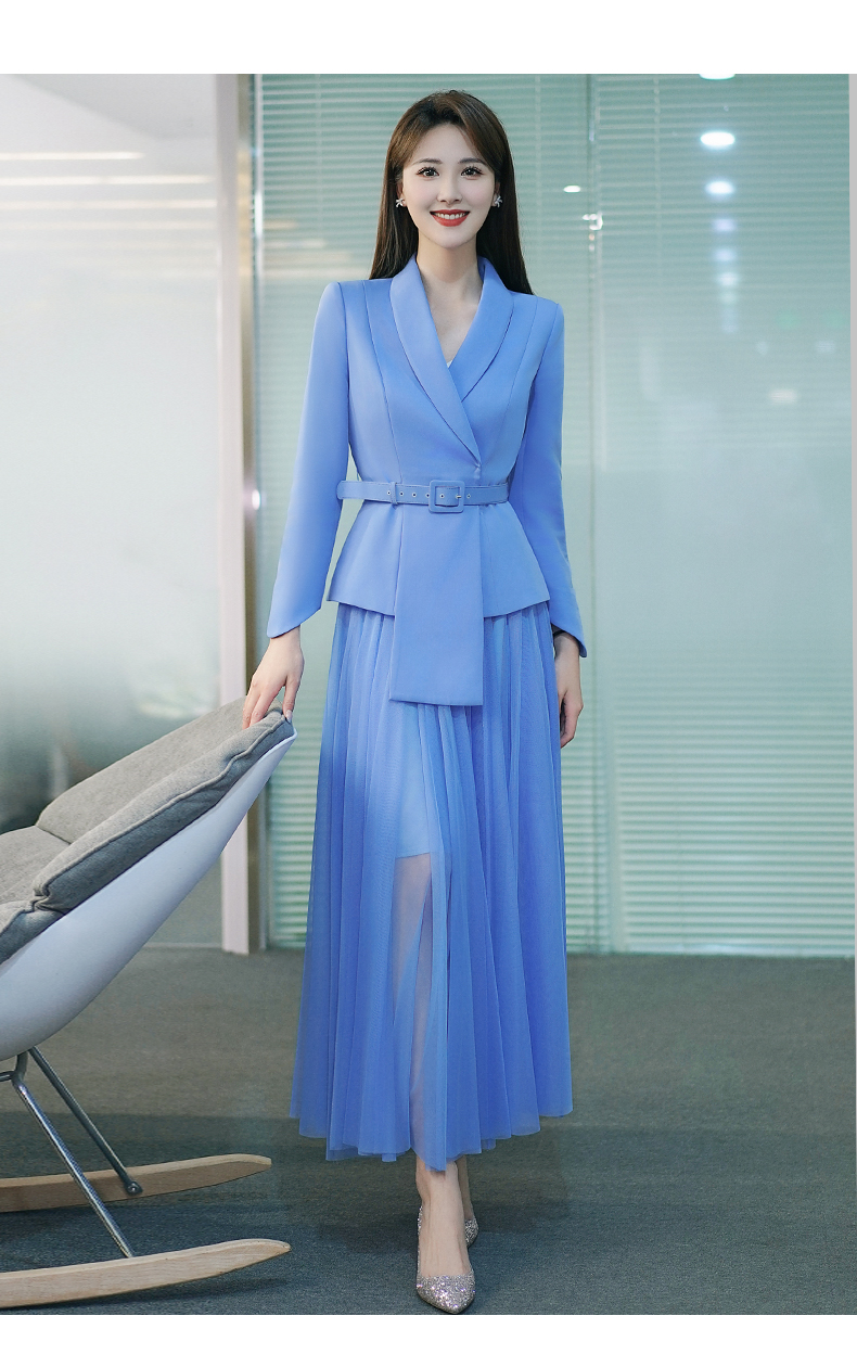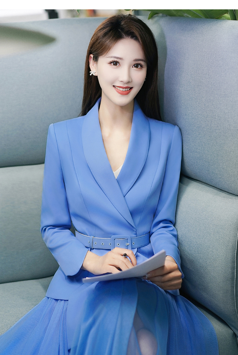 高端时尚蓝色西装纱裙套装绑带西服播音艺考主持人职业女装套裙