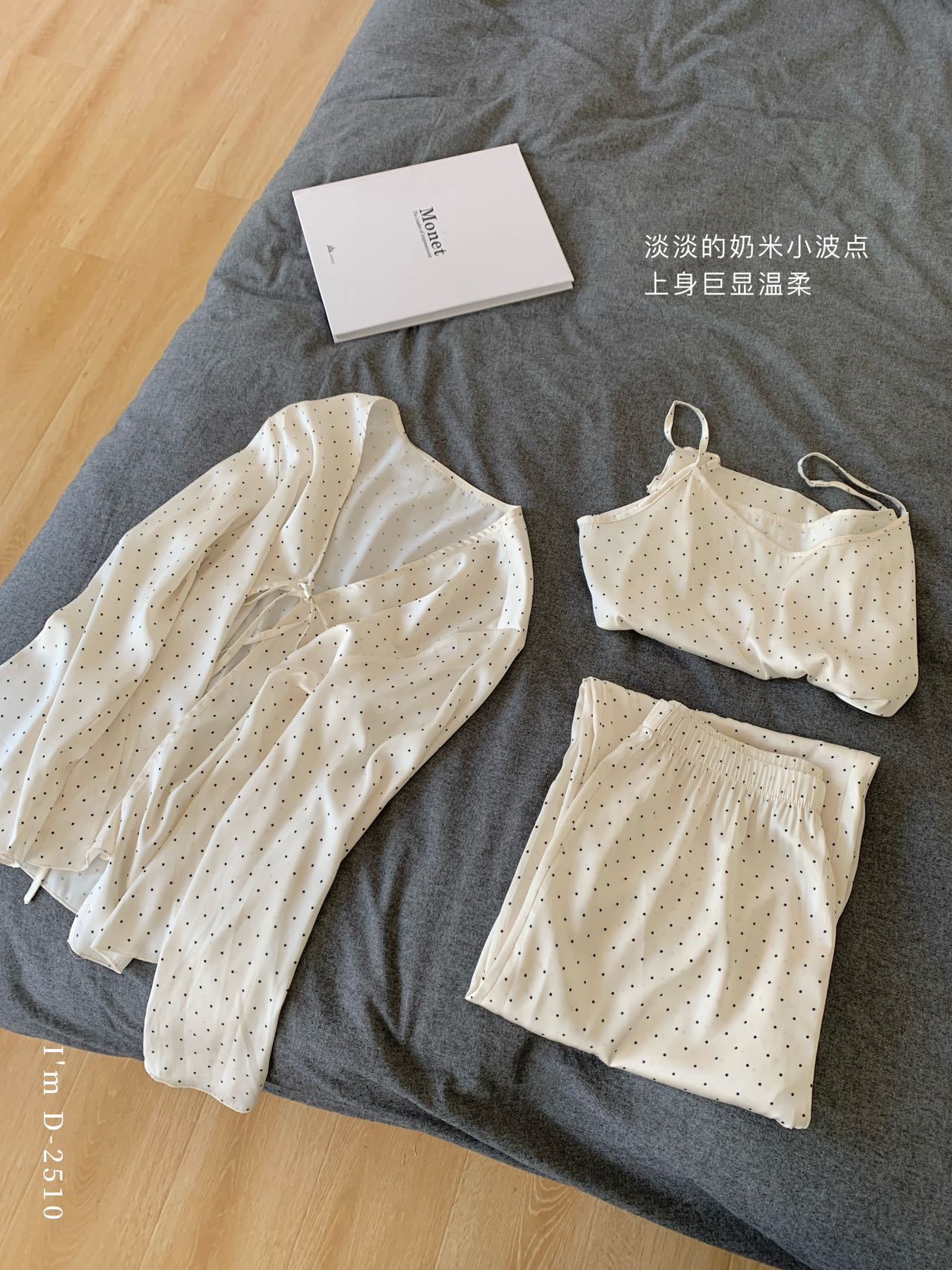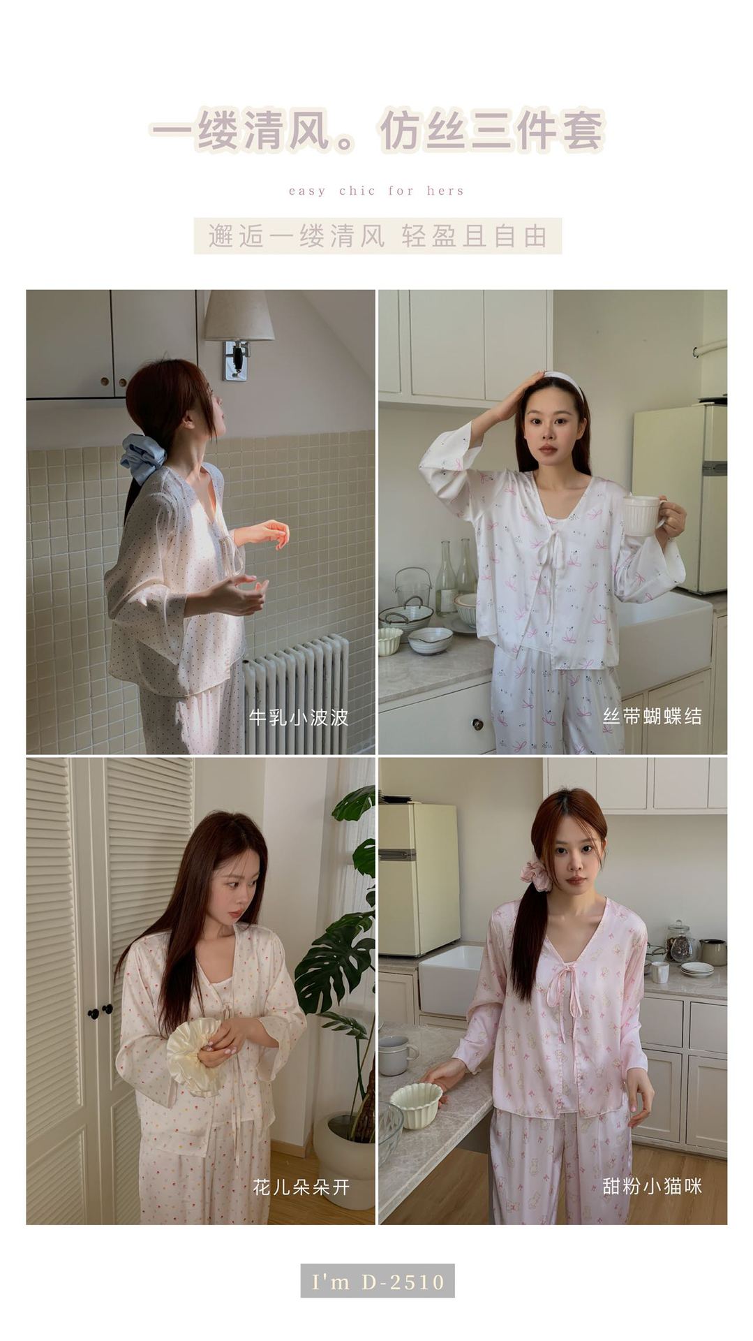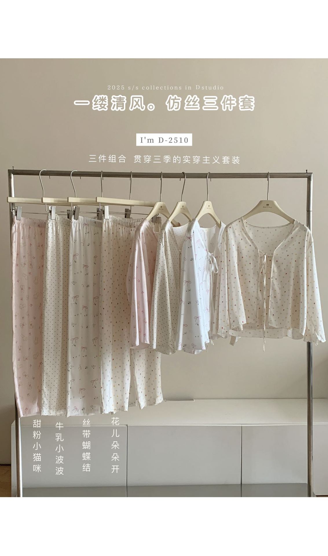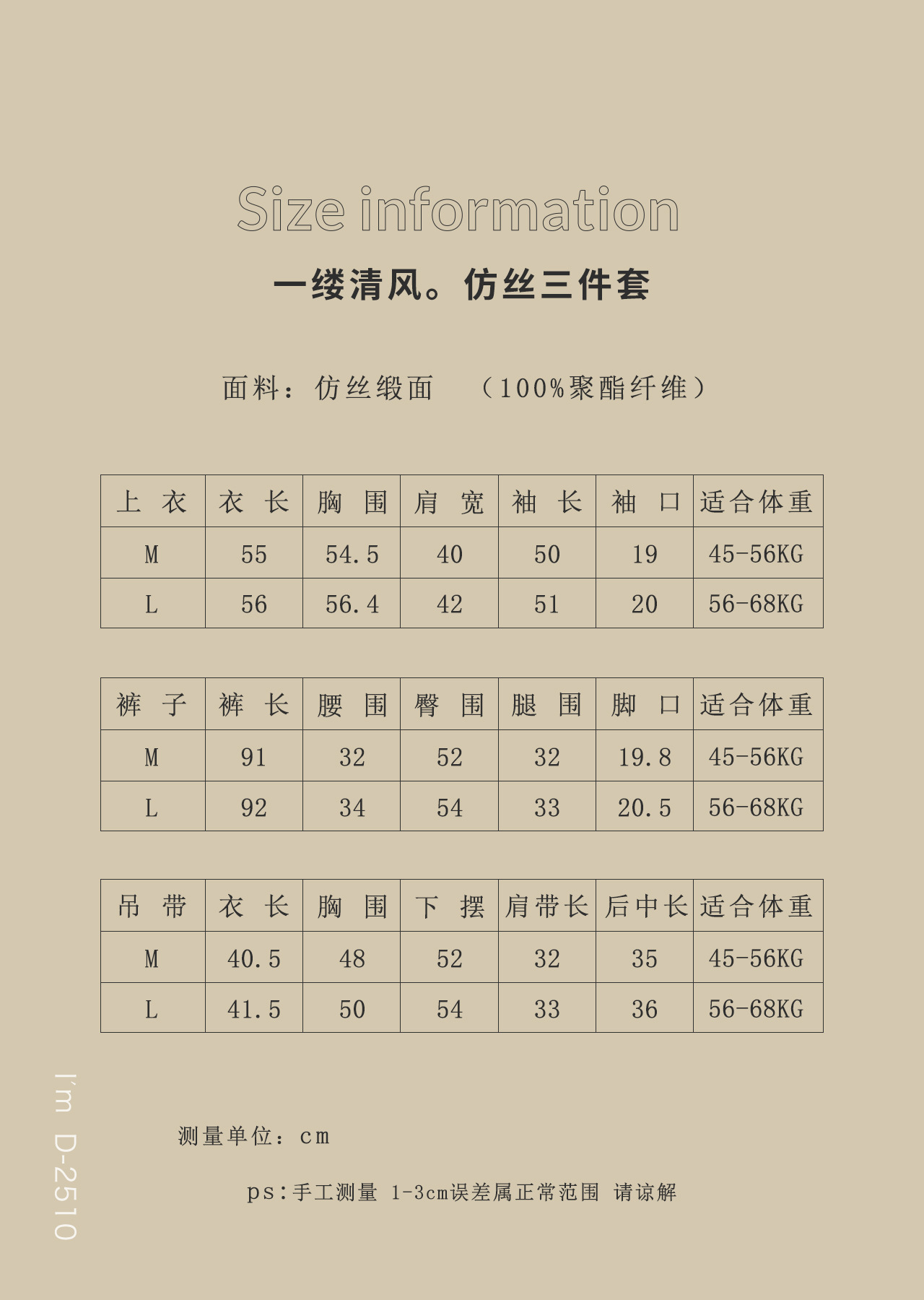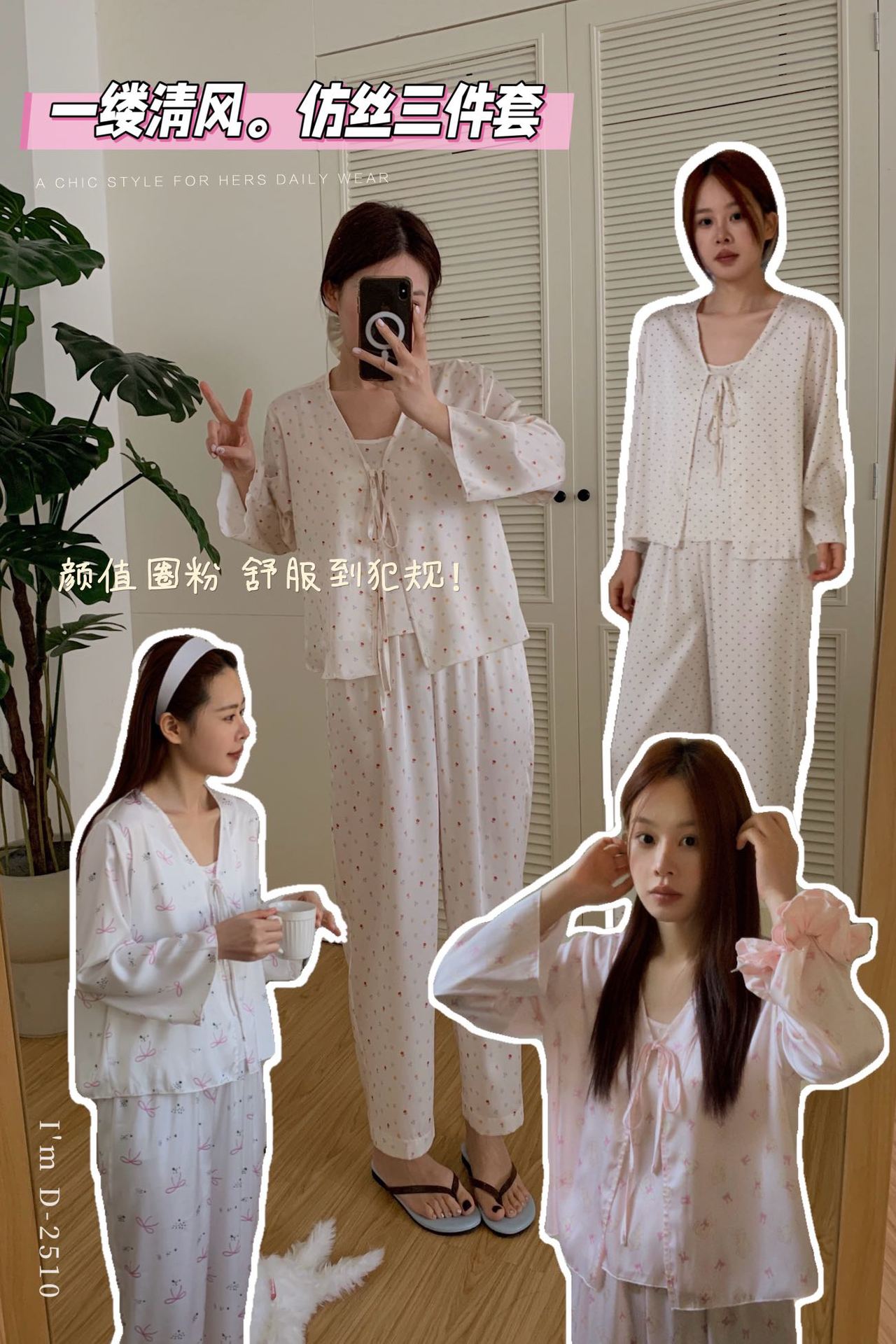 【一缕清风】2025春夏新款仿丝三件套家居服套装女 吊带+长袖+长裤 可外穿休闲套装睡衣