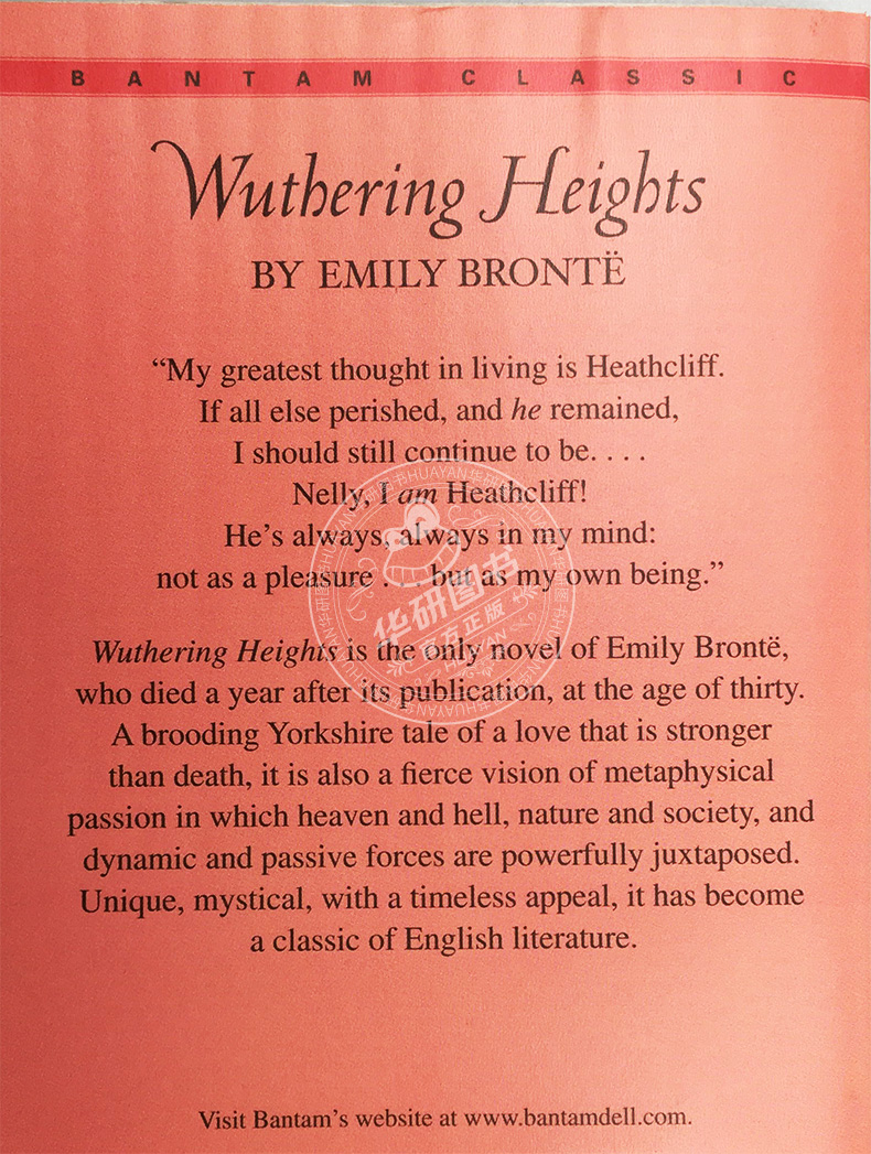Wuthering Heights《呼啸山庄》是英国女作家勃朗特姐妹之一艾米莉·勃朗特的作品,是19世纪英国文学的代表作之一,世界十大文学名著之一,被誉为“英国文学史上震撼人心的奇特小说”。英国知名小说家毛姆曾评论:“我不知道还有哪一部小说,其中关于爱情的痛苦、迷恋、残酷、执着,曾经如此令人吃惊地描述出来。”