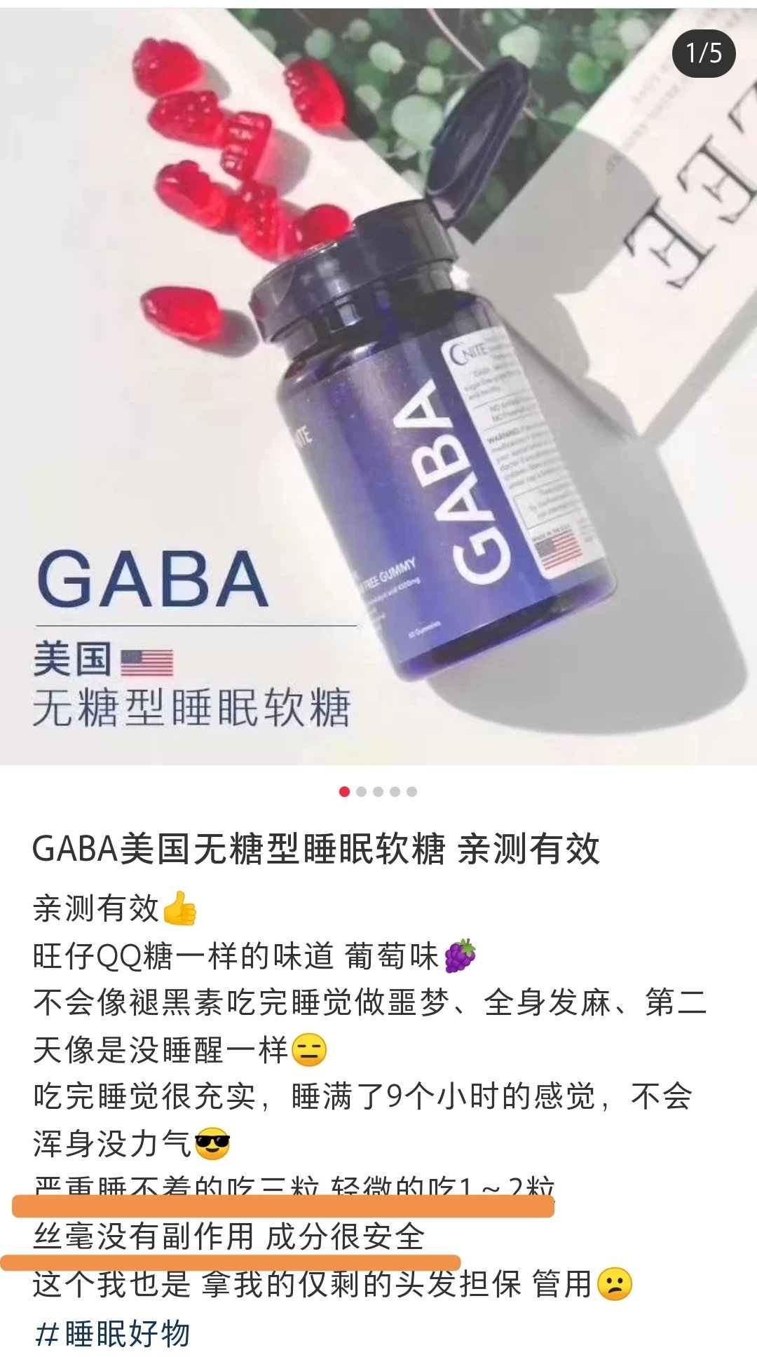 ▪️GABA睡眠软糖它是专为失眠研发的睡眠软糖,由世界公认的天然睡眠氨基酸GABA搭配缬草、薰衣草、酸枣仁制作而成,原材料天然萃取,10分钟就能被人体吸收,激发睡眠,由浅至深。不添加任何睡眠激素,0副作用。