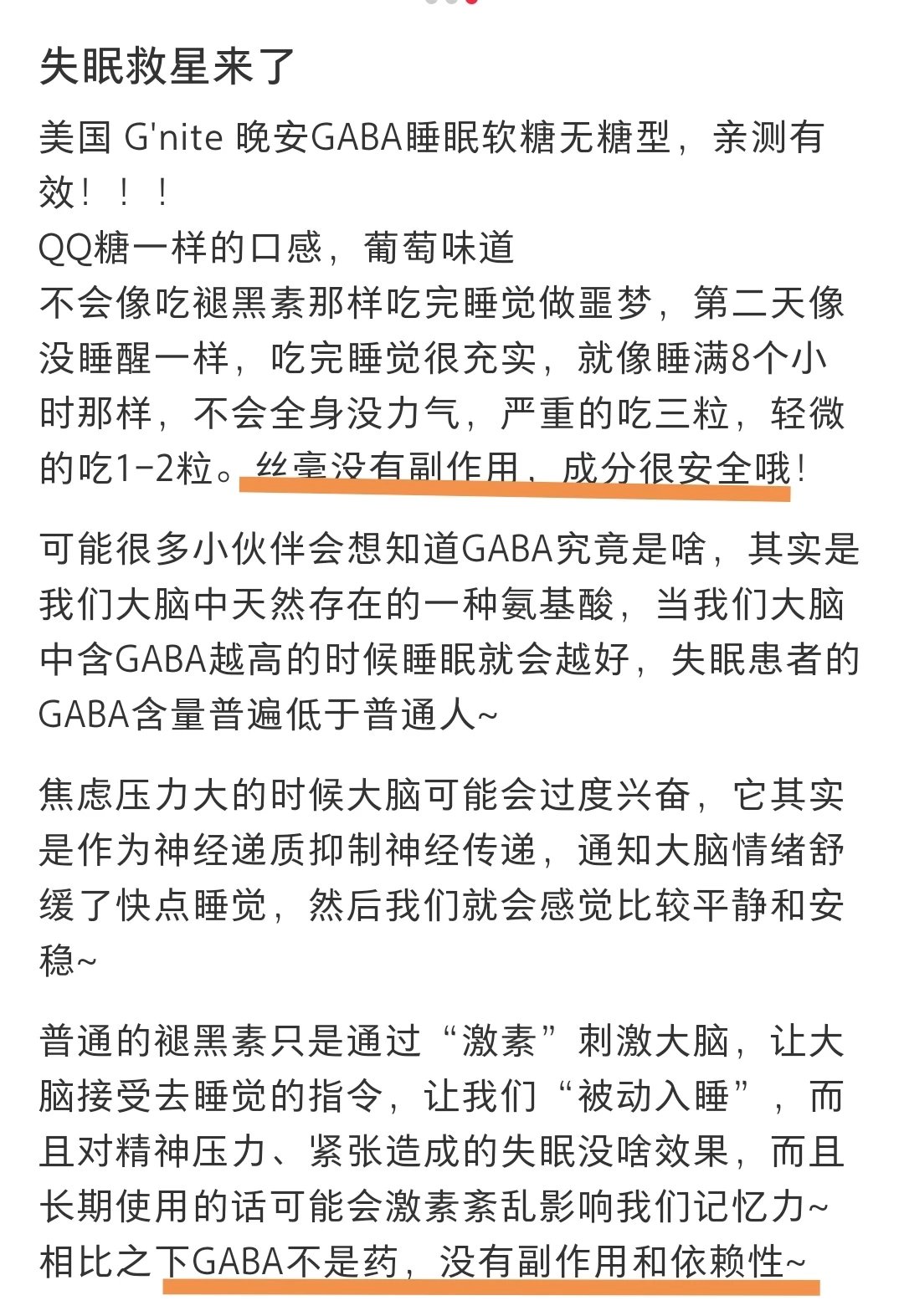 ·我仔细了解过它的成份 介绍 ,睡眠里糖不含褪黑素,用的目前zui安全助的眠成分之一GABA!简单来说是们我大脑本身就自会然产生的种一氨基酸,是然天的!可以安更全有效地解缓我们的压力焦和虑~