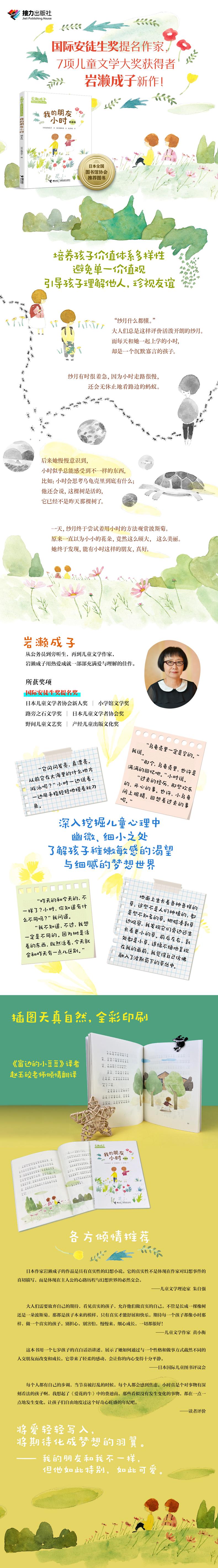 本系列是日本国际安徒生奖提名作家岩濑成子的作品精选集,收入了《爸爸的脸》《小小的海》《我的朋友小时》三部作品,致力于表现儿童内心的细腻情感,深入挖掘儿童心理中的幽微、细小之处。渴望与父亲平等交流的利里、发现了海的美好的嘉朗、停下来观察蚂蚁的小时……随着故事的展开,我们发现了故事中的主人公那些闪闪发光的特质——真诚、率真、珍视友谊。故事中的孩子们往往会经历一个童话般的成长性事件,之后便学会了“慢慢长大”的妙处,真正做回了自己。作者运用写实的、逼真的描写手法,找到了孩子的精神世界与幻想世界的内在联系,并用适时的留白与散文化的诗意表达,呈现出隽永悠长的余韵。《我的朋友小时》“纱月什么都懂。”大人们总是这样评价活泼开朗的纱月。而每天和她一起上学的小时,却是一个沉默寡言的孩子。纱月有时很沮丧,因为小时走路很慢,还会无休止地看路边的一排蚂蚁。但后来,纱月慢慢意识到,小时似乎总能感受到不一样的东西,比如......