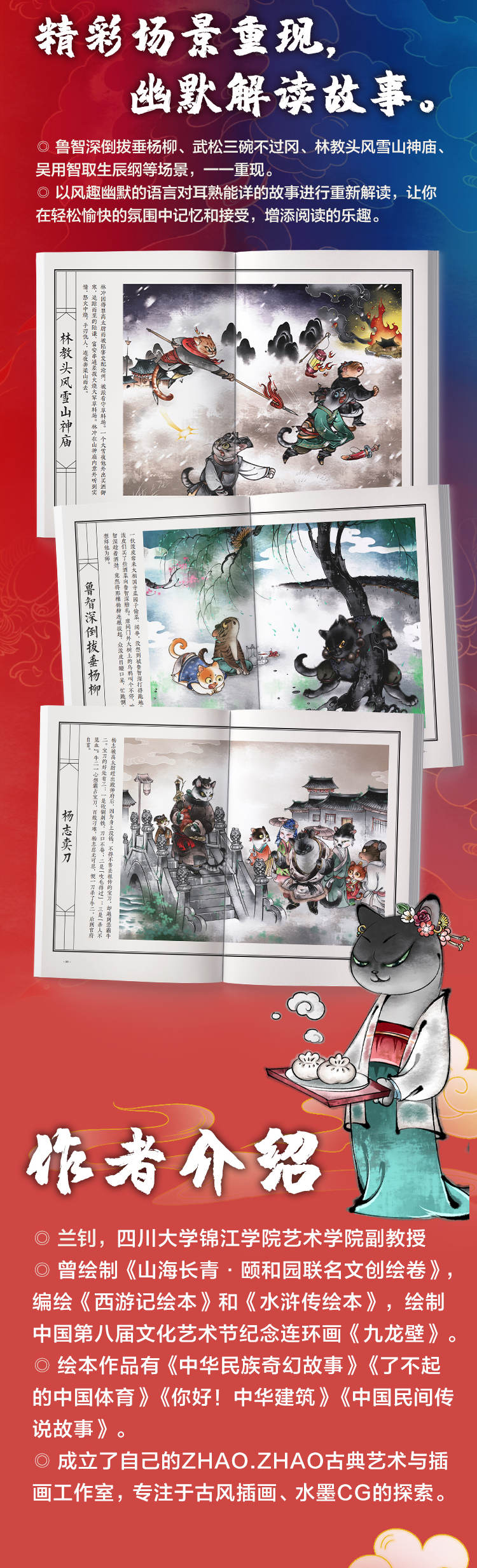 兰钊,四川大学锦江学院艺术学院副教授。曾绘制《山海长青·颐和园联名文创绘卷》,编绘《西游记绘本》和《水浒传绘本》,绘制中国第八届文化艺术节纪念连环画《九龙壁》,学术专著有《视觉传达与平面设计研究》,绘本作品有《中华民族奇幻故事》《了不起的中国体育》《你好!中华建筑》《中国民间传说故事》。成立了自己的ZHAO.ZHAO古典艺术与插画工作室,专注于古风插画、水墨CG的探索。