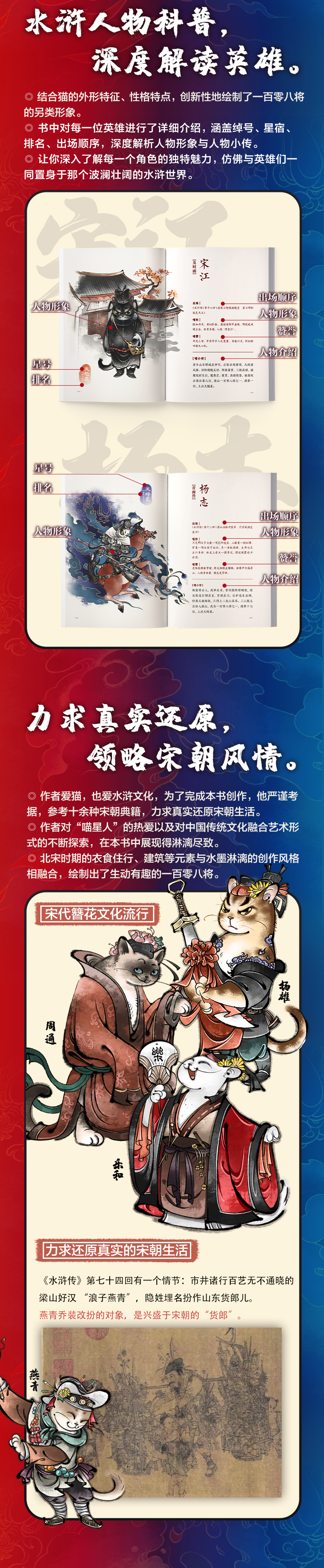 本书以中国古典文学名著《水浒传》为设计蓝本,根据《水浒传》中一百*八将的排名顺序,结合猫的外形特征、毛色、性格特点,创新性地描绘了一百*八将的另类形象。为了系统地展示一百*八将的形象特征,本书特绘制了多幅*水浒场景画面,如鲁智深倒拔垂杨柳、武松三碗不过冈、吴用智取生辰纲等,既重现了家喻户晓的故事情节,又融入了独特的艺术风格。 本书适合插画设计师、绘画爱好者,以及喜欢《水浒传》的读者阅读。