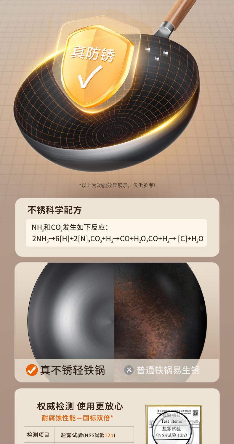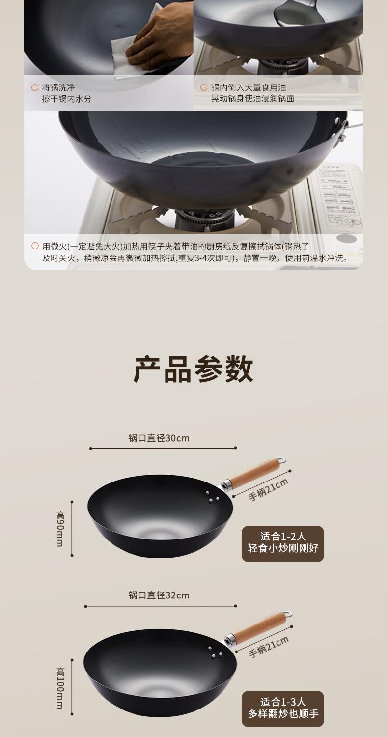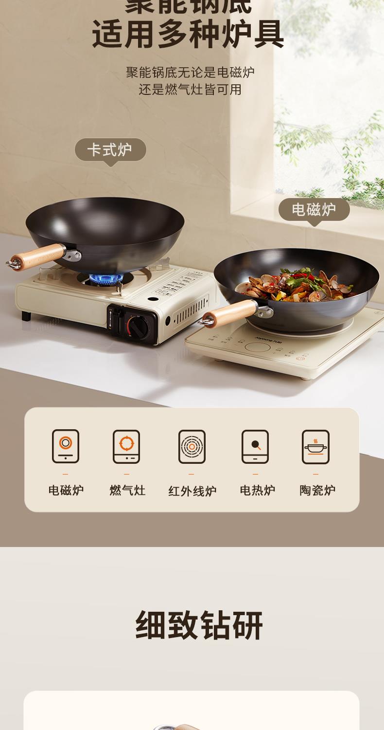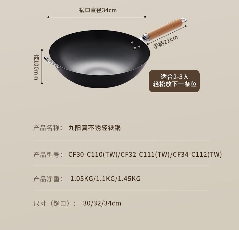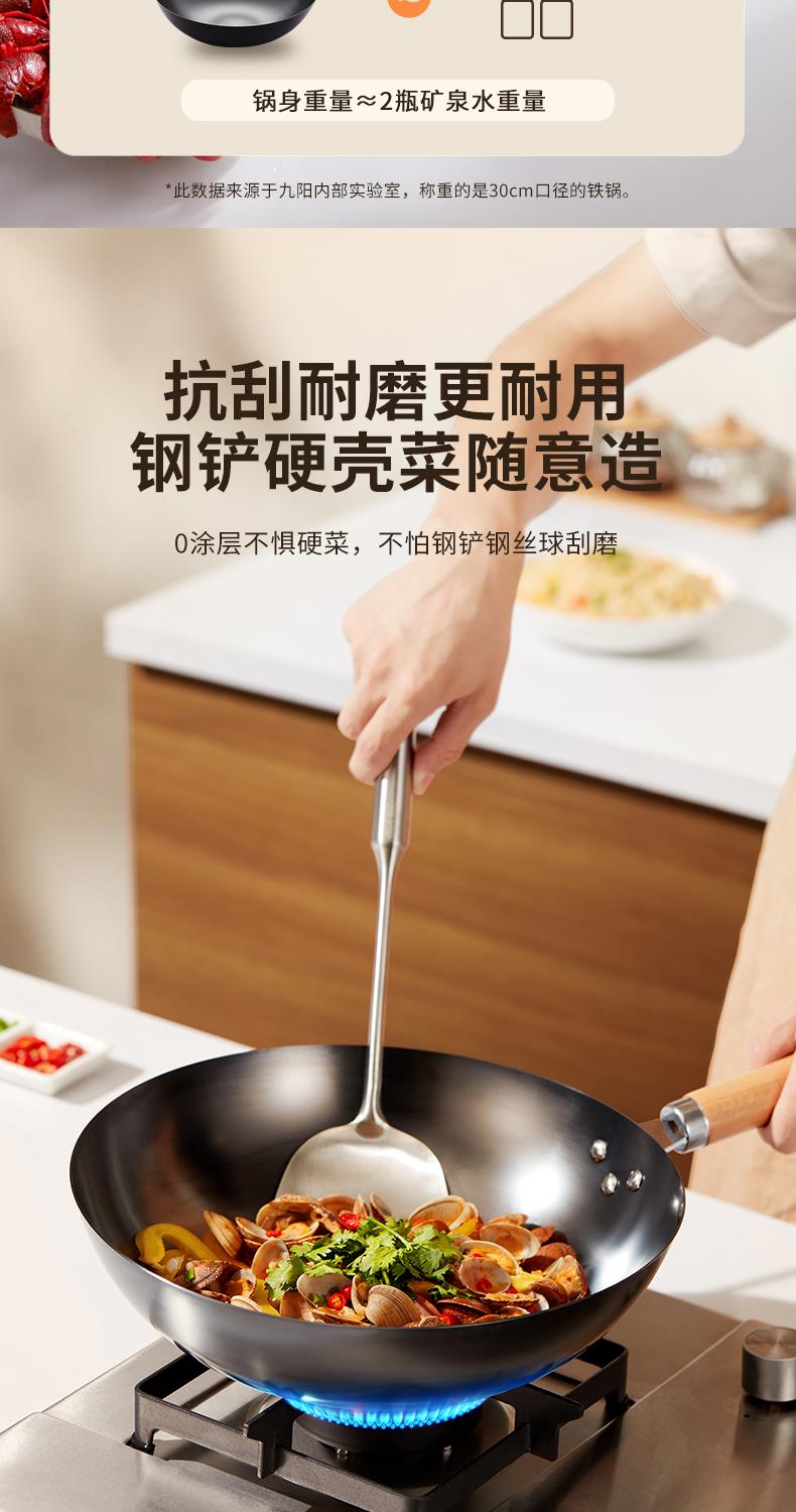 九阳铁锅精铁真不锈炒锅无涂层家用炒菜锅燃磁通用炊具老式大铁锅