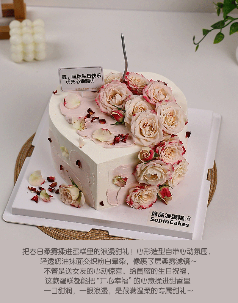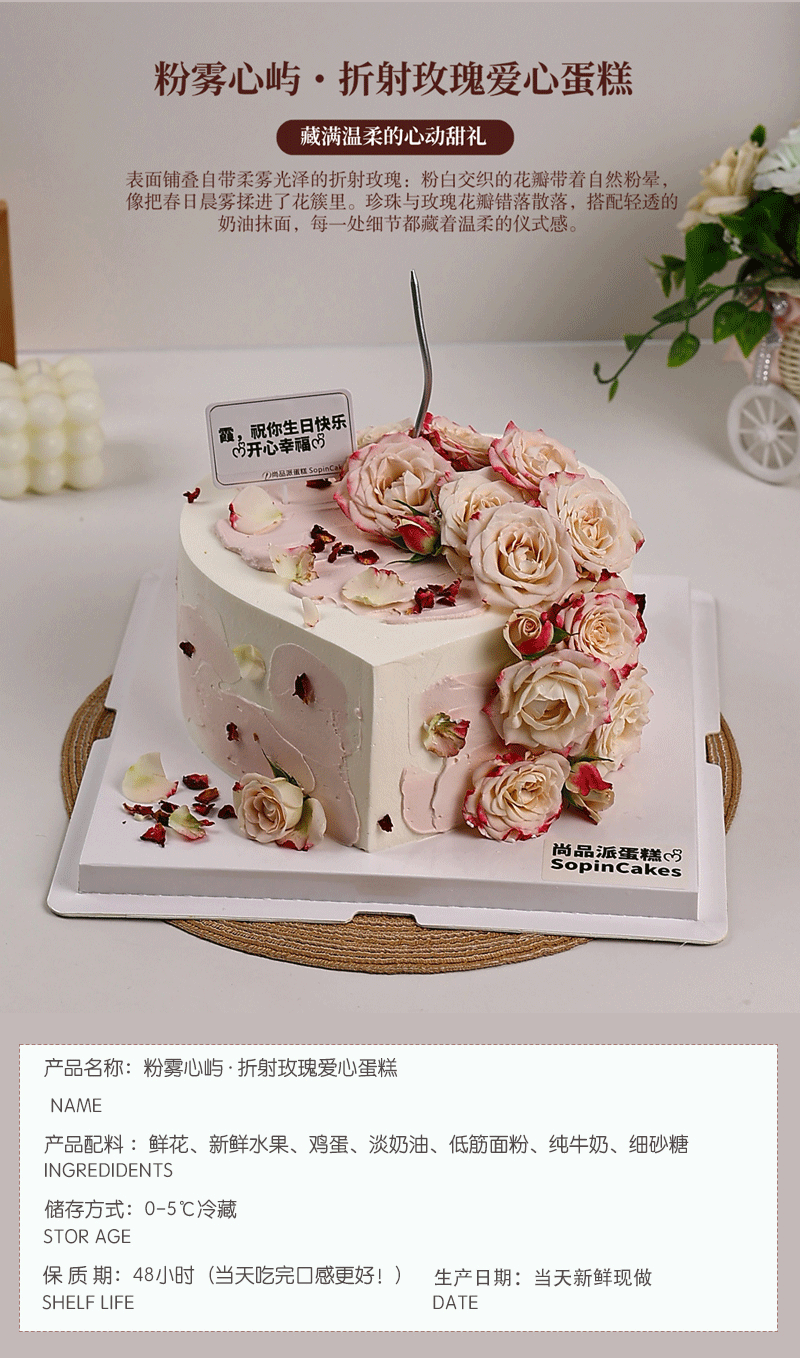 粉雾心屿 · 折射玫瑰爱心蛋糕 送女友闺蜜生日礼 温柔系浪漫鲜花奶油蛋糕【惠州】
