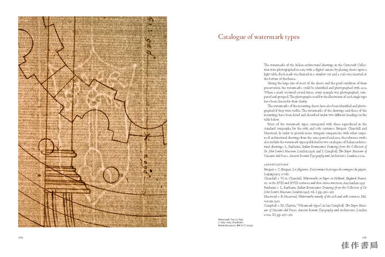 Italian Architectural Drawings proposes new attributions in the light of recent scholarship, based on close examination of the materiality of the drawings (paper, medium, technique, mounting). Comparative illustrations and a photographic catalog of the watermarks complete the volume.