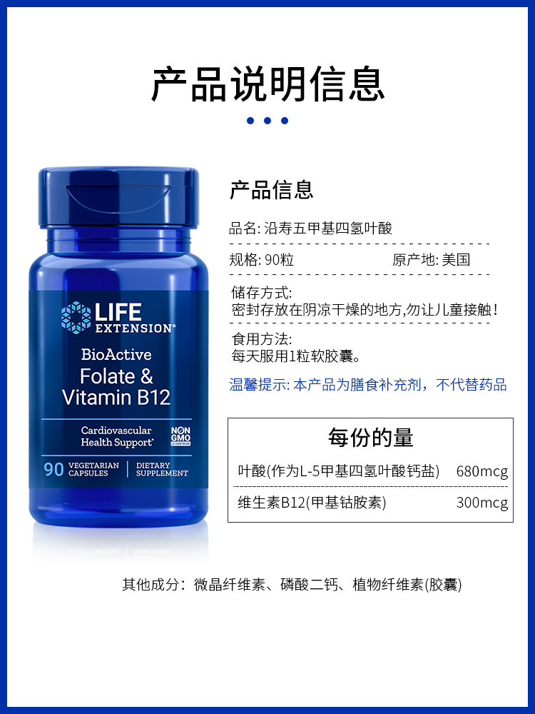 沿寿LIFE EXTENSION Folate&VitaminB12 五甲基四氢叶酸胶囊 90粒