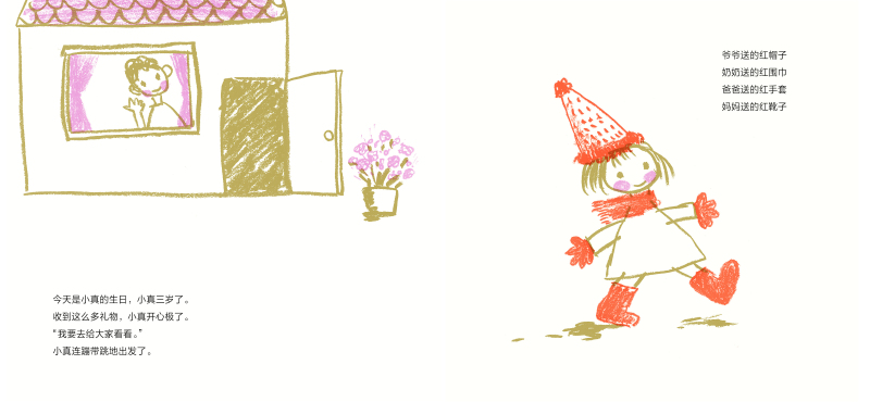 画风具有高辨识度,线条简单、笔触稚嫩,重复出现的红色培养孩子对色彩的感知力。主人公小真的装扮随着故事的发展而变化,图文合奏,富有趣味。