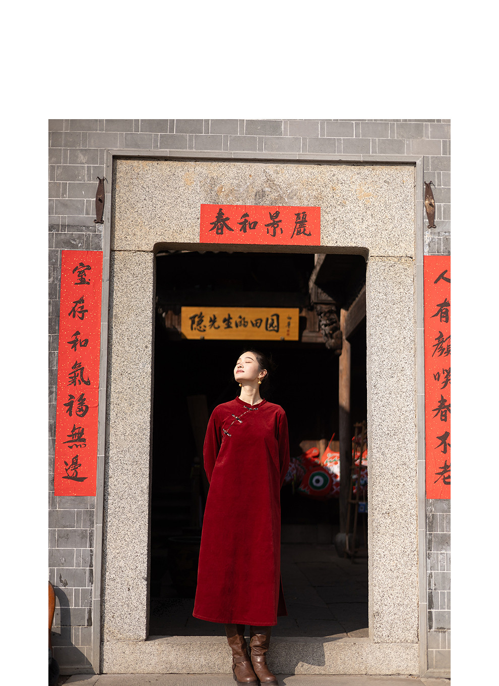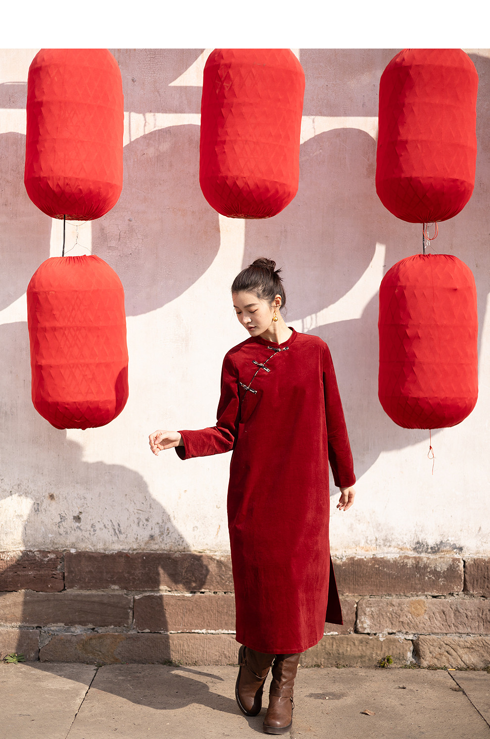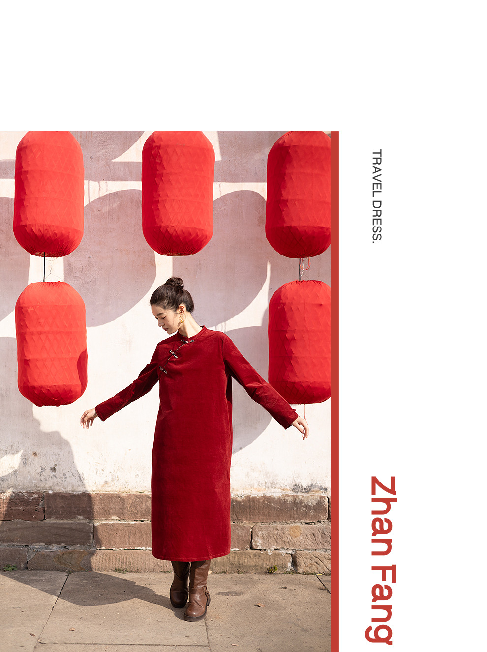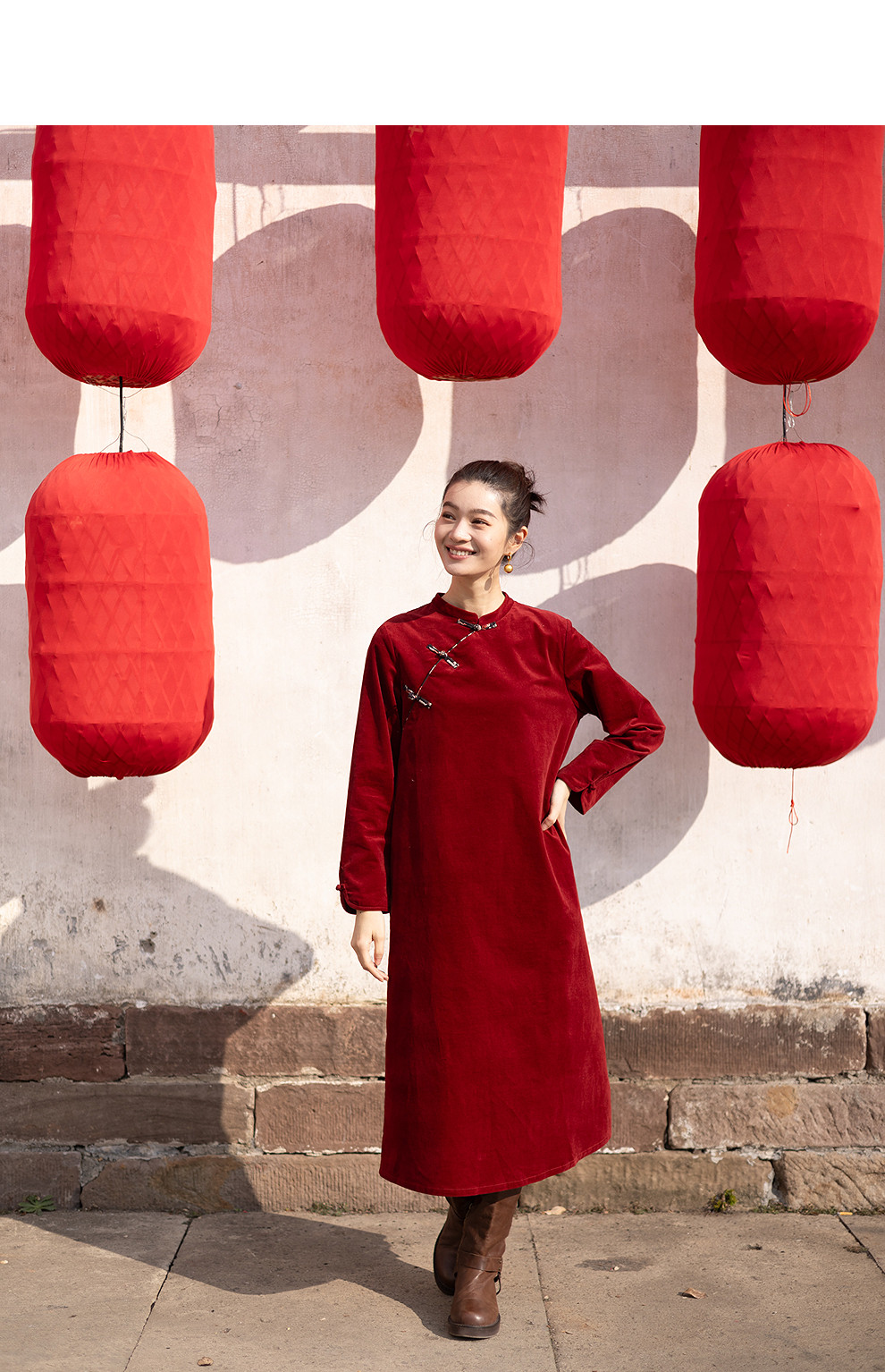 绽放039朵/新中式盘扣纯棉灯芯平绒长袖连衣裙冬新年红色文艺长裙