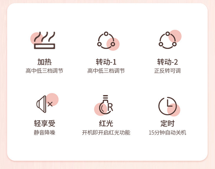 六大模式 | 模拟真人按摩力度,设计了六大档位。正转揉捏、反转揉捏等,可随心所欲。