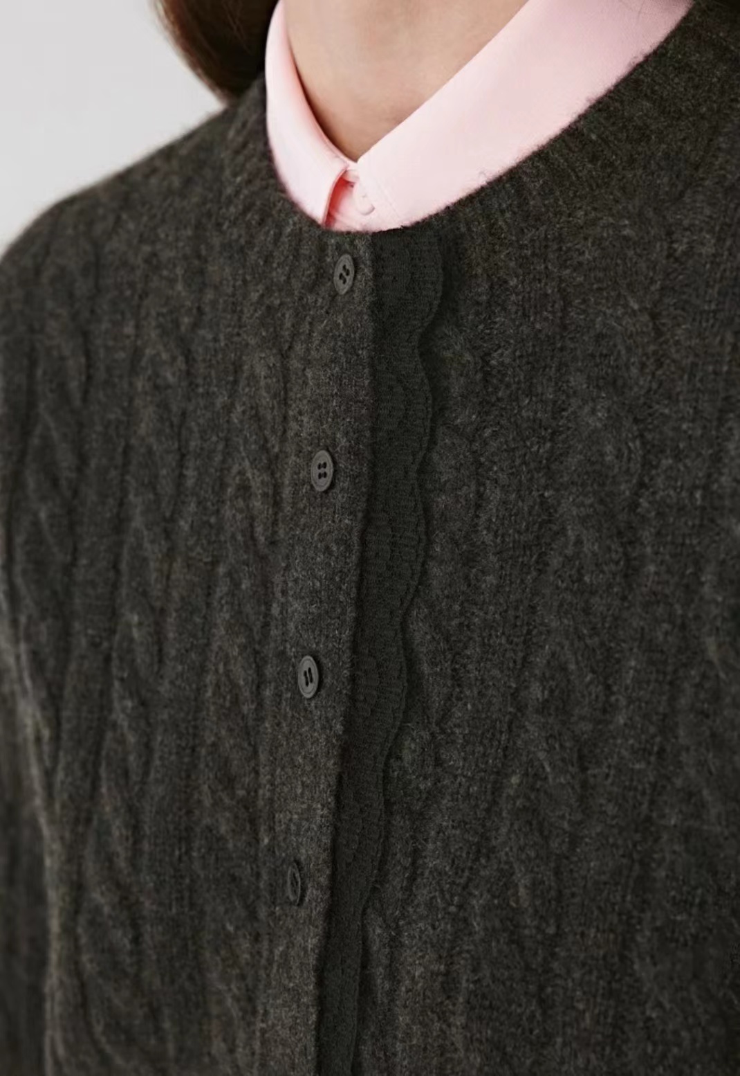 冬季新款精 致蕾丝花边拼接羊毛针织开衫外套2025秋冬新款!简约篙级蕾丝花边拼接,以蕾丝花边设计,搭配30%绵羊毛面料,敲保暖的!软糯亲肤细腻不扎身。衣襟处采用精 致的蕾丝花边作为饰边,打破了纯色针织外套的单调感,增添了一丝柔美与浪漫气息~大身绞花肌理设计,配合门禁蕾丝花边,增添精 致的细节层次。下摆和袖口罗纹拼接,有大身组织形成对比,并且收口设计,保暖效果更好!整体版型合身不紧绷,衣身线条干净,贴合身体曲线,单穿叠穿皆可轻松驾驭!以沉稳的黑灰色为主色调,低调且不失篙级感,这种颜色非常佰搭,能轻松与各种颜色的内搭和下装搭配,无论是白色T恤、黑色裙子还是深色裤子,都能营造出和谐的整体穿搭效果!让穿着者轻松展现简约与精 致并存的魅力,是衣橱中实用性与美观性兼具的B备单品~