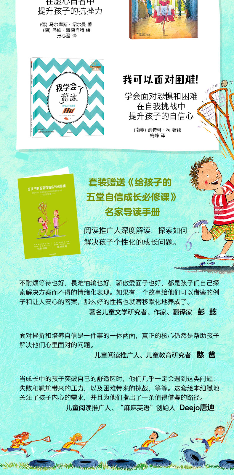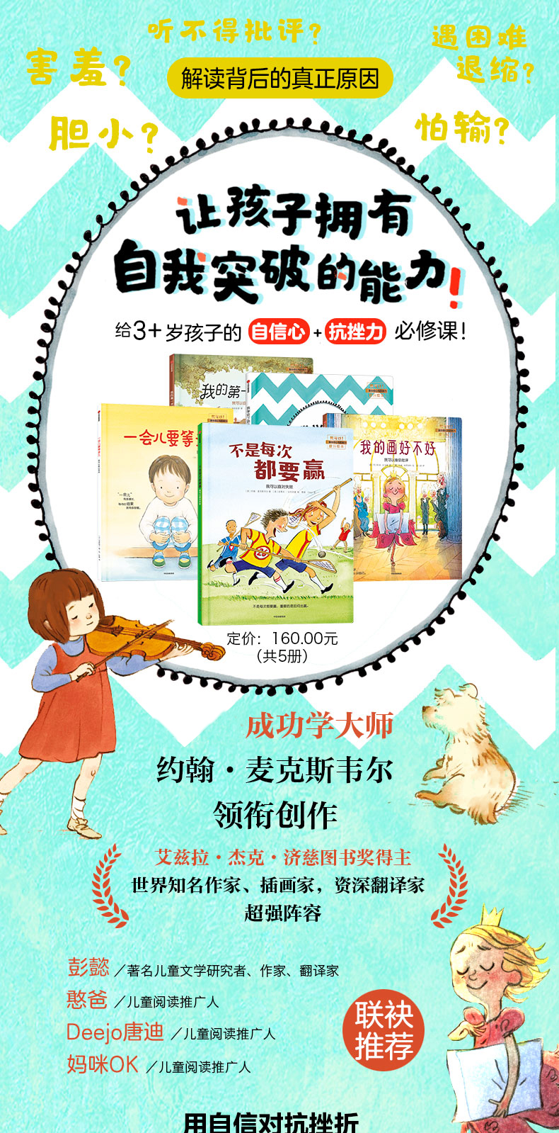 当成长中的孩子突破自己的区时,他们几乎会遇到这类问题:失败和尴尬带来的压力,以及困难带来的挑战,等等。这套绘本细腻地关注了孩子内心的需求,并且为他们指出了一条值得借鉴的路径。