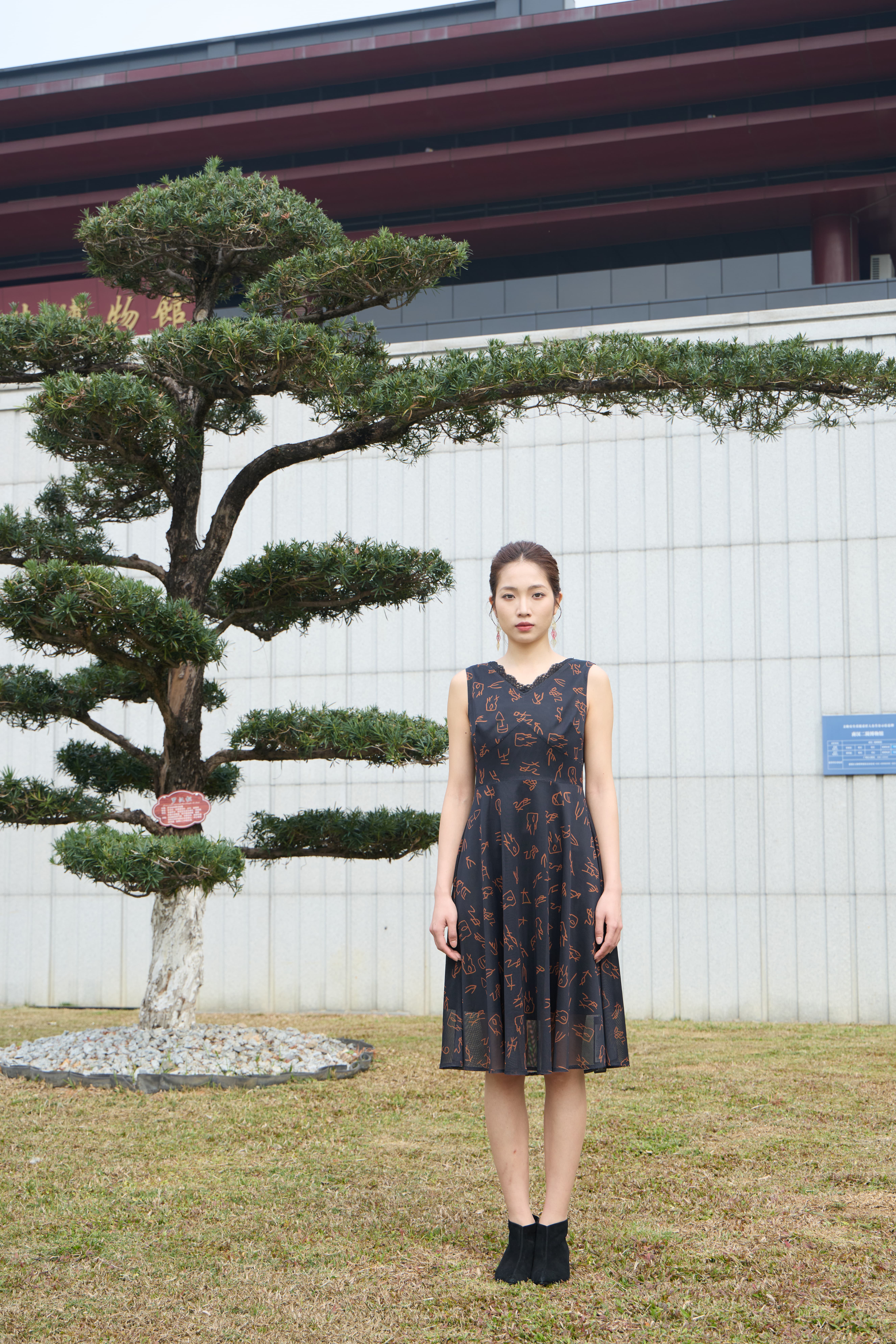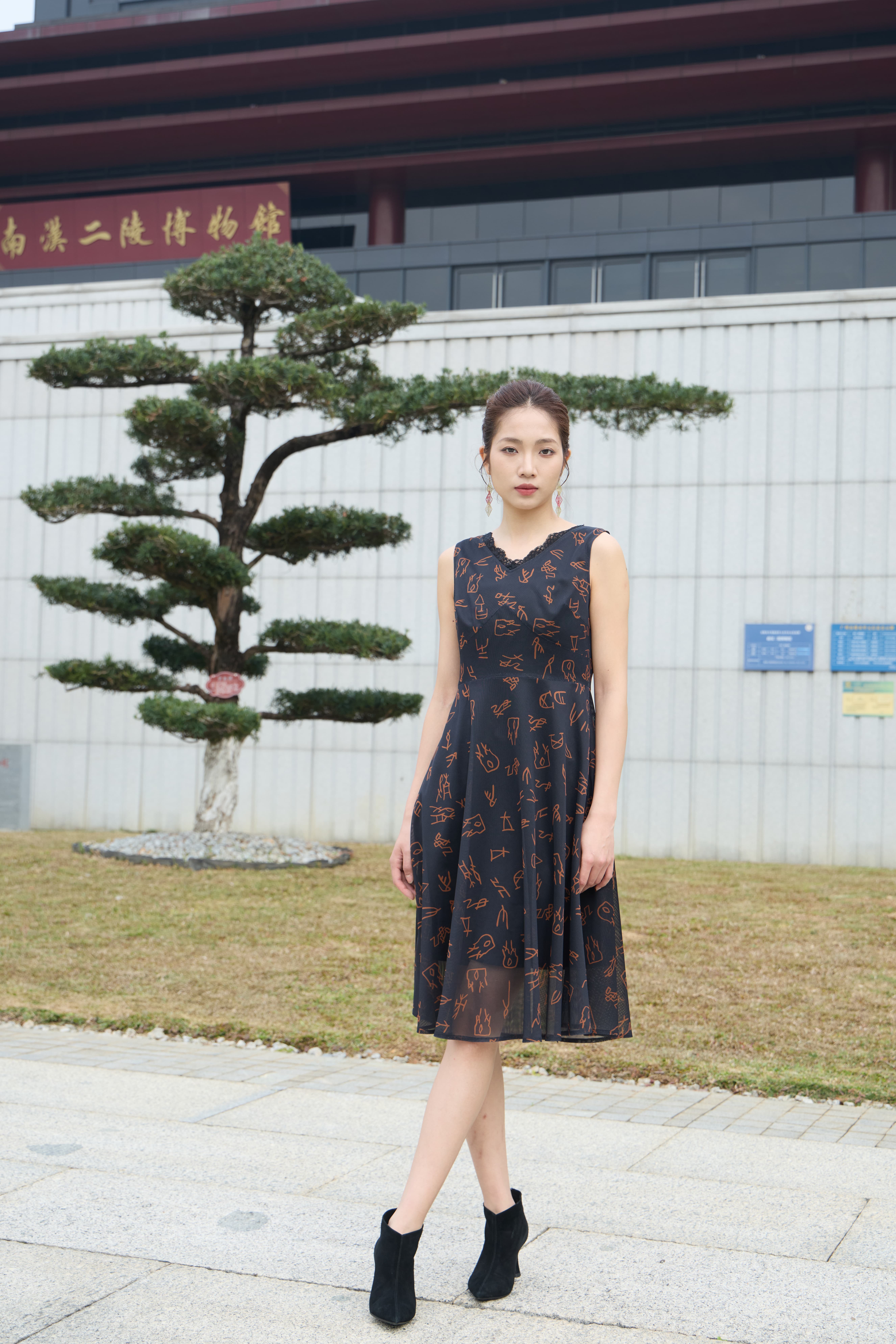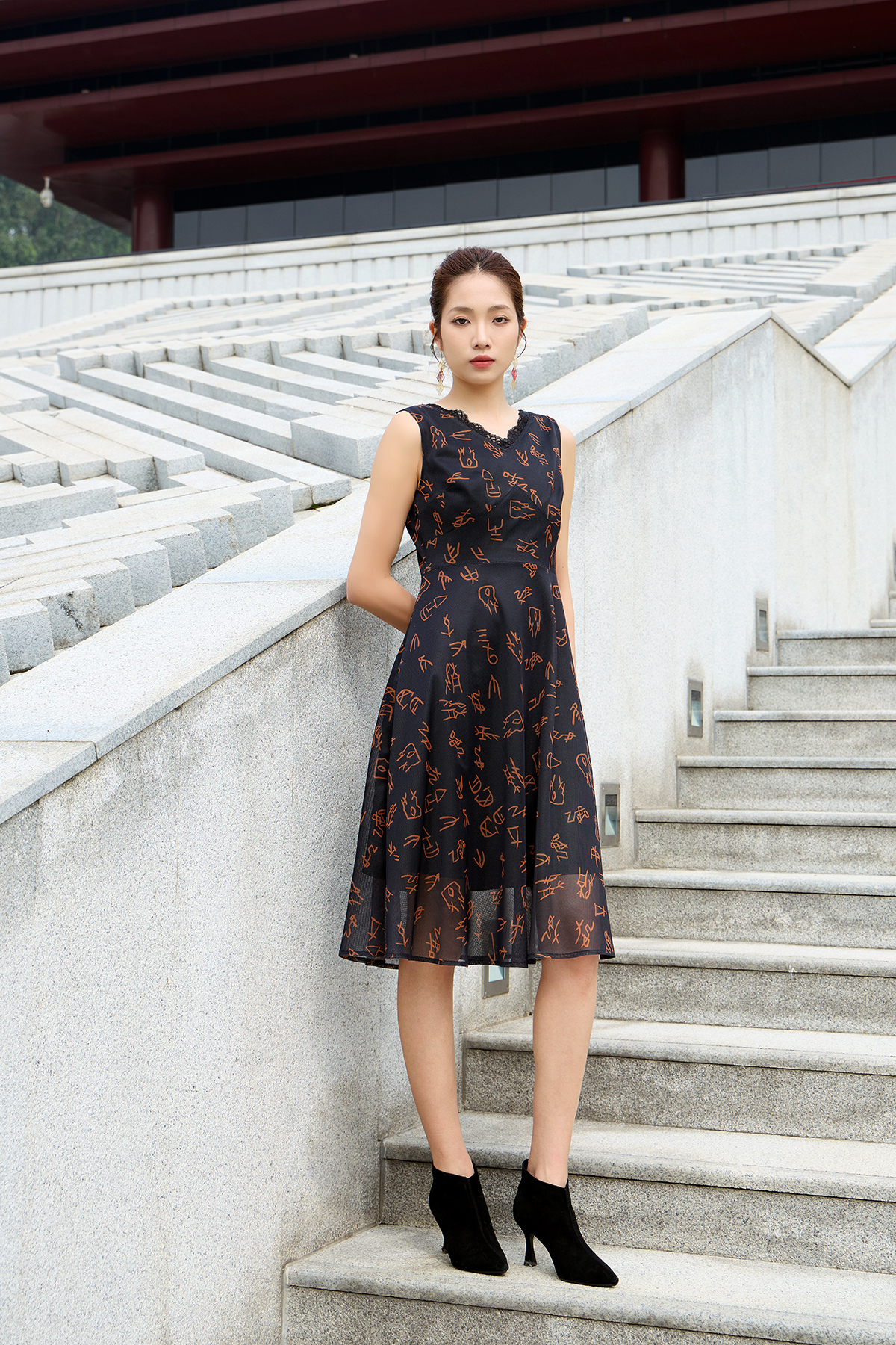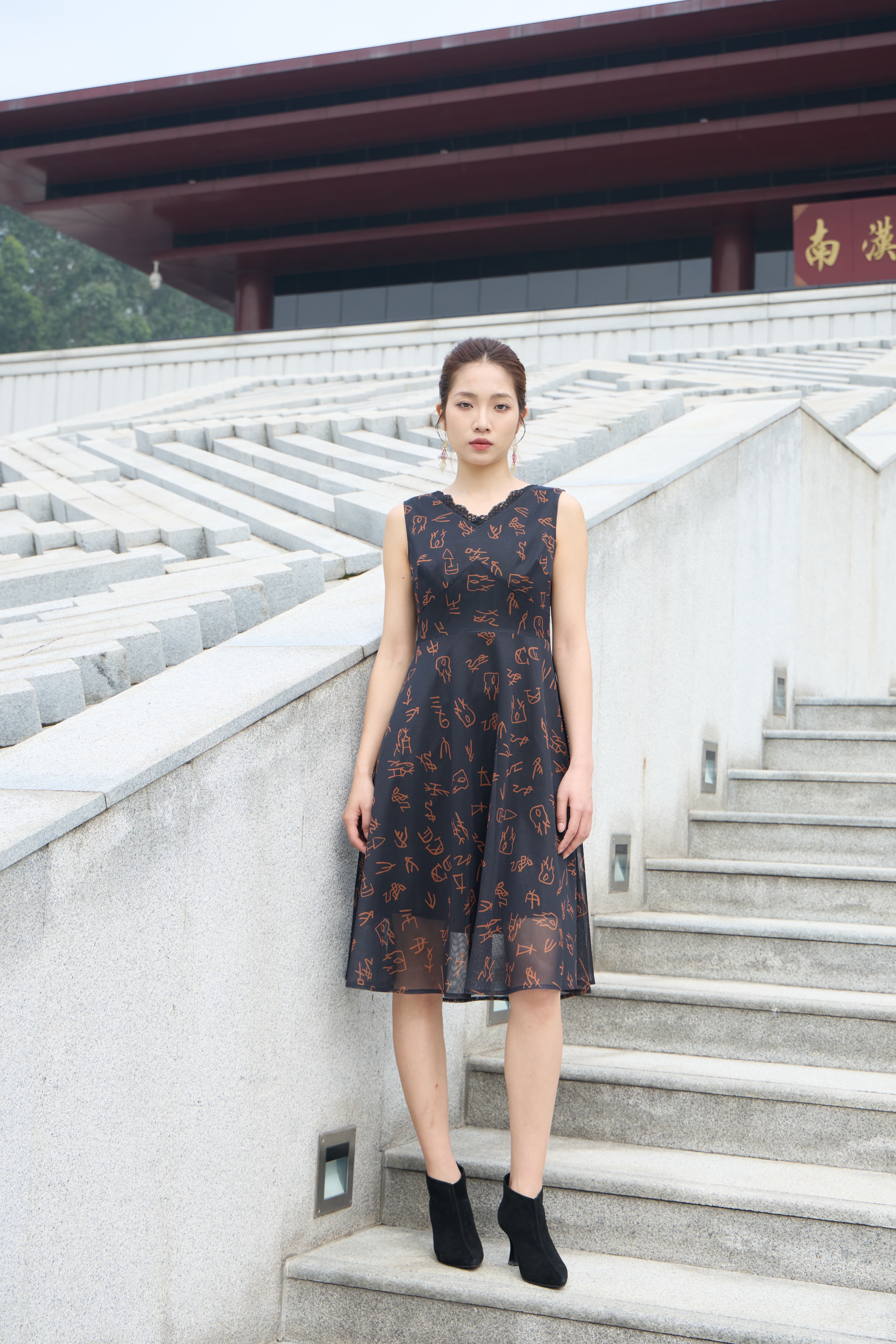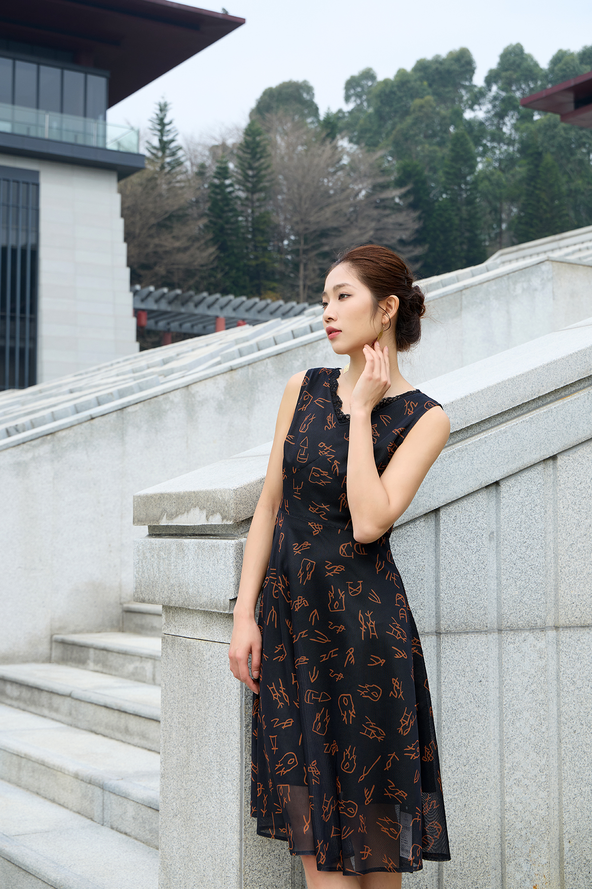 伯妮斯茵 | 新中式文艺 甲骨文印花网格连衣裙 无袖 V 领设计 收腰 A 字大摆 通勤约会款 SZ1S12-漆黑《3000年前的情书》